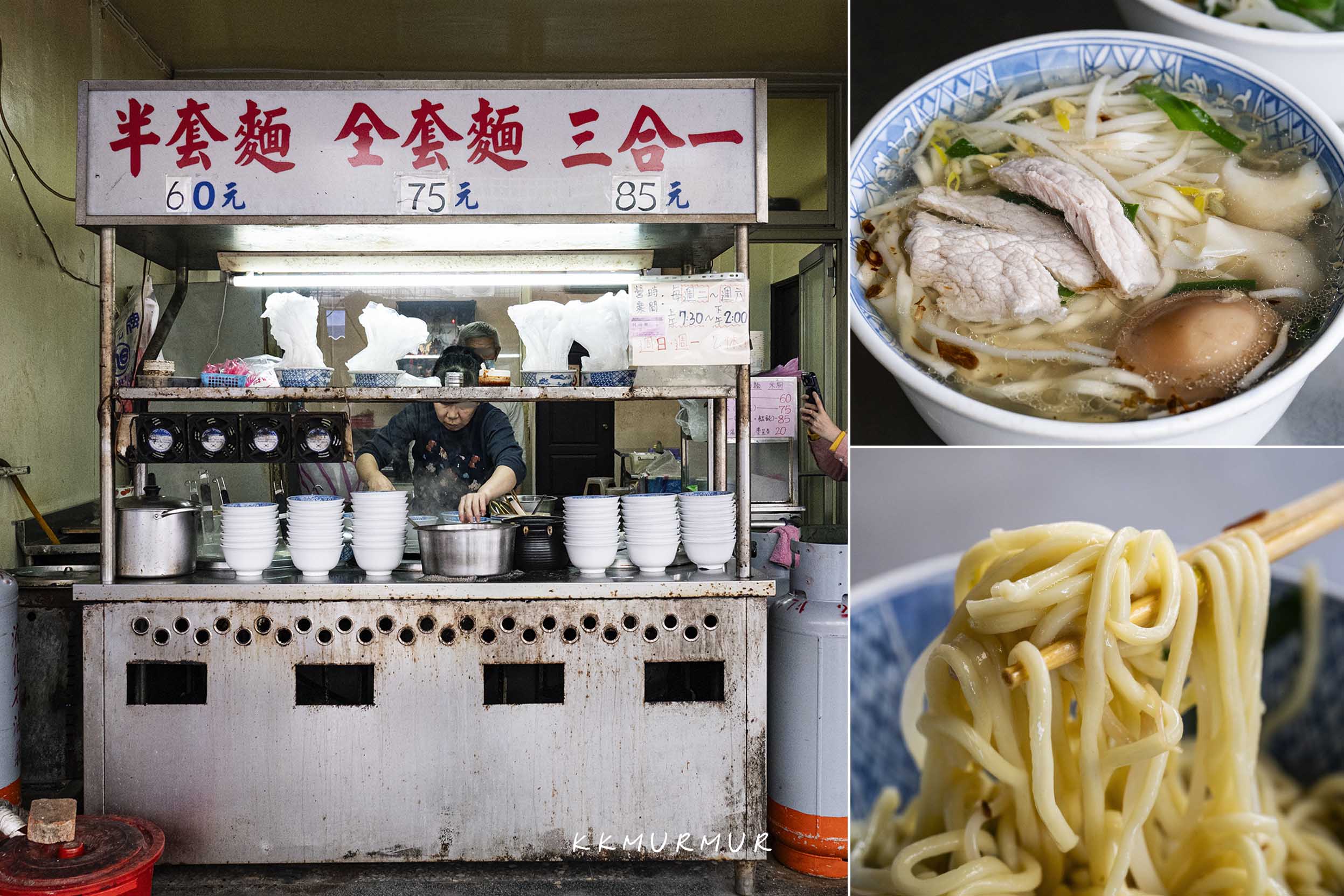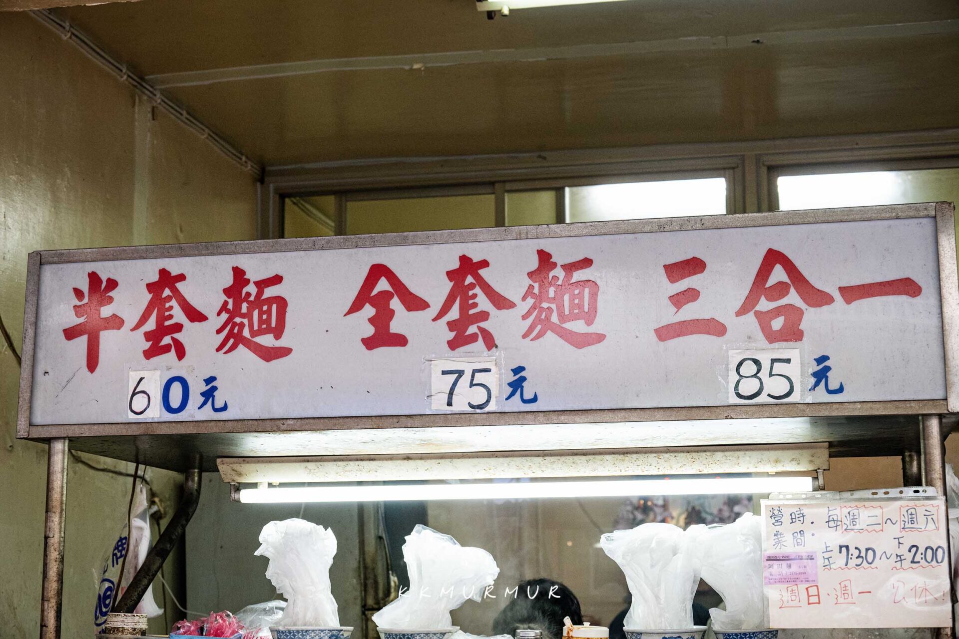 店內的招牌就是古早味陽春麵的「全套/半套/三合一」點法,這巷內的老味道也曾被報章雜誌所報導。