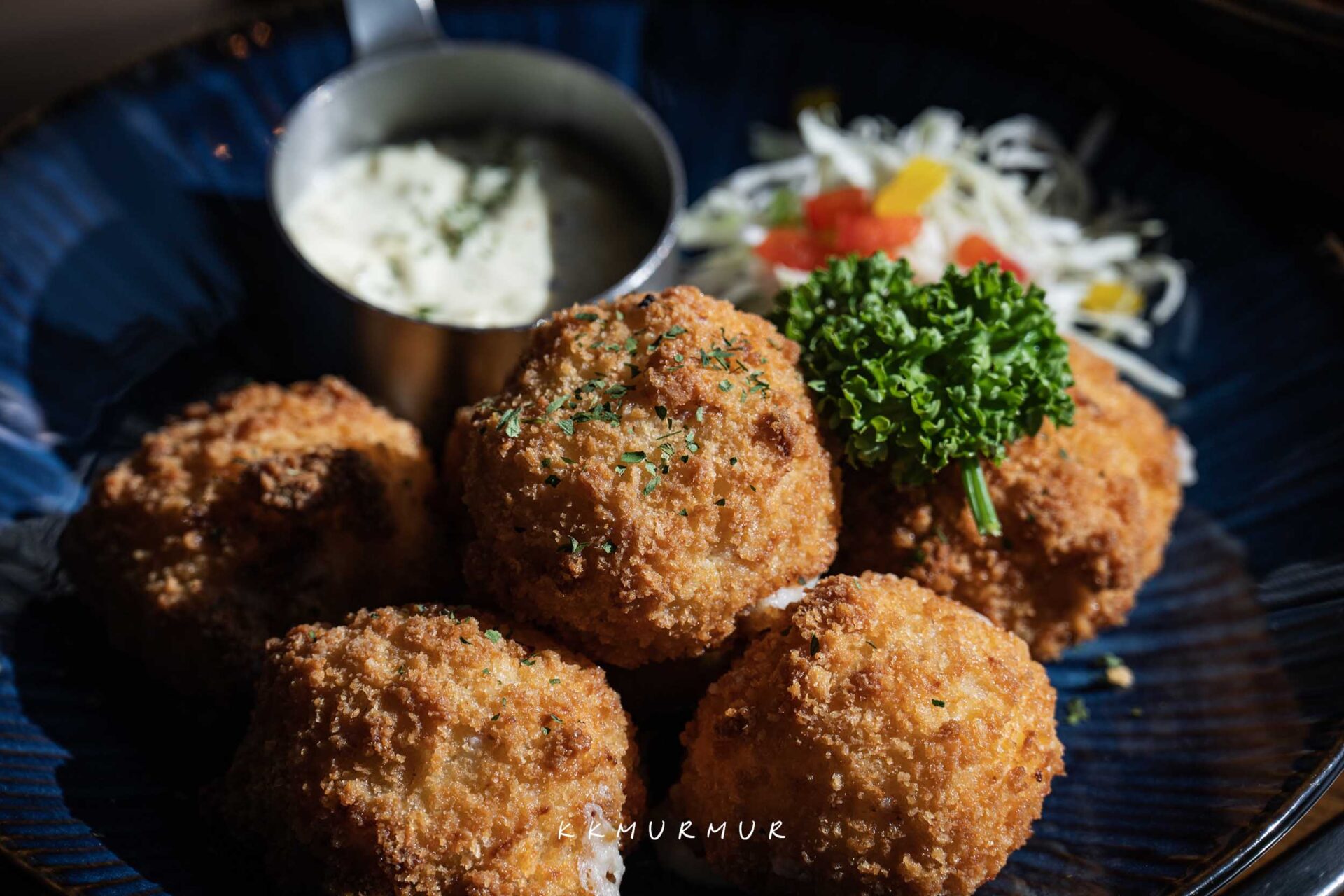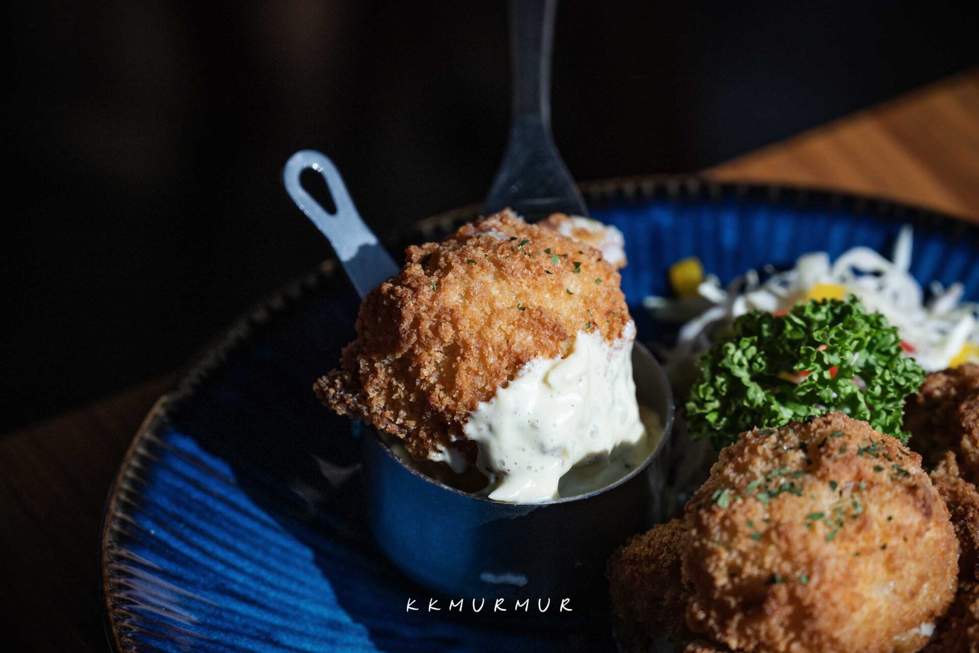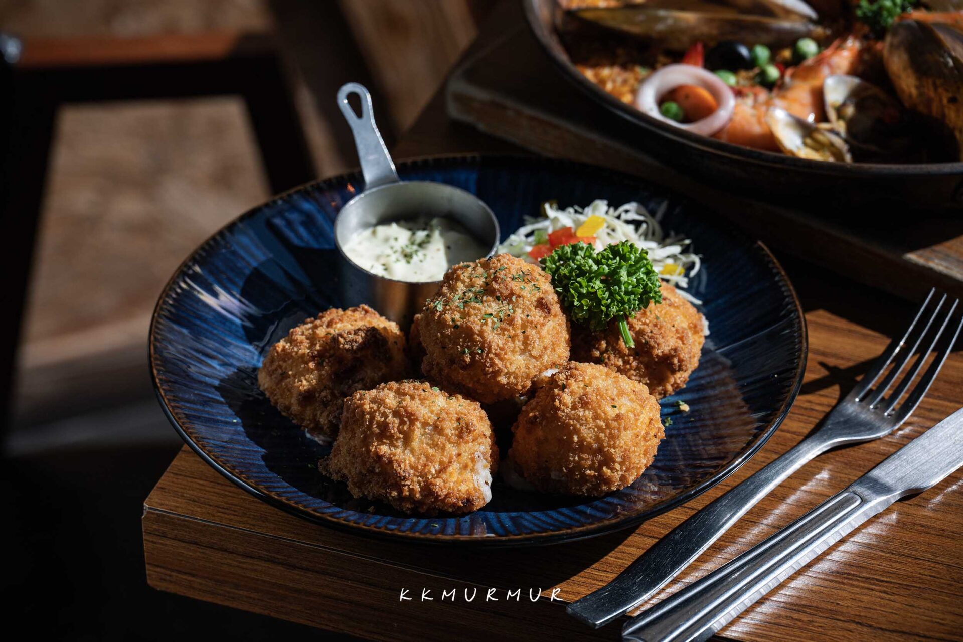 【西班牙式白醬火腿可樂餅】是源自法國可樂餅,後隨著飲食文化的演變,在西班牙發展出當地自己的風格。這吃起來很過癮,外衣炸至金黃酥脆,大口咬下直接在口中爆漿,火腿的鹹香與濃厚的奶油白醬滋味,口味較重一些些,但整個很讓人沉醉又大嘆滿足,沾點塔塔醬一起品嘗更是讓口感更為濕潤、層次感更為提升。