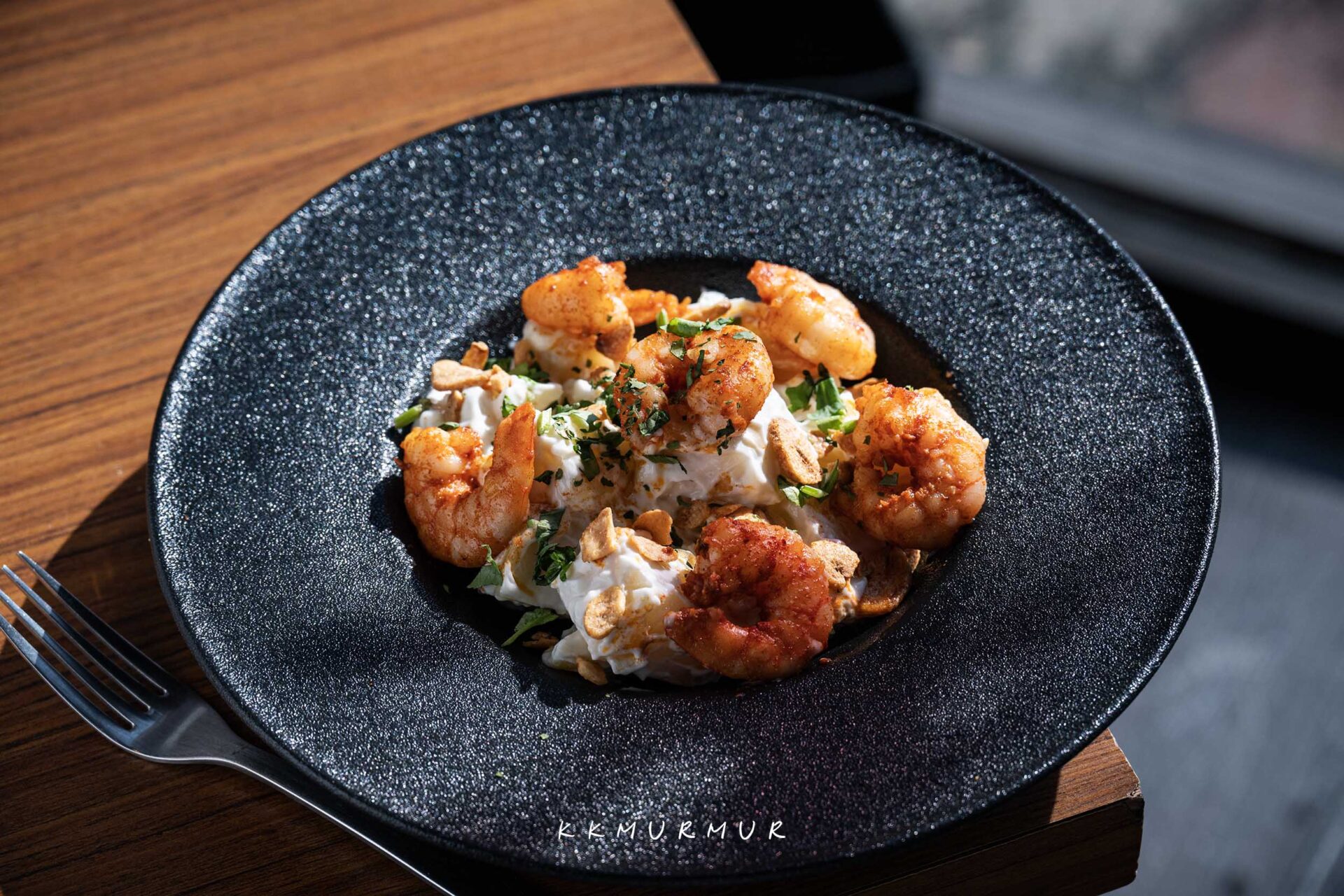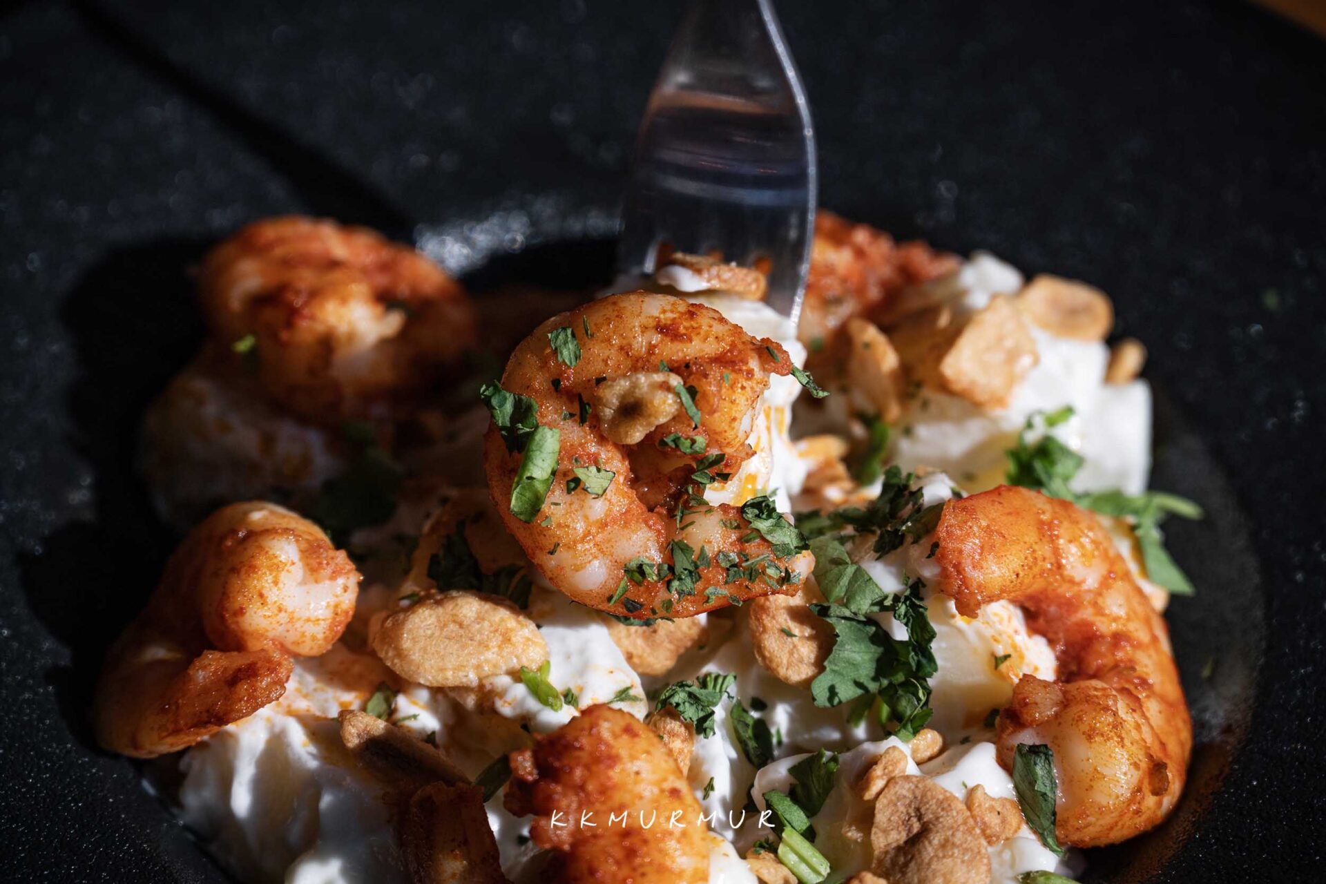 【驢夫風味蒜片鮮蝦馬鈴薯】的蝦仁帶有辛香與適口不過重的蒜香,鹹淡拿捏得宜,吃起來不會感到太過厚重,下方炸過的馬鈴薯也是順口又好吃,搭著醬料一起品嘗,是那種很耐吃、容易讓人停不下來的口味類型。