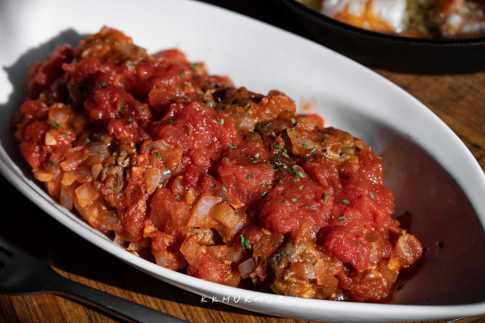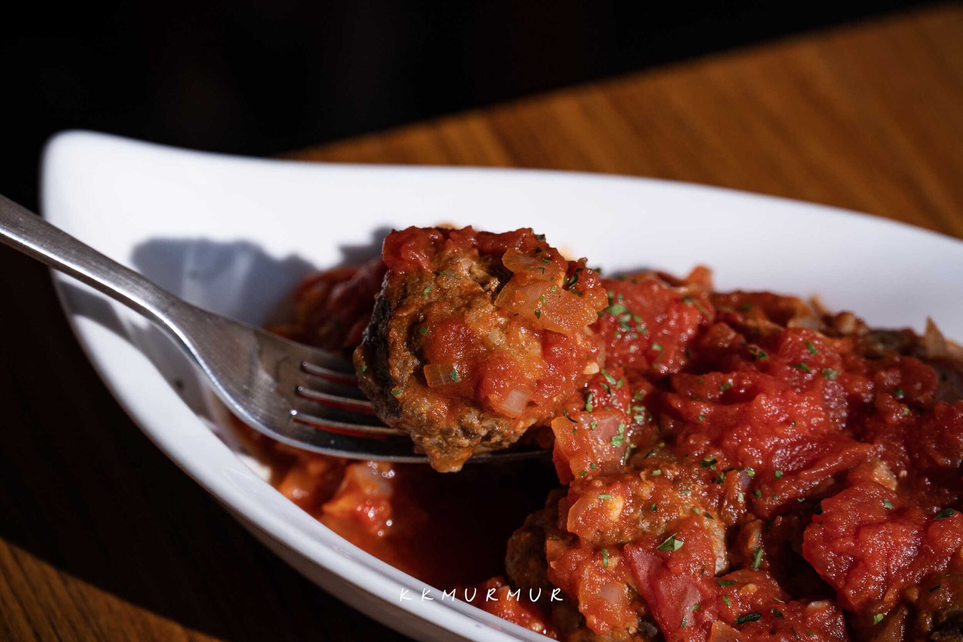 【手工臘腸肉丸佐辣番茄醬】的醬料是以牛番茄紅醬作為基底,搭以多種辛香料來提味而成。肉丸吃起來鹹香帶汁又夠勁,搭上那酸中帶點微辣的醬汁,容易讓人一口接一口的品嘗。