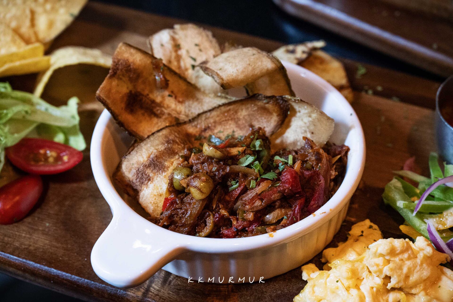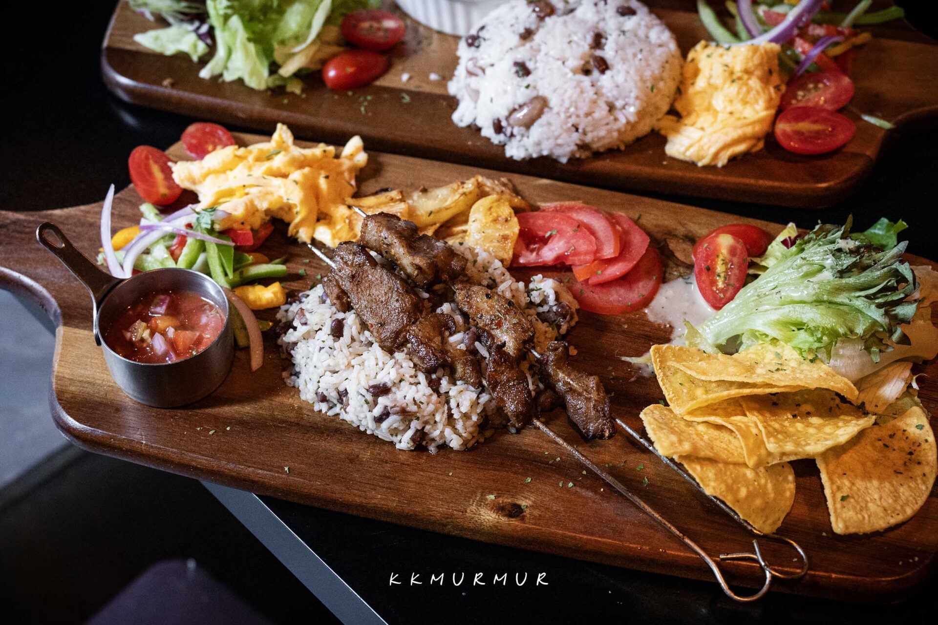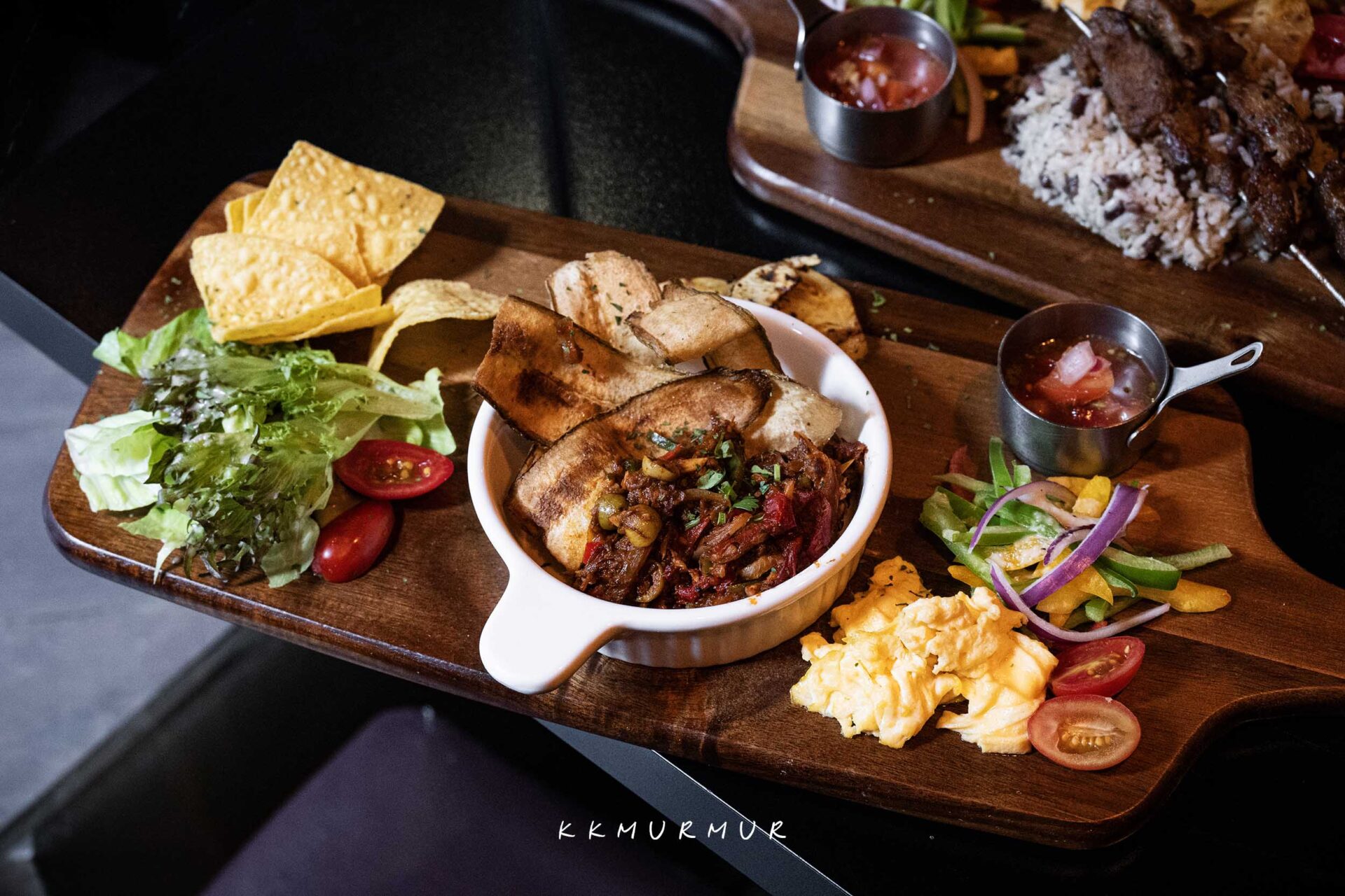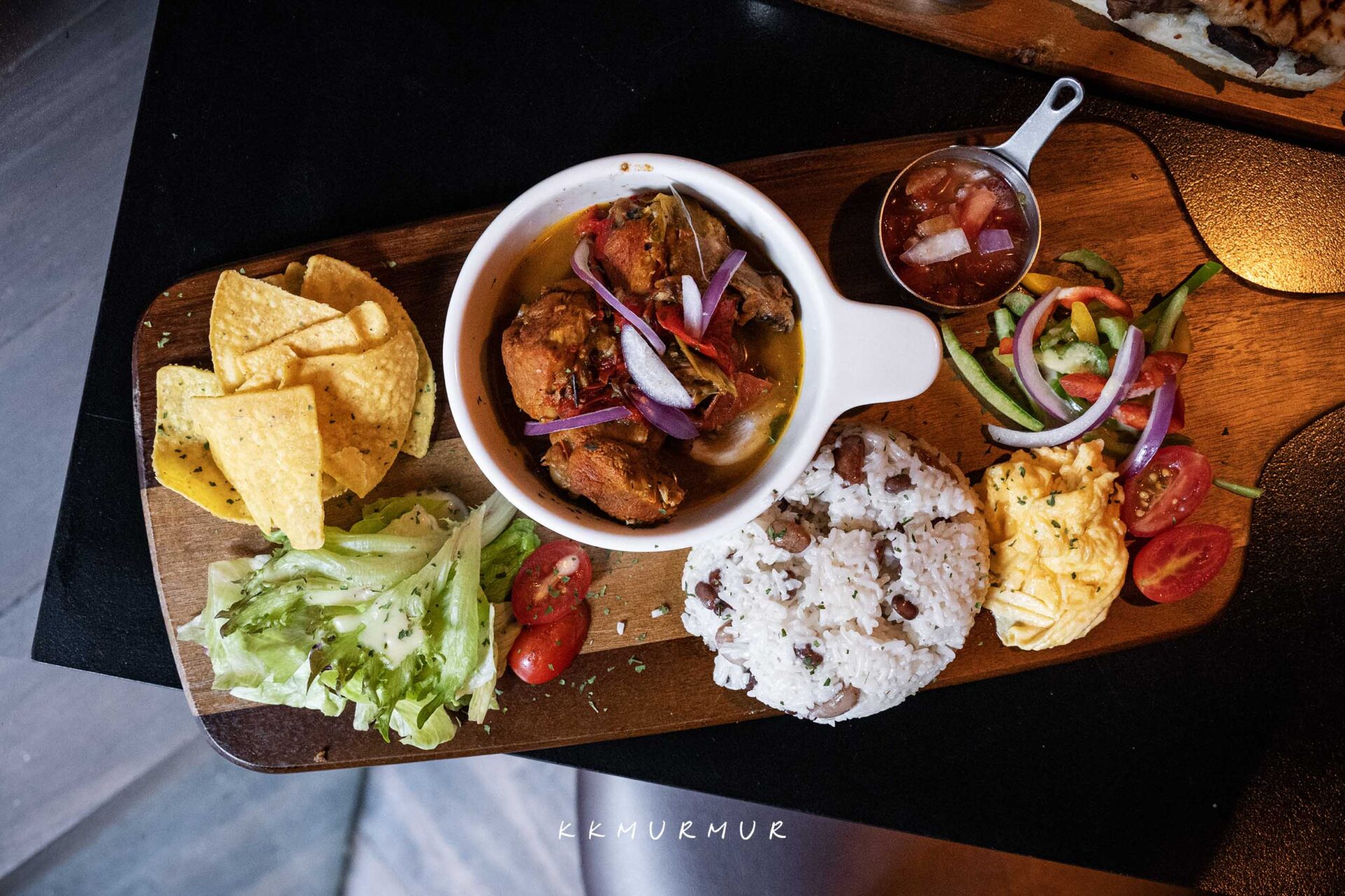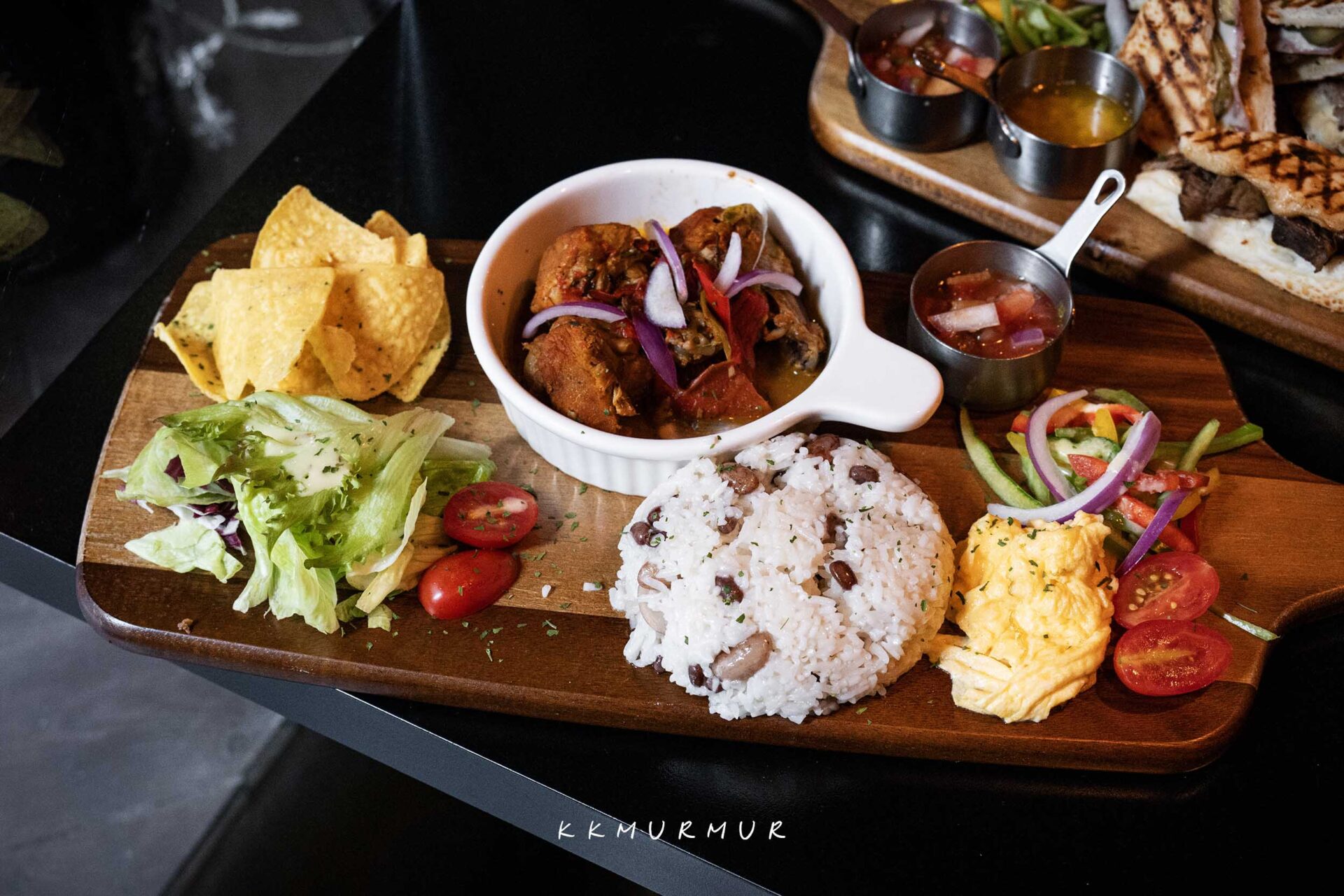 【貝里斯傳統燉雞】是揀選以番茄、甜椒、與各式辛香料,搭著雞肉慢火燉煮,風味上鹹中帶點甜,並有著誘人的辛香滋味,但又不會太過強烈,濃度拿捏得很適口。早午餐的配置上還有香料飯、炒蛋、沙拉與玉米脆片,其中香料飯我覺得滿特別的,加入了紅豆與花豆,吃起來意外的很和諧,整體的感受豐盛又好吃。