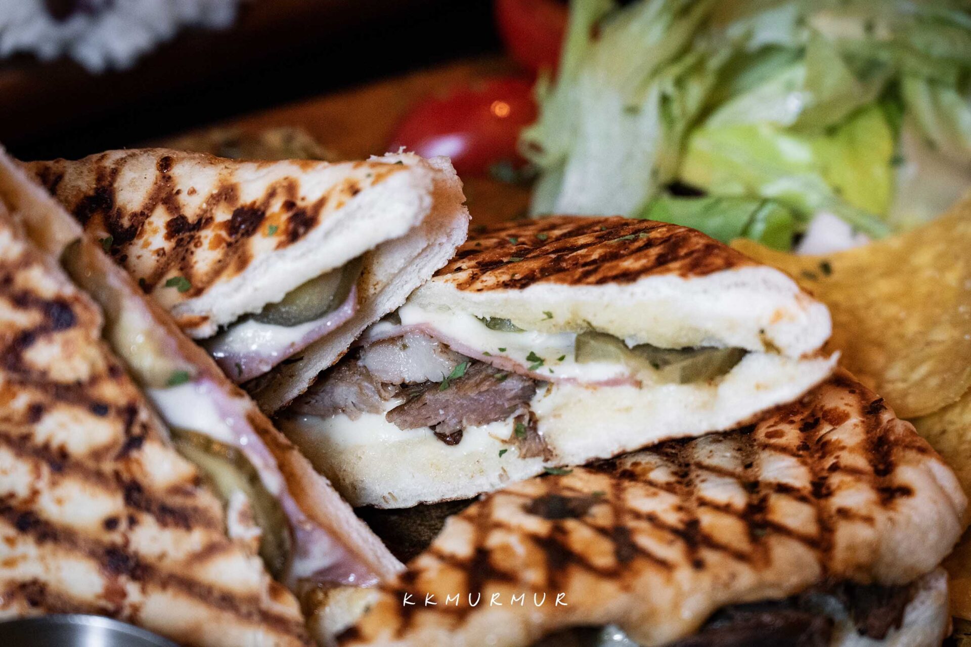【經典原味三明治】的外層烤至酥脆並帶點誘人金黃,內餡夾入了豬肉、起司與酸黃瓜,麵包本身外皮脆口、內裡軟嫩中並散發著適口麵香,大口咬下感受那多層次的風味與快感,外加份量也很龐大,讓人吃得很過癮啊!