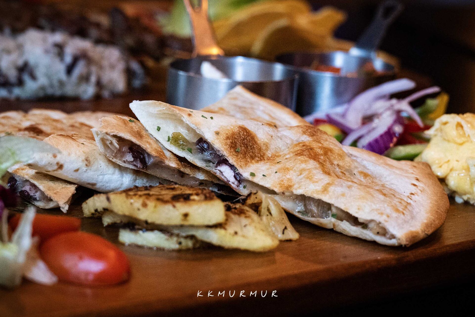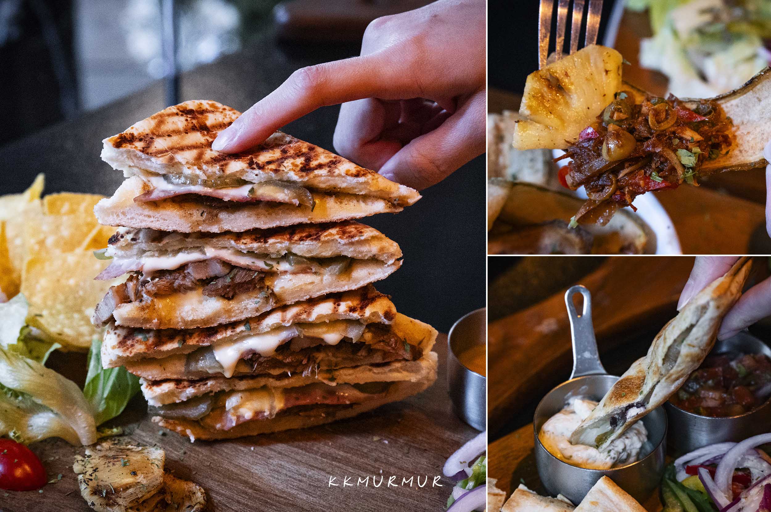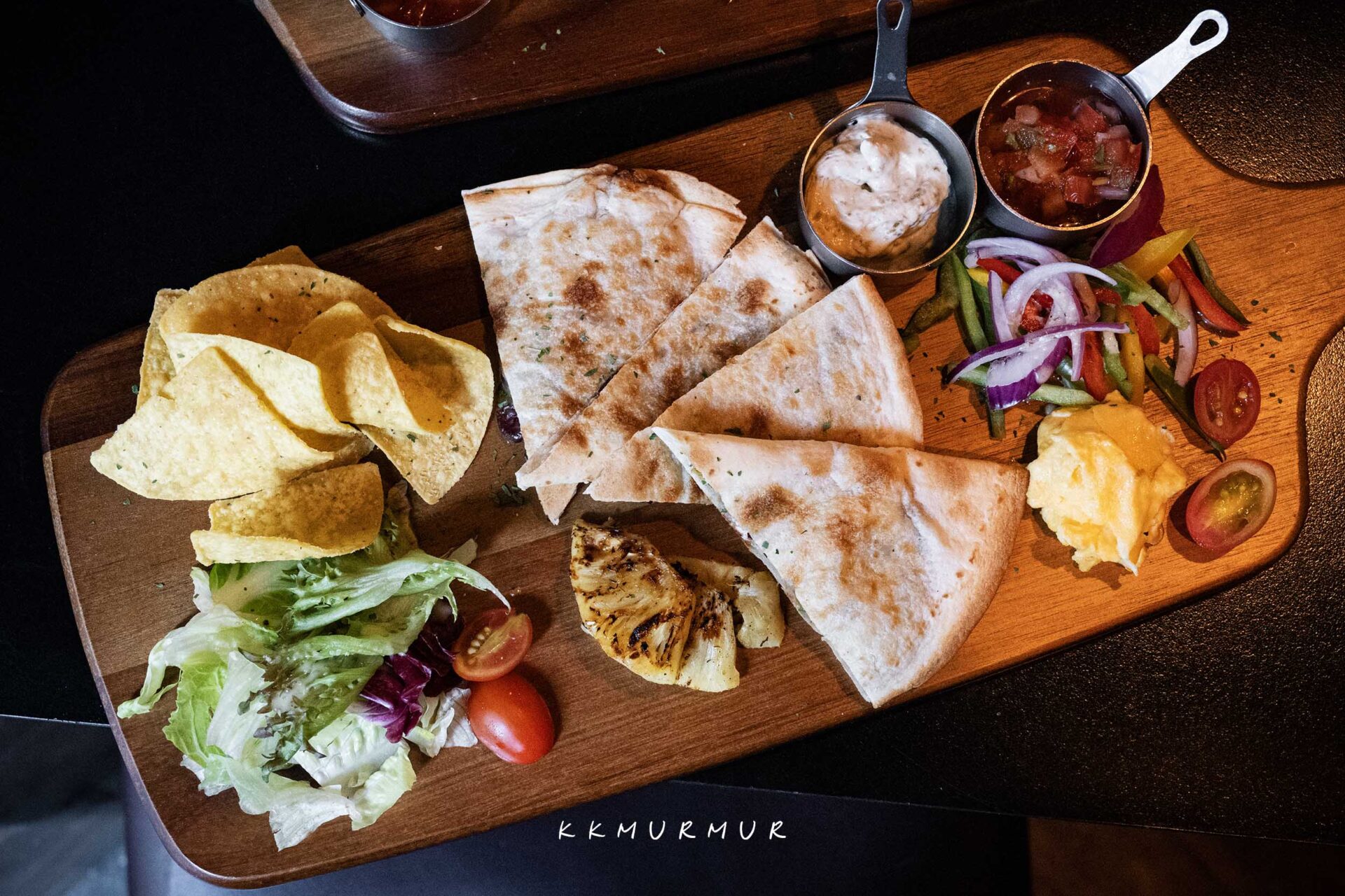 【雞肉豆泥卡莎蒂亞】包入了雞肉與豆泥,餅皮外衣烤至金黃酥脆並帶點微微焦香,雞肉內餡軟嫩而不柴口,豆泥質地柔順、風味溫潤爽口,單獨品嘗就很不錯,但建議可以搭配附上的酸奶醬,整體的層次體驗會更加提升,同時也賦予餐點不錯的濕潤度與口感!