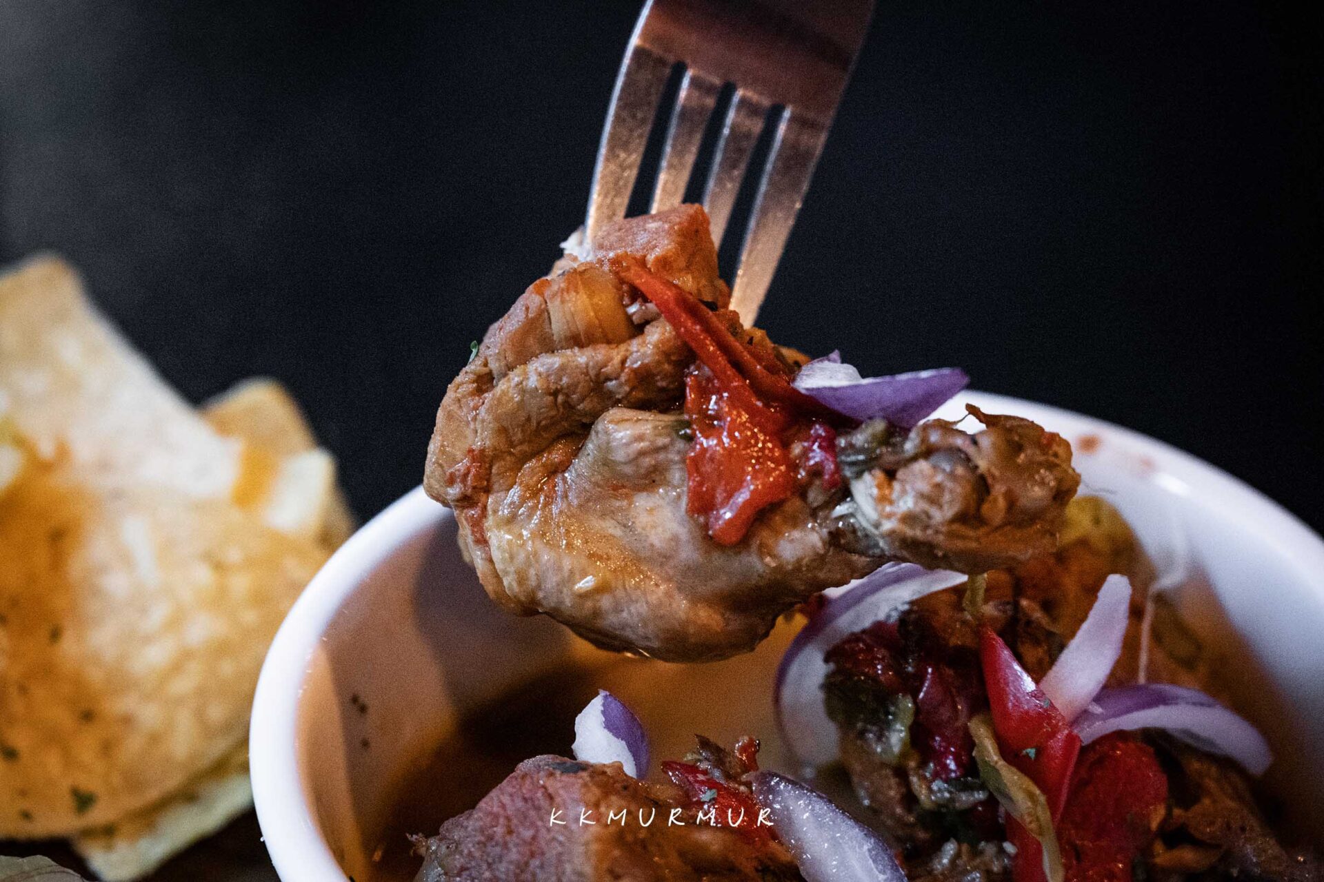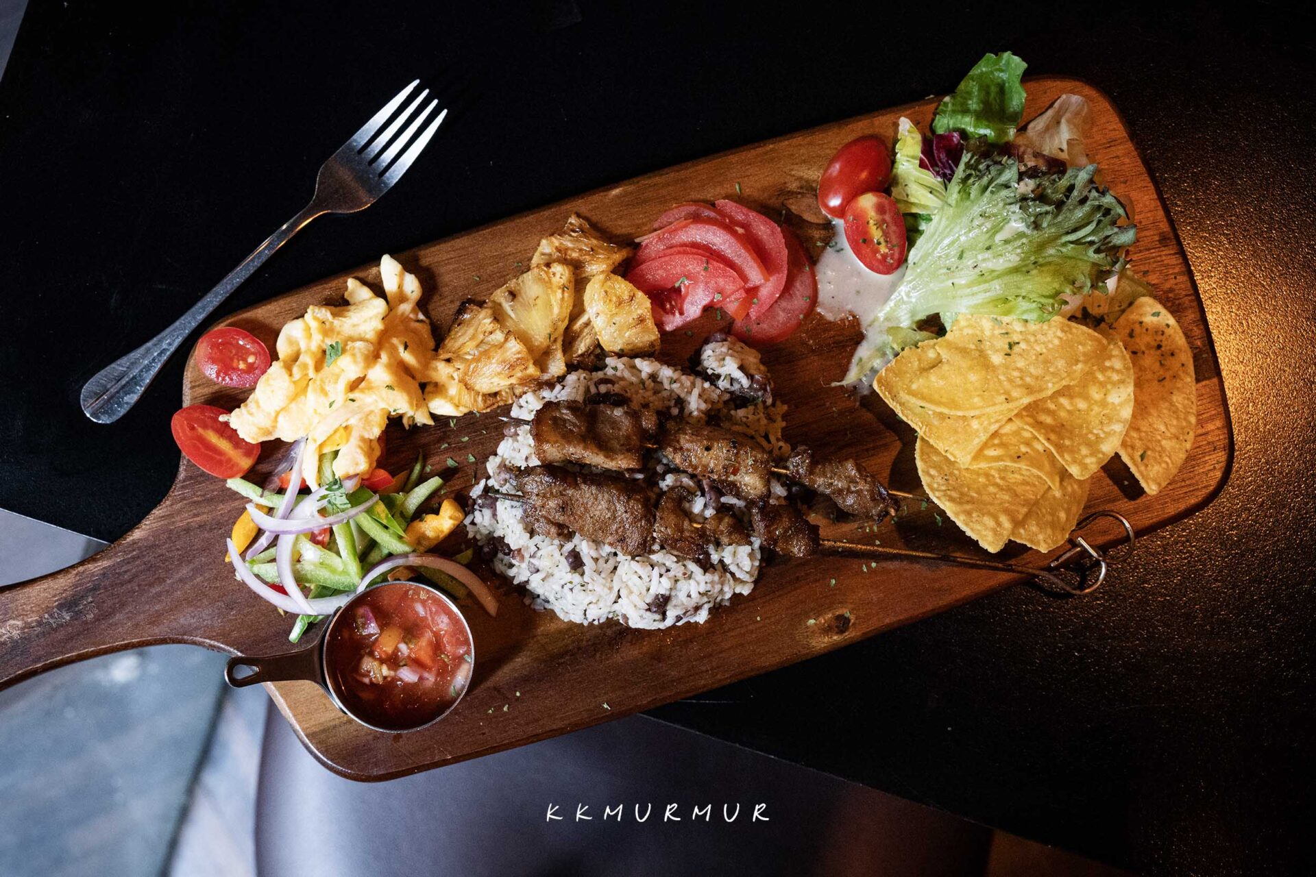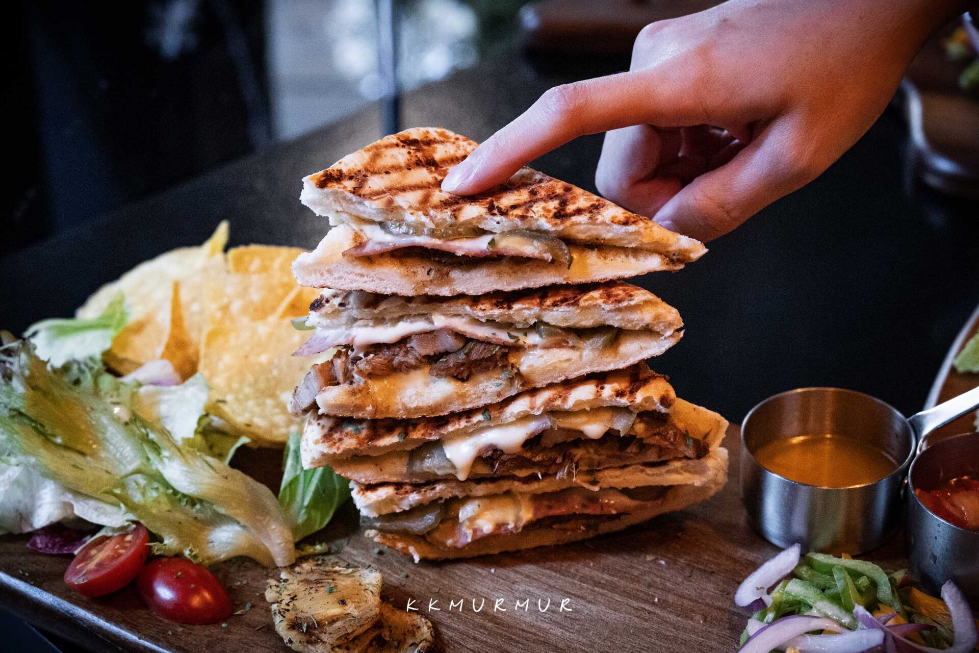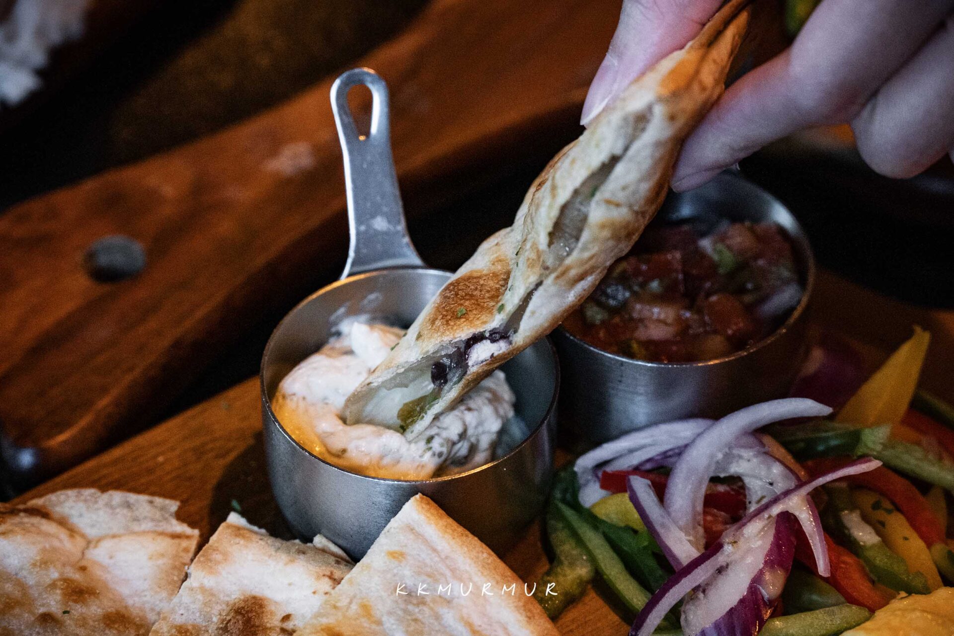 【雞肉豆泥卡莎蒂亞】包入了雞肉與豆泥,餅皮外衣烤至金黃酥脆並帶點微微焦香,雞肉內餡軟嫩而不柴口,豆泥質地柔順、風味溫潤爽口,單獨品嘗就很不錯,但建議可以搭配附上的酸奶醬,整體的層次體驗會更加提升,同時也賦予餐點不錯的濕潤度與口感!