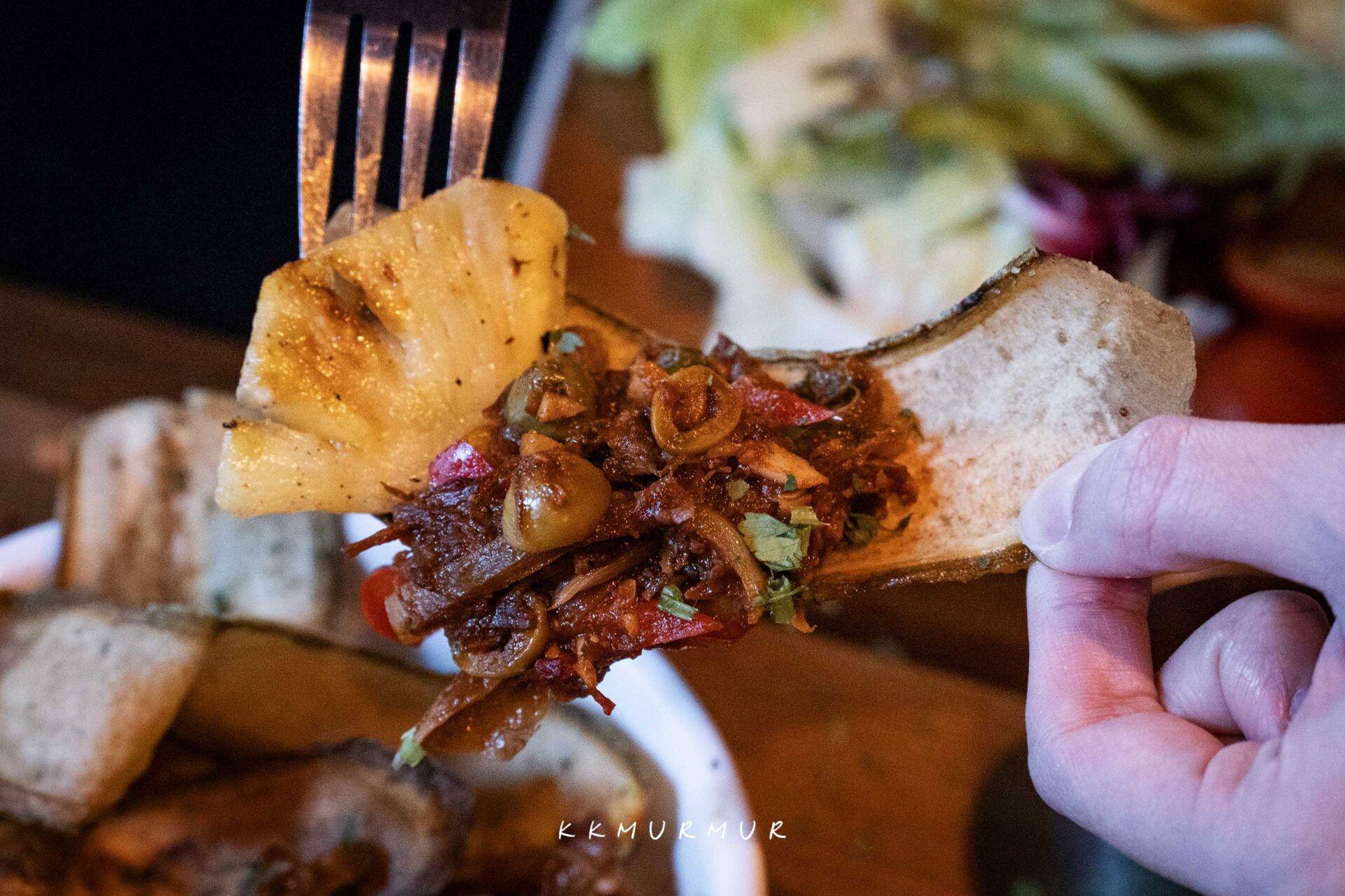 【古巴破布牛肉】是古巴著名的國菜料理,費時費工將牛肉處理成細絲狀,搭以洋蔥、彩椒與多種蔬菜一起慢火燉煮,口味上有著鮮明的特色與記憶點,層次體驗豐厚,除了能感受到牛肉的鮮美醇郁外,也能品嘗到食材的鮮甜,是我本次體驗最喜歡的一品料理。另外有附上炸香蕉片,可以搭配一起享用,出乎意料的很合拍,好吃!