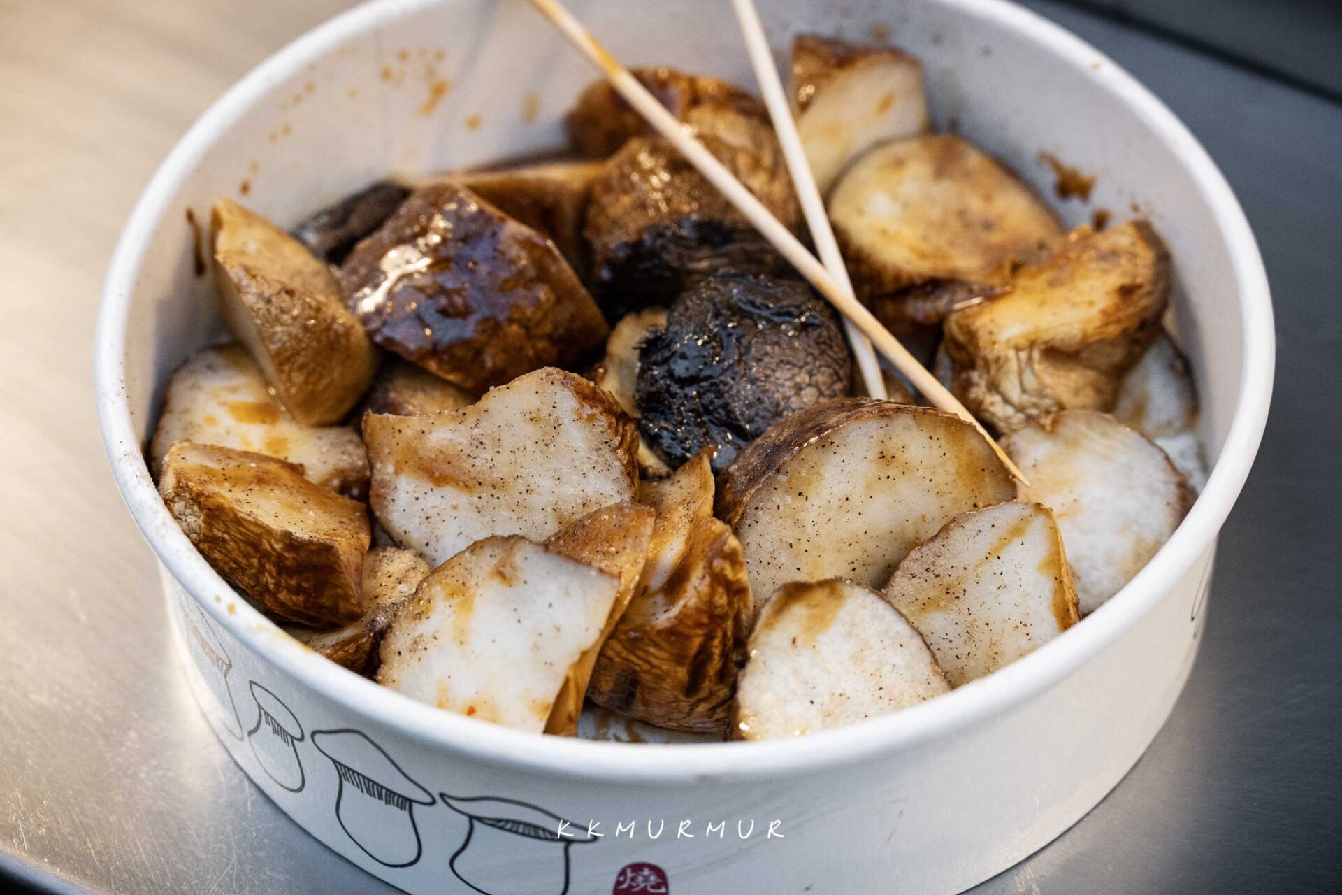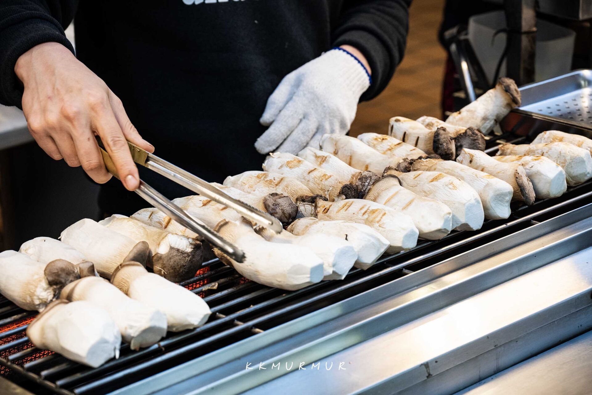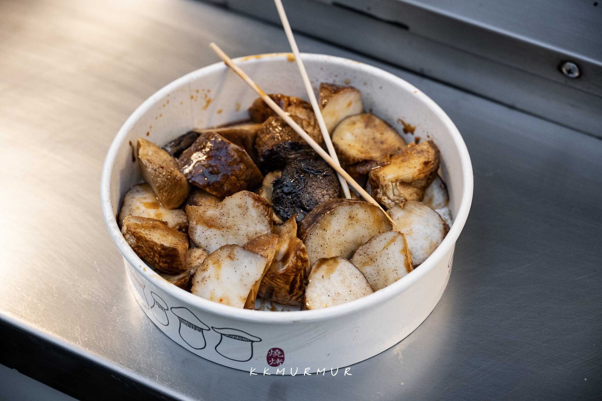 【燒烤杏鮑菇】下午四點半開始營業,我們是平日剛開門時到訪,一開始人潮不太多,點餐後大約5分鐘即拿到餐點,但之後沒多久就開始人潮湧入、大排長龍,不乏觀光客與一些在地人,平均等餐時間大約10-15分鐘,排隊的消化速度比想像中快上一些。