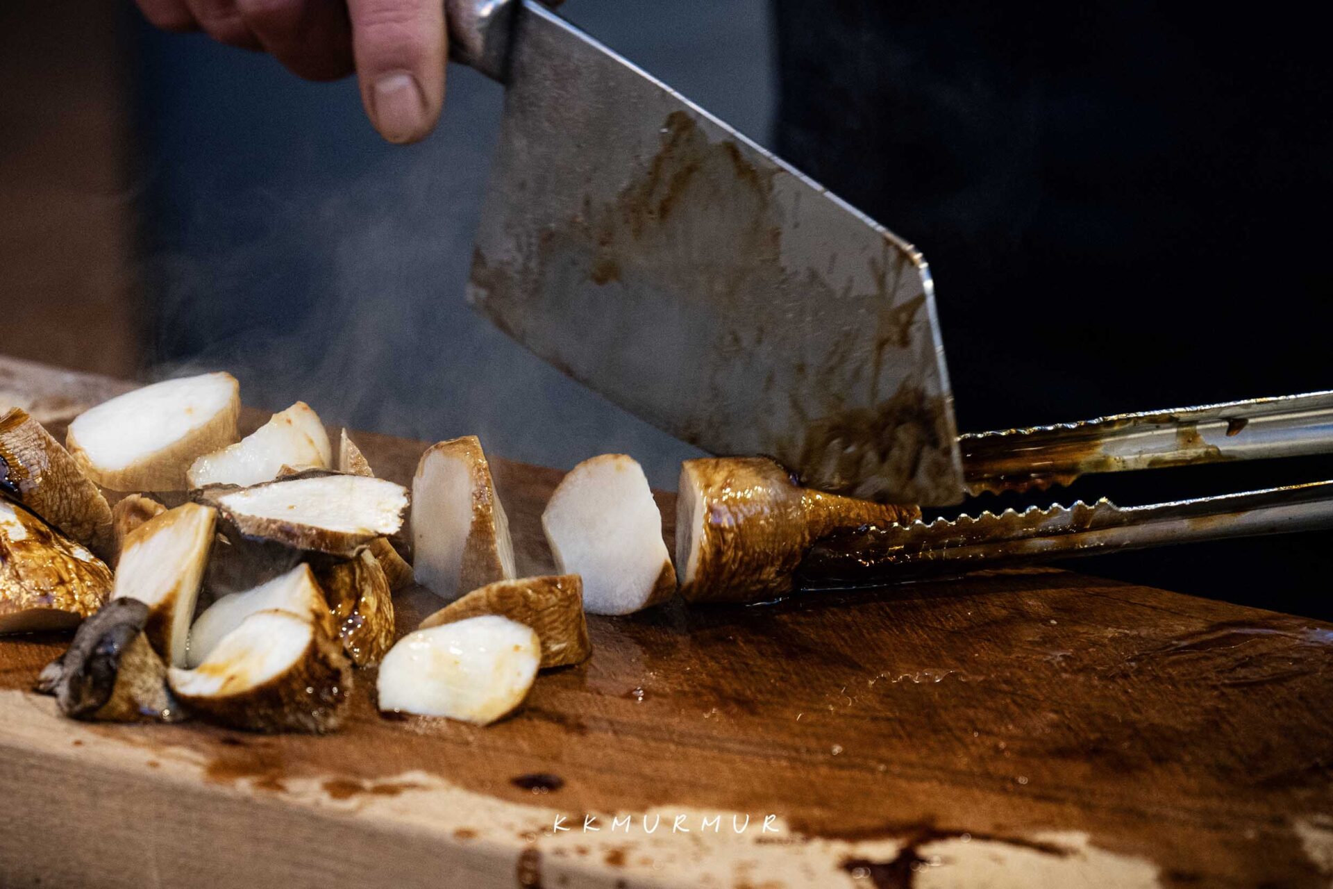 老闆負責將杏鮑菇切塊、刷醬、灑粉/淋醬,另外有夥伴負責顧火翻烤,彼此分工明確流暢。另外特別要提一下老闆切杏鮑菇時的快手技法,手起刀落的超級俐落,莫名其妙的會想一直看老闆切切切,哈哈!