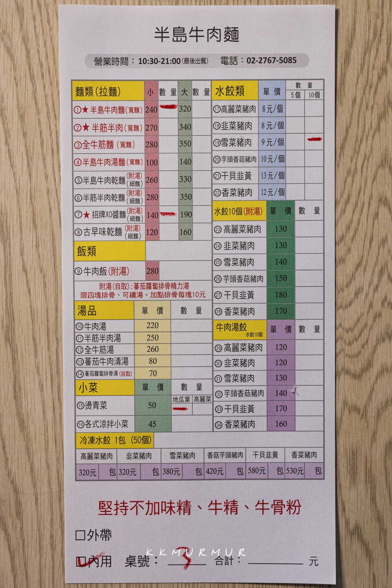 【半島牛肉麵】的菜單如上,主打招牌的半島牛肉麵,也有一些如乾麵、湯品、水餃的品項可以挑選,水餃口味滿多的,也有一些特色內餡,建議除了招牌的牛肉麵外,也可以點一份水餃來品嘗看看,若是偏好乾麵的客人,招牌XO乾麵也是很多人推薦的口味!