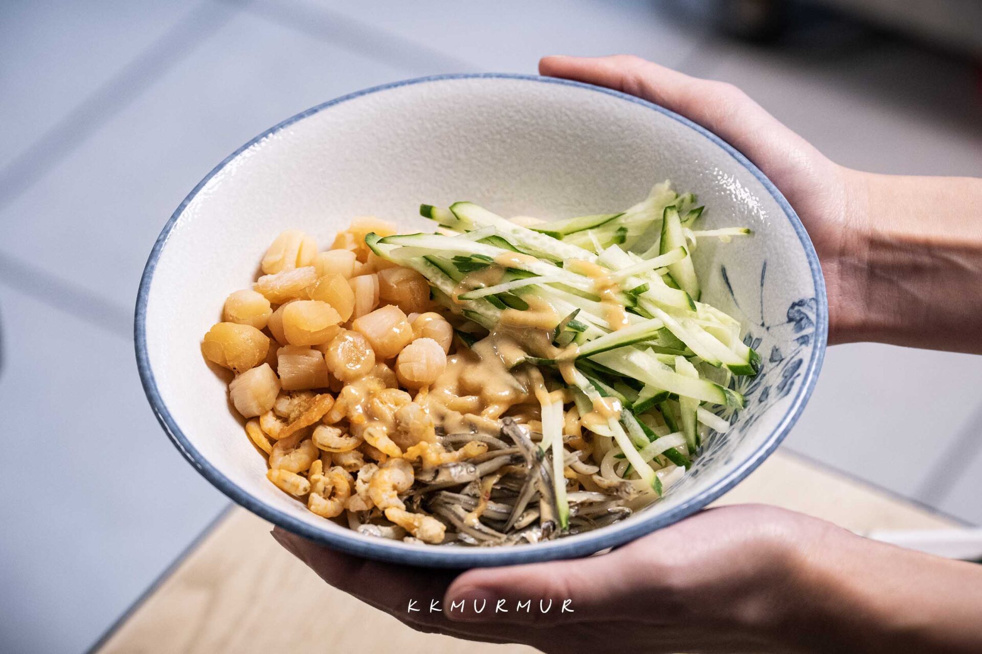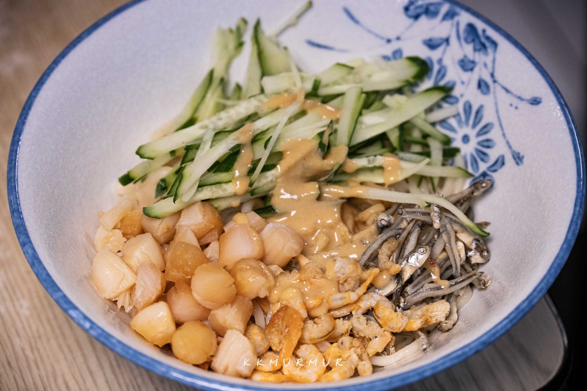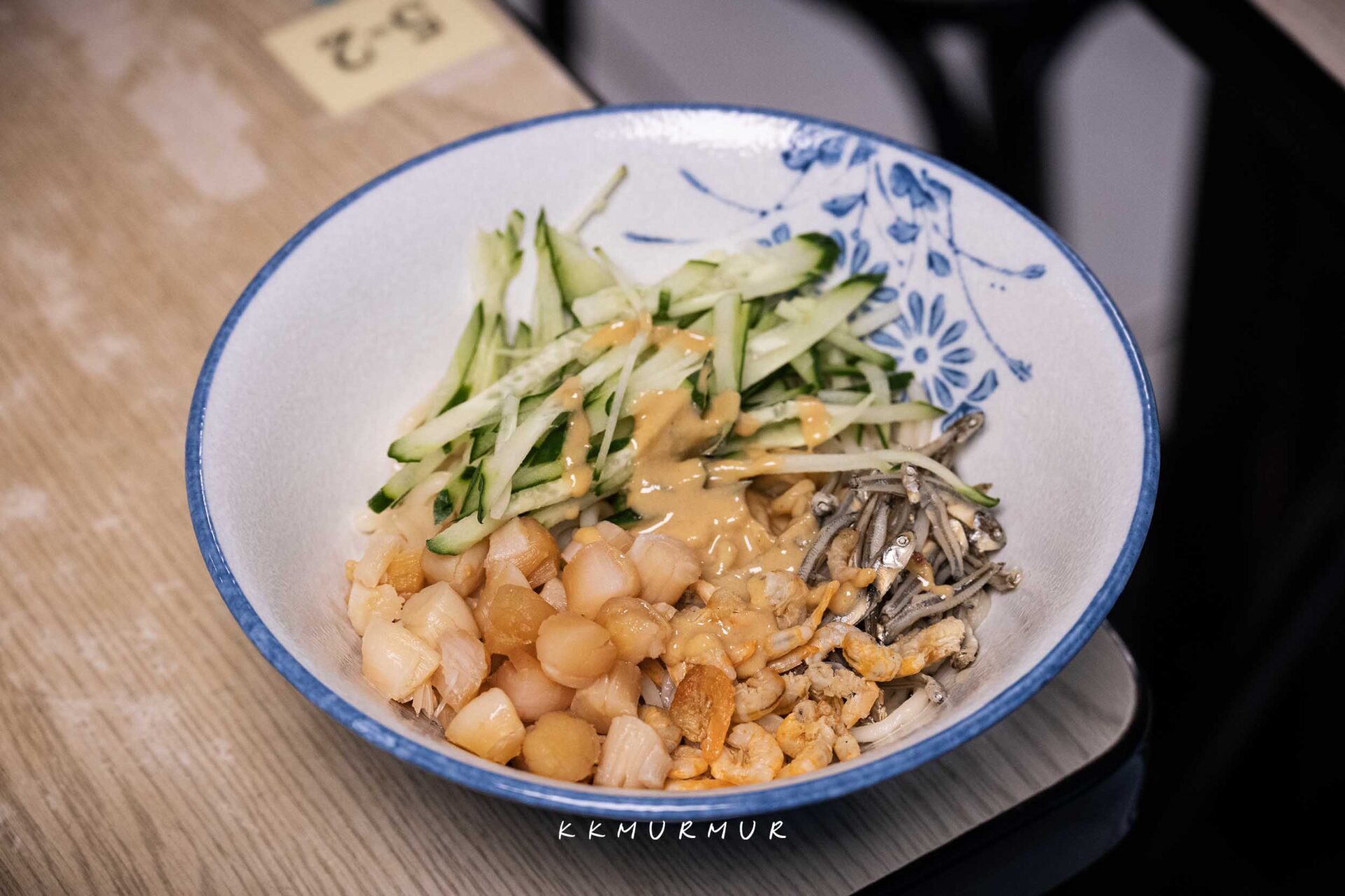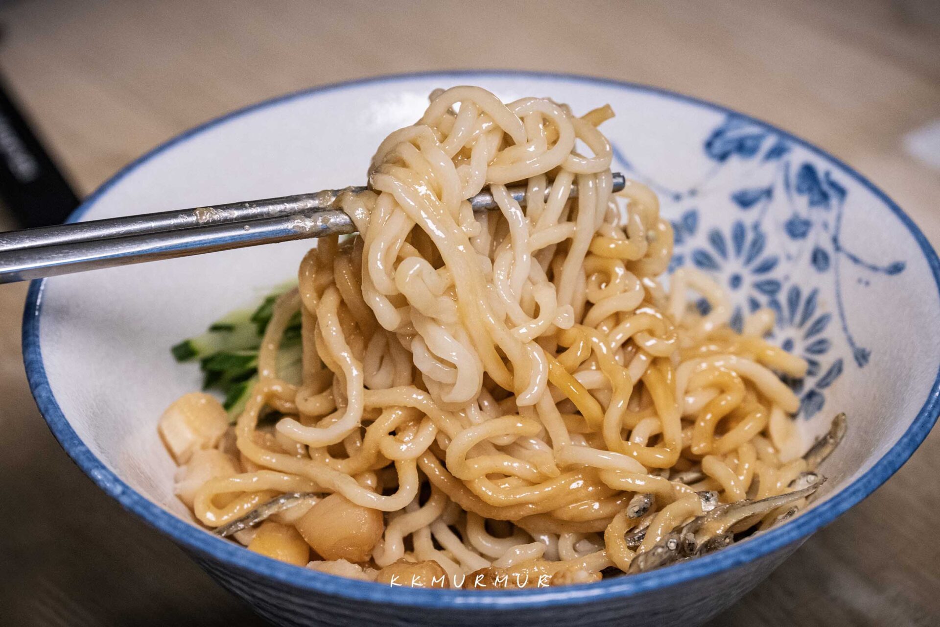 【招牌XO醬麵】意外的也是深得我心,看著那上面滿滿的小干貝,感覺就是十足的鮮美,佐料還有小魚乾、小黃瓜、蝦米與類似麻醬的醬料,麵體的配置是搭配手工拉麵(細麵)。