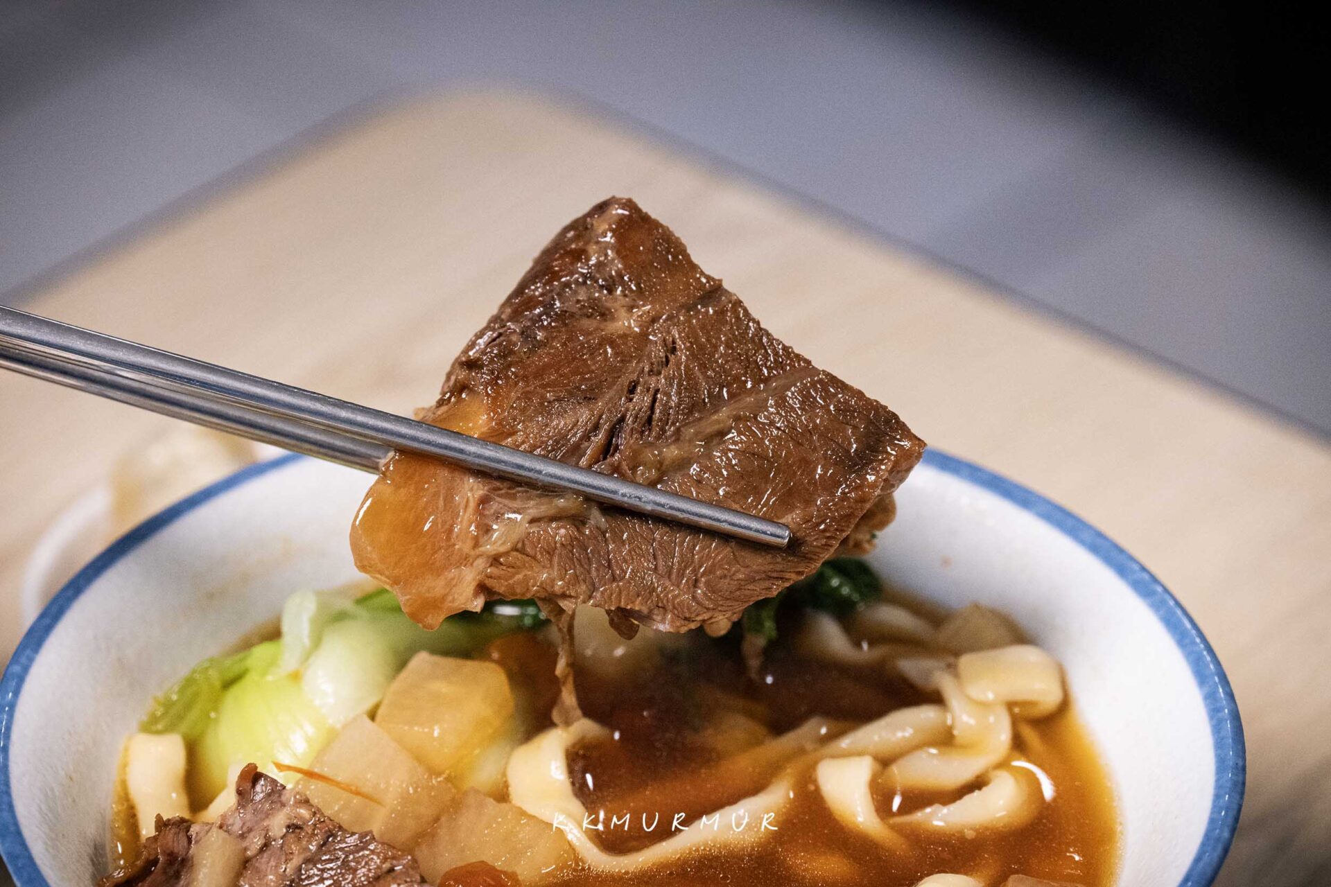牛肉是選用牛腱部位,橫切面的厚度相當厚實,這種厚度的牛肉其實不太好處理,原以為會需要費些力道才能咀嚼,結果入口輕輕一咬就能順勢化開,有著極佳的軟嫩度,燉煮的火候顯然相當到位,但又不會太過軟爛而導致缺乏肉感,仍保有著大口吃肉的爽快與豪邁感,調味部分也很不錯,鹹香入味不失層次感,整體來說這肉很可以啊,不愧是得過冠軍的牛肉麵!