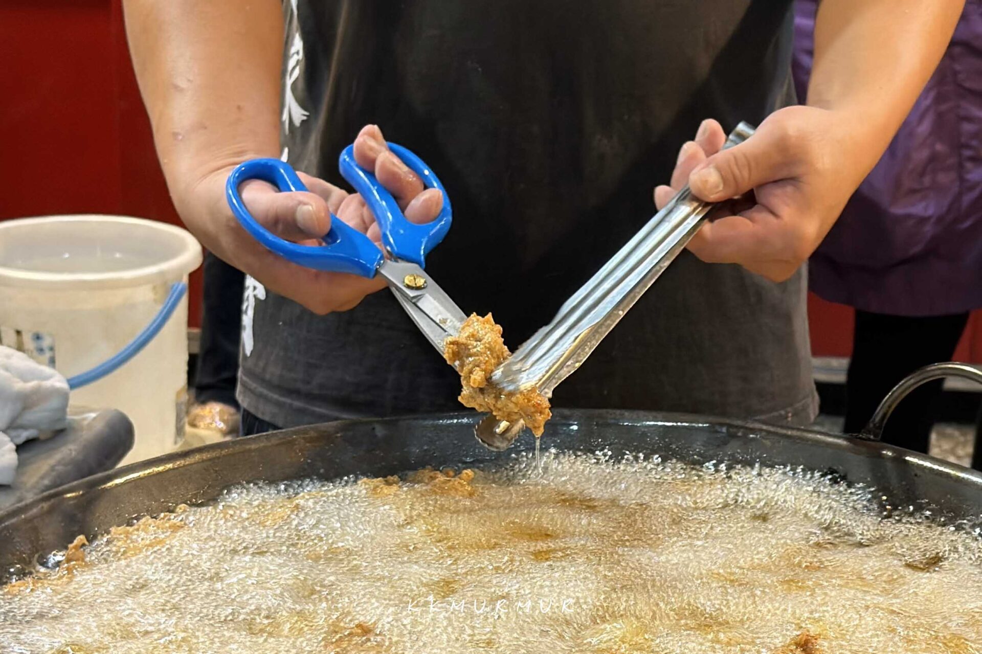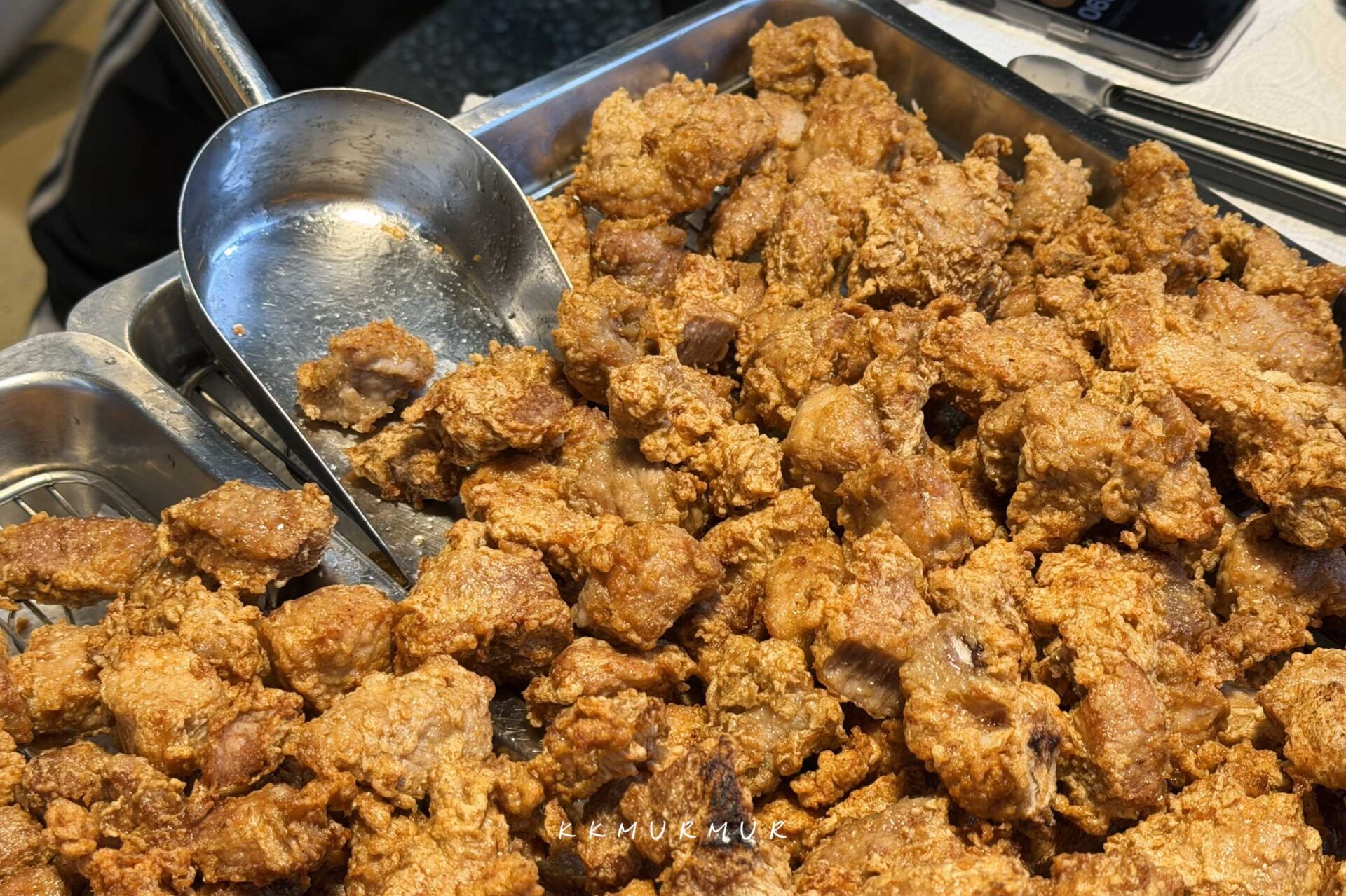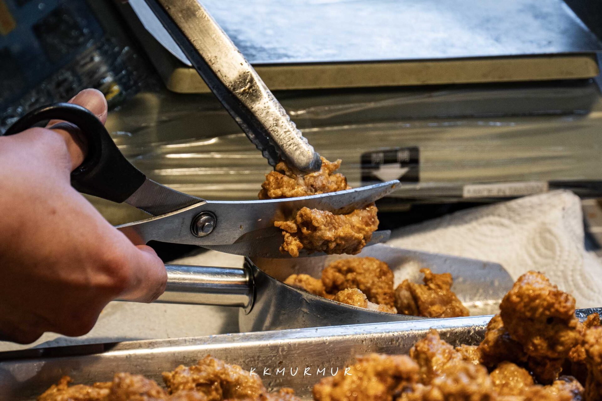 服務人員俐落的在製作著排骨酥,油香逼人、視覺跟嗅覺都很讓人飢餓。老闆在油炸排骨酥的過程,會把部分排骨酥剪半再回炸,以讓受熱更加平均。