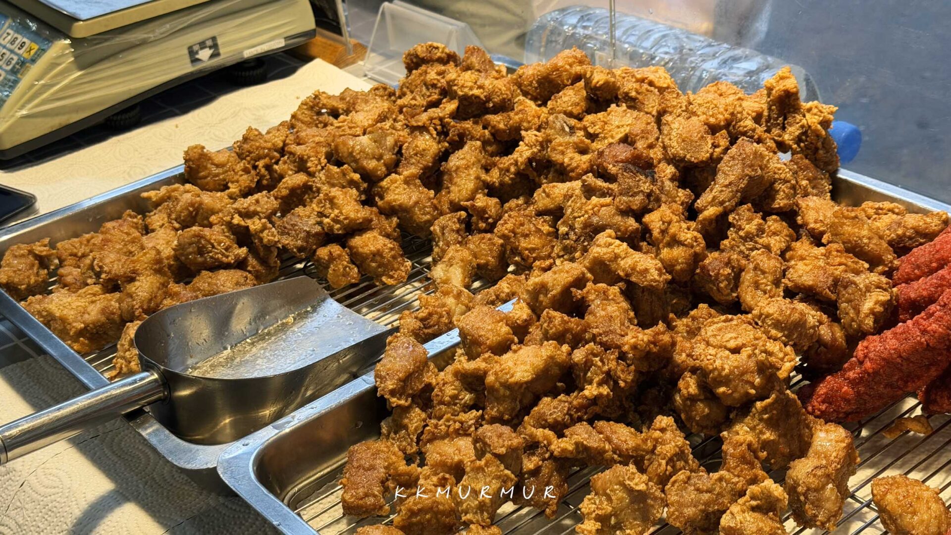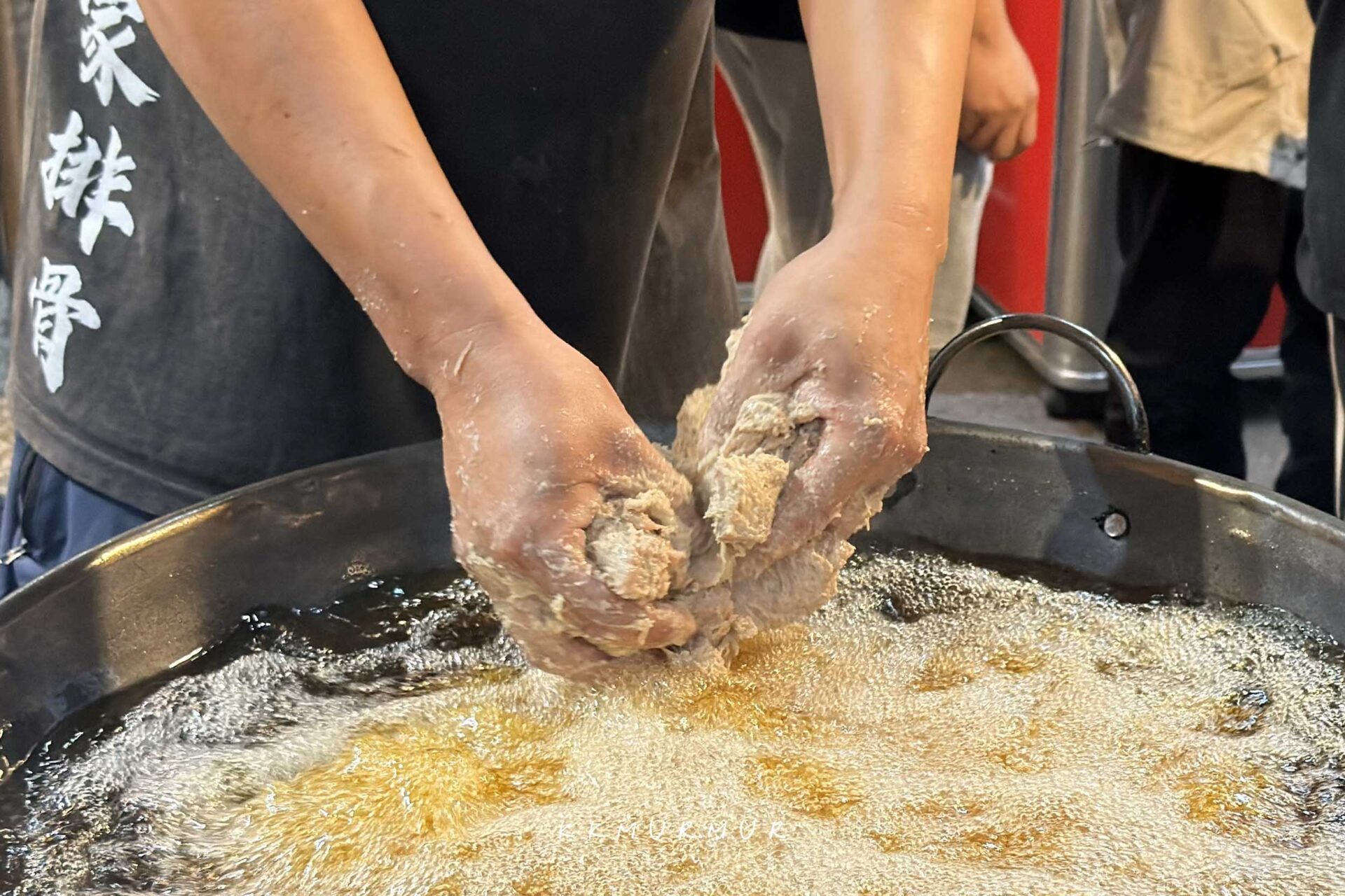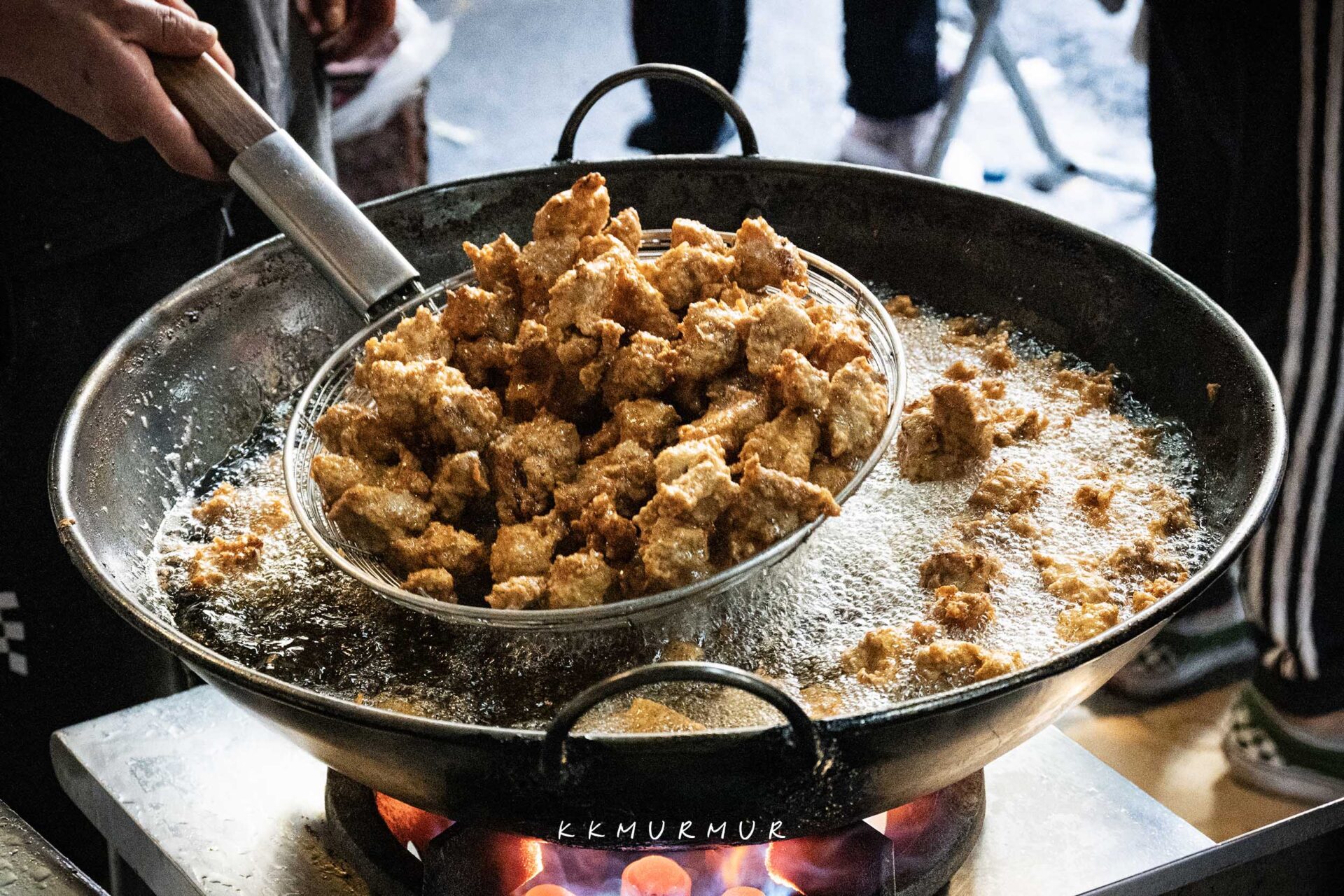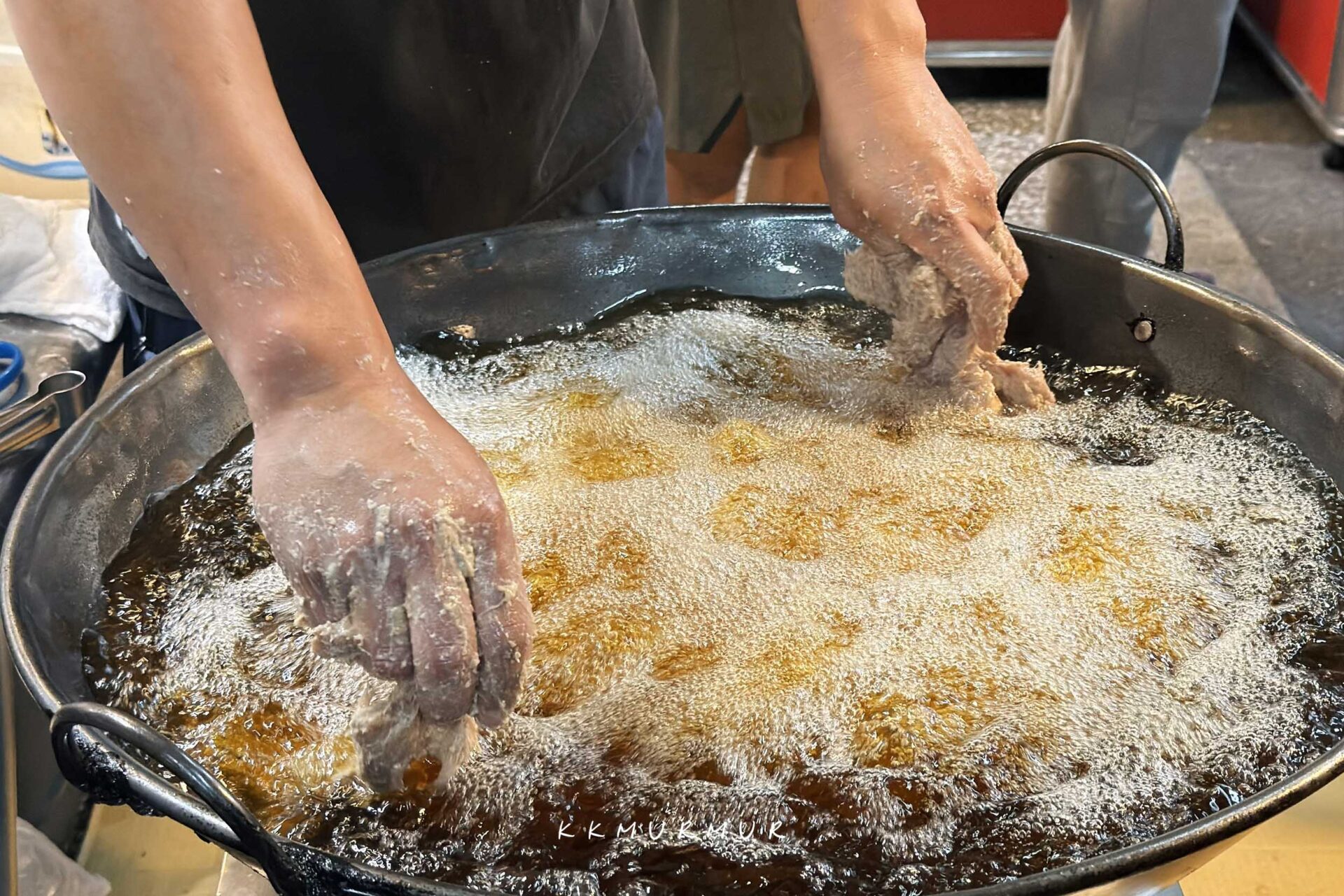 服務人員俐落的在製作著排骨酥,油香逼人、視覺跟嗅覺都很讓人飢餓。老闆在油炸排骨酥的過程,會把部分排骨酥剪半再回炸,以讓受熱更加平均。
