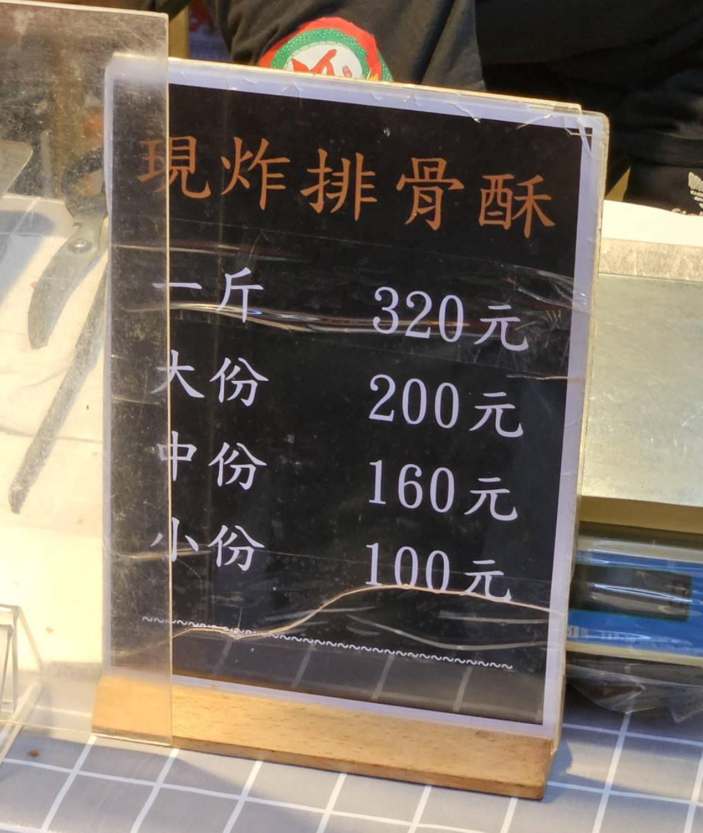 【何家百年祖傳排骨酥】的菜單如上,品項很單純,共有小、中、大與一斤四種分量可以選擇。這次我們點了中份的,價格為$160/份。