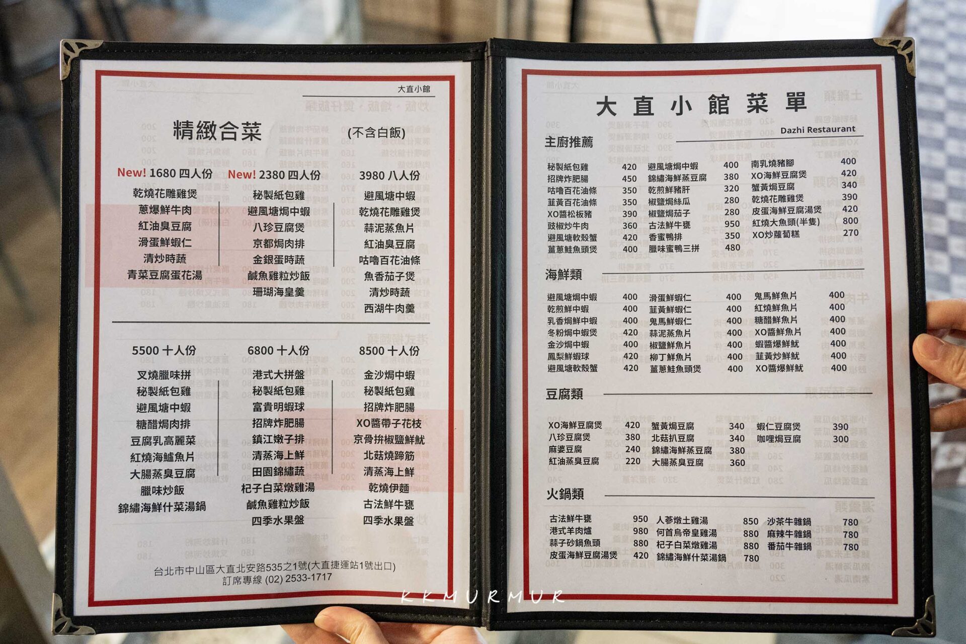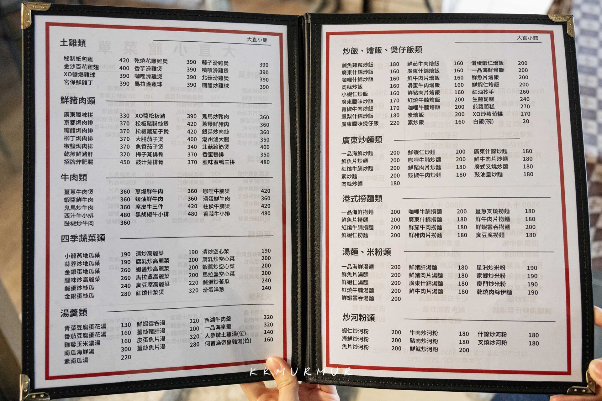 【大直小館】的菜單如上,品項滿豐富的,舉凡肉類料理、海鮮、豆腐/蔬菜、湯羹/火鍋、飯麵粉等等都一樣俱全,也有推出適合多人點的合菜套組可以選擇。若是第一次來的話,推薦可以點點看XO醬炒蘿蔔糕、乾炒牛河與韭黃百花油條。撈麵的話之前曾有吃過,因為沒那麼合我胃口,就不那麼推薦囉!
