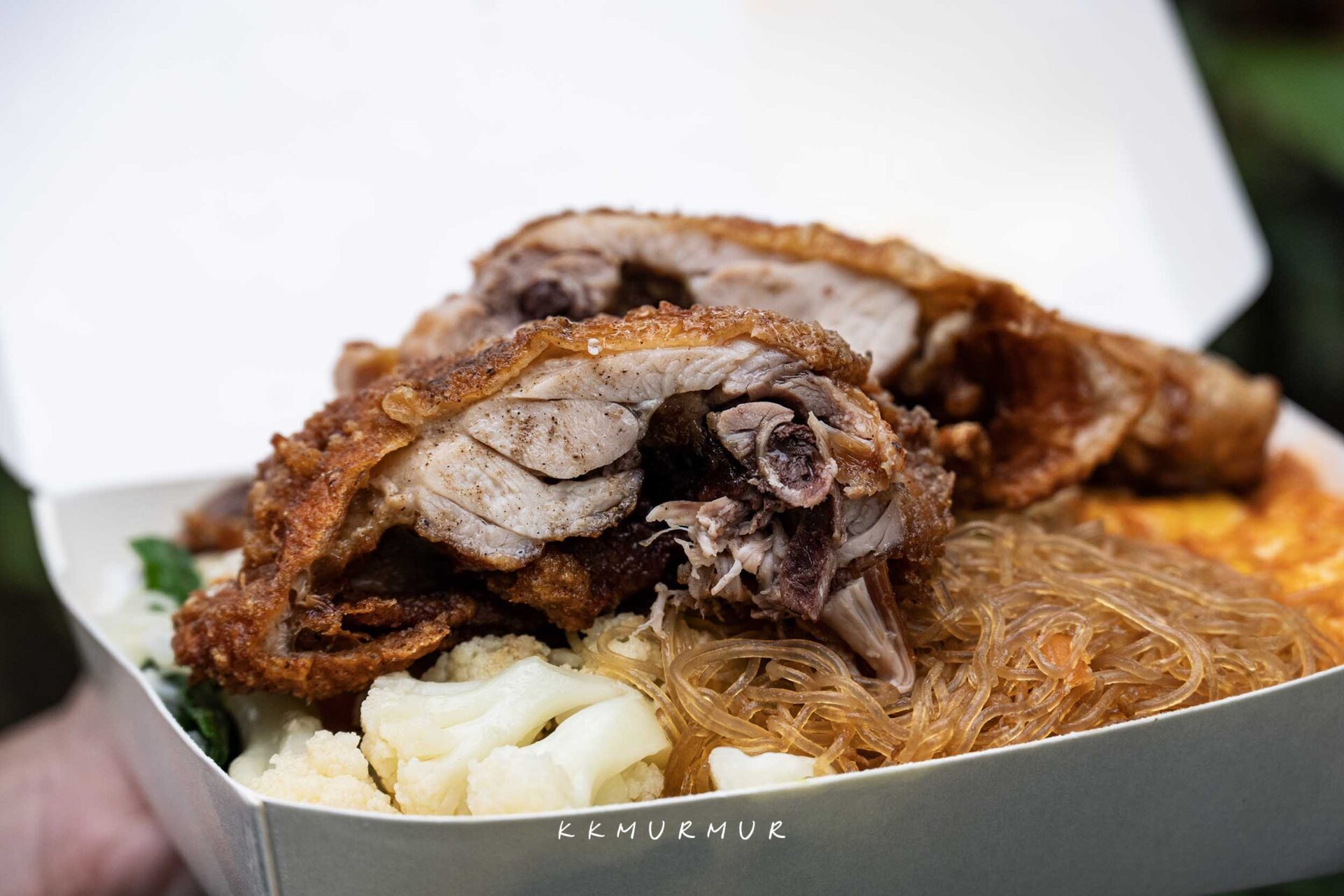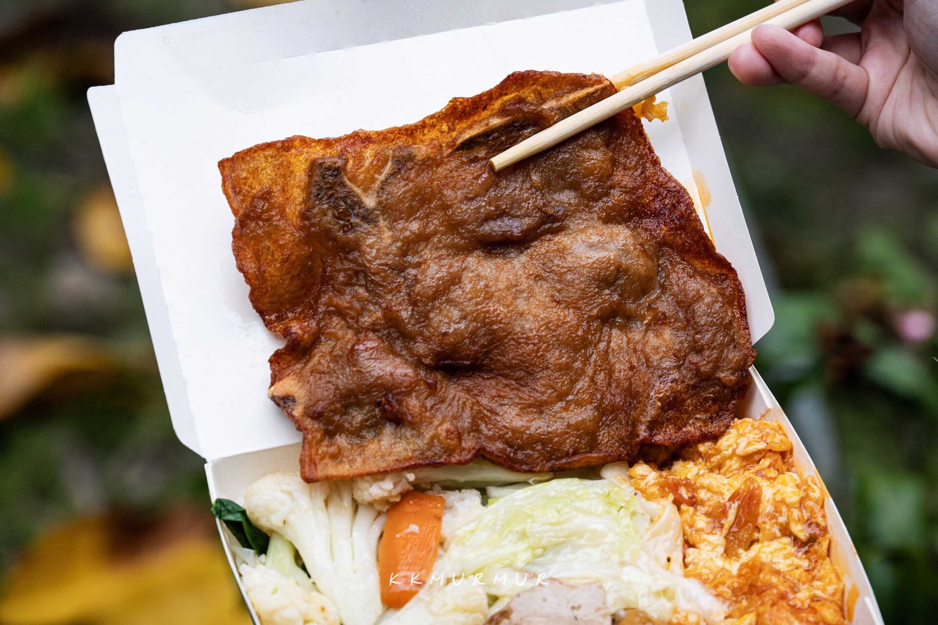 雞腿肉厚實飽滿又帶汁,本身就很不錯,但核心關鍵是雞腿的醃料,多層次的辛香與鹹香,彼此平衡的恰到好處,大口咬下超級過癮,但又不會太過重口或強烈,整體覺得很讚,怪不得會被網友評為「被排骨耽誤的雞腿便當店」。