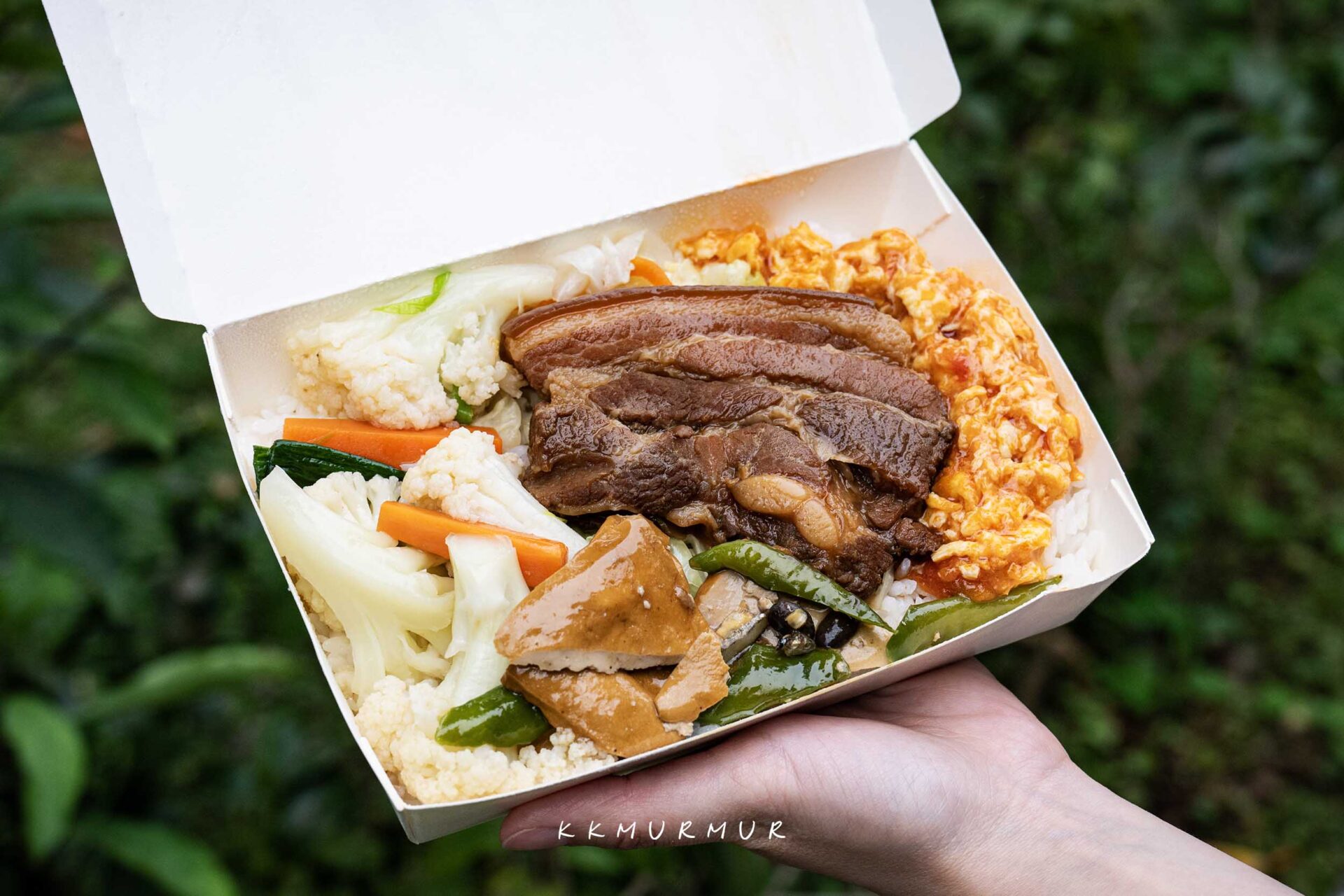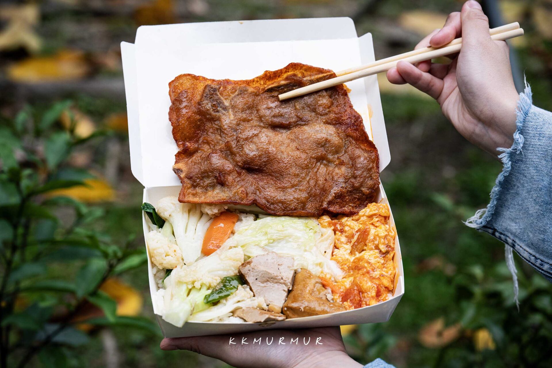 店內空間不大,主要分為點餐區、配菜區與油炸台,沒有規劃內用座位、僅供外帶。整體環境看起來還算滿乾淨的,沒有一些傳統便當店常見的黏膩感。原本的便當配置是三樣配菜,但老闆娘會隨機多送一樣,總共是一主菜加上四樣配菜。