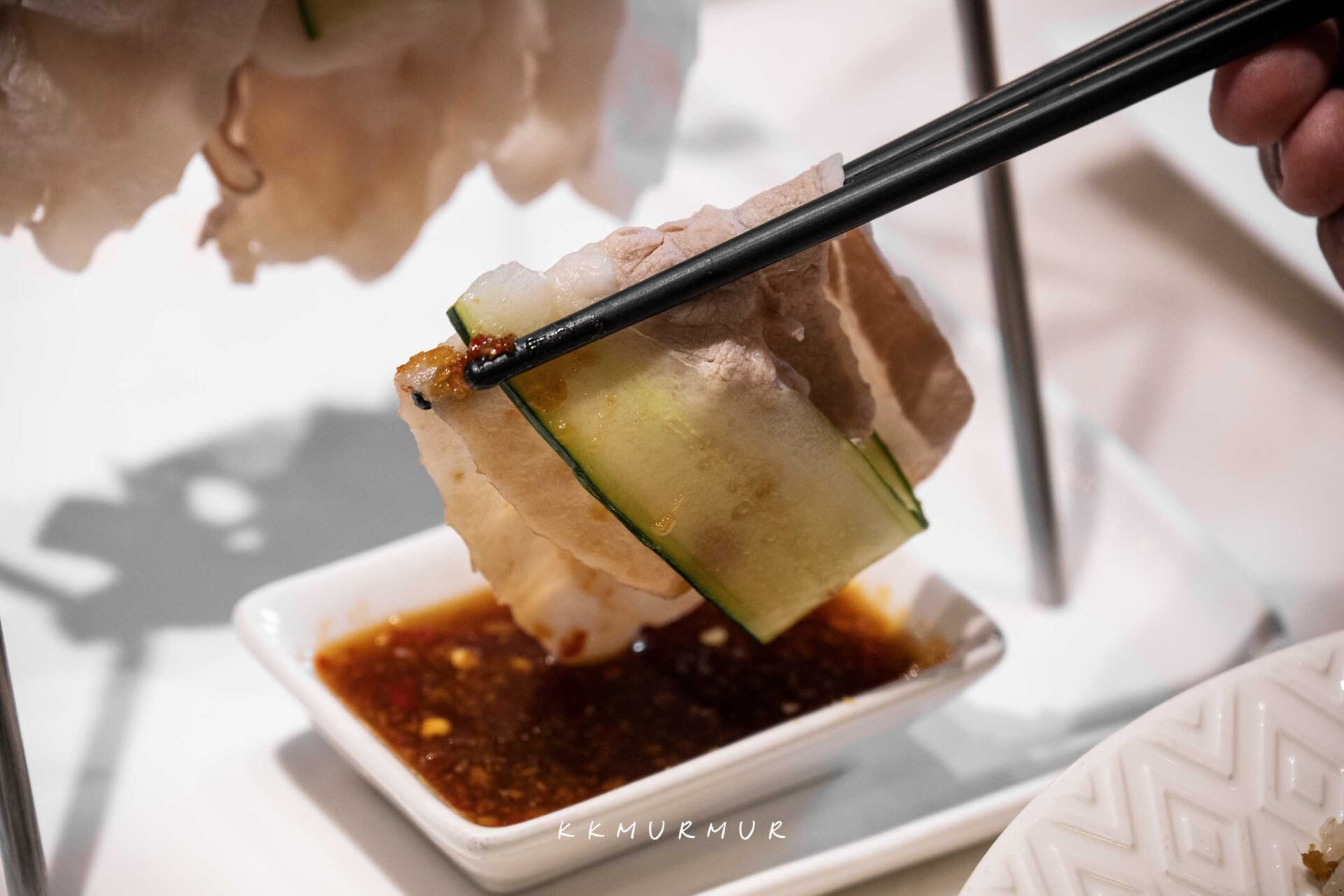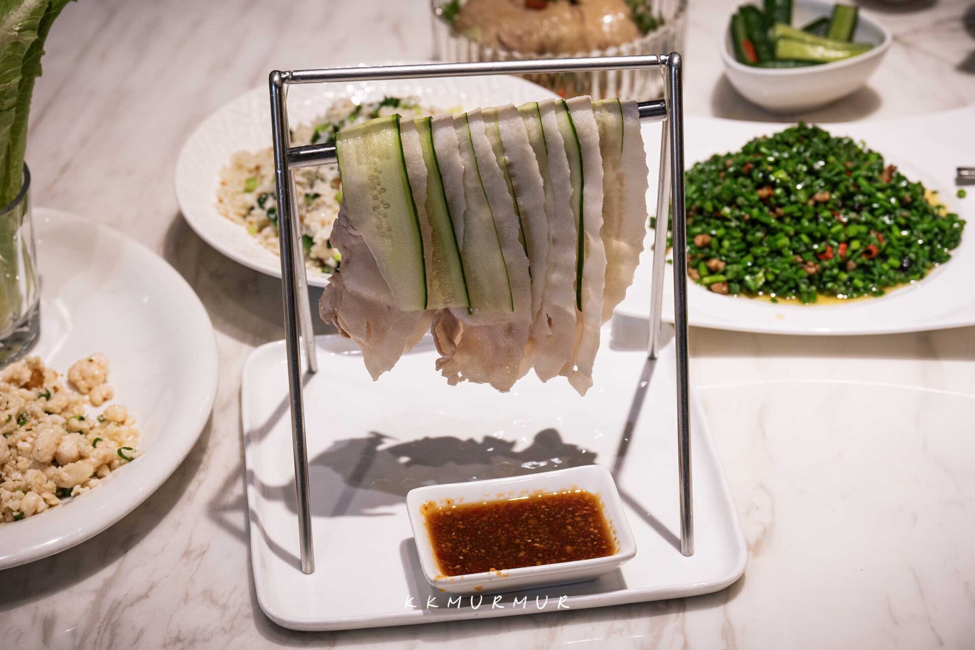 上桌呈現的視覺滿特別的,將薄切五花肉陳掛在架上,吃起來其實就像是蒜泥白肉,肉質軟嫩帶彈,醬汁帶也濃厚的蒜味,整體來說中規中矩,未來若再訪不會再點。