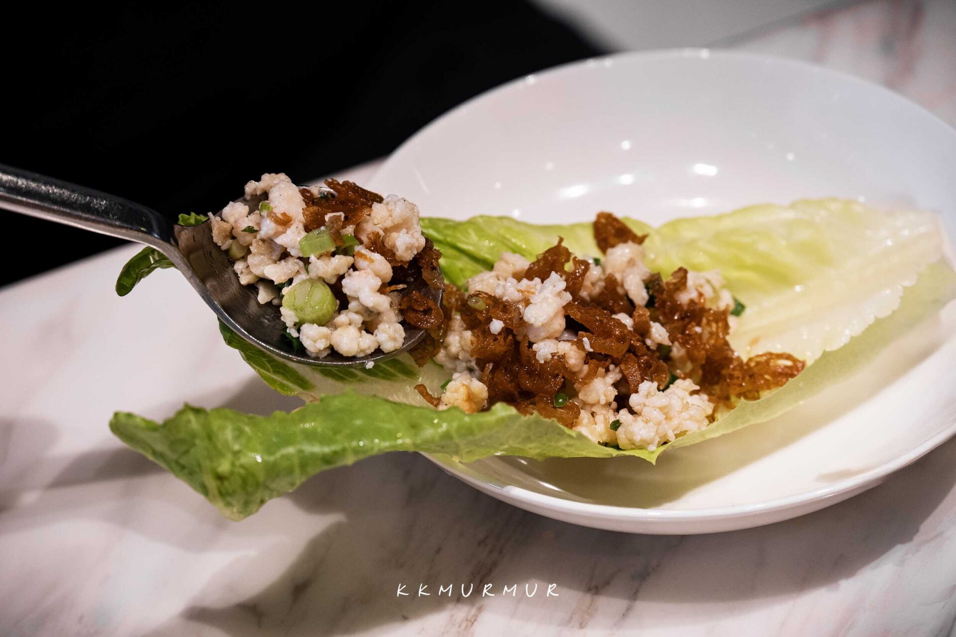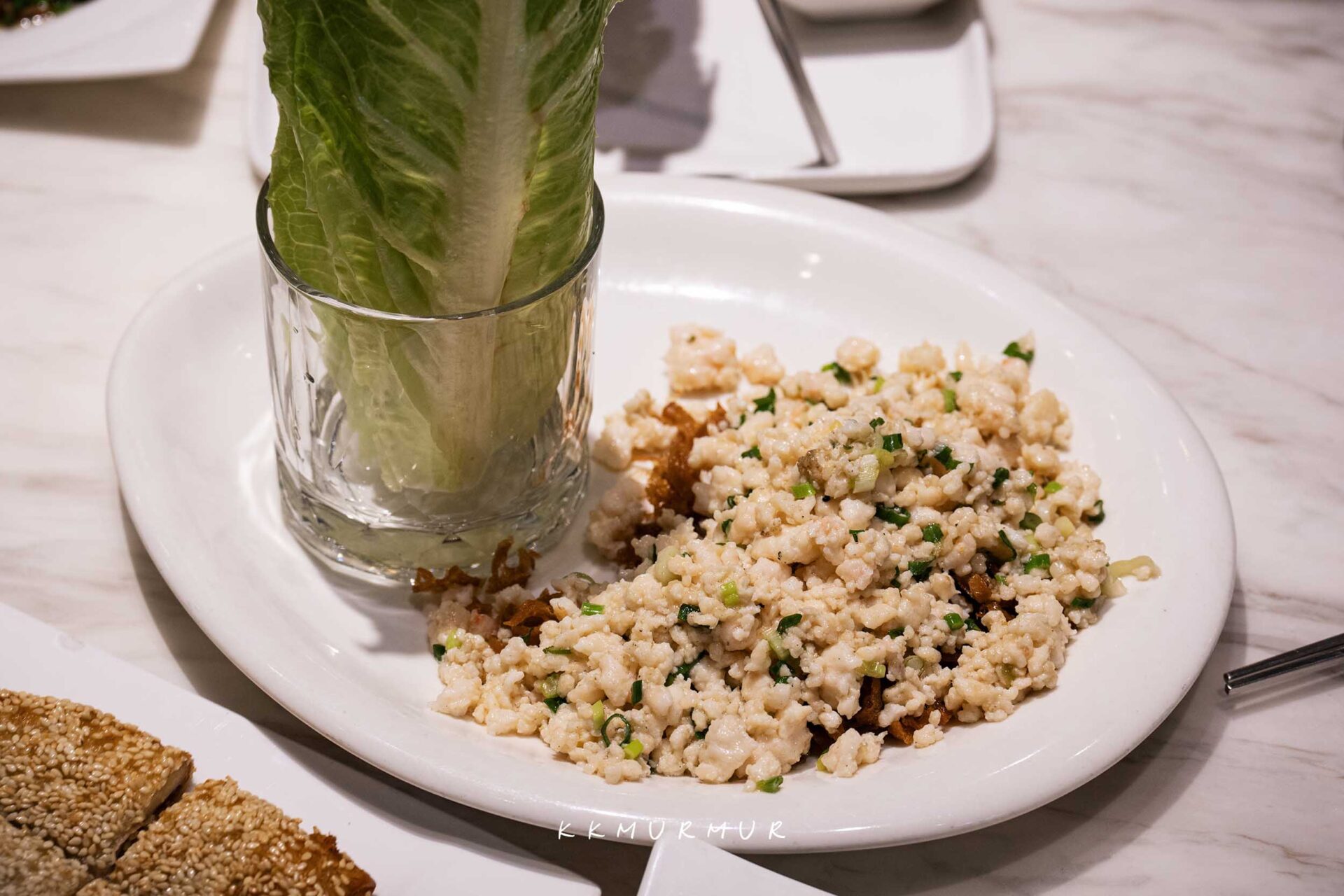 有加入一些紹興酒一起快炒,酒香鮮明但很適口,蝦仁與油條碎、蔬菜、松子一起炒製,以爽脆保水的蘿蔓葉包著品嘗,爽口不過重、鮮美又不油膩。