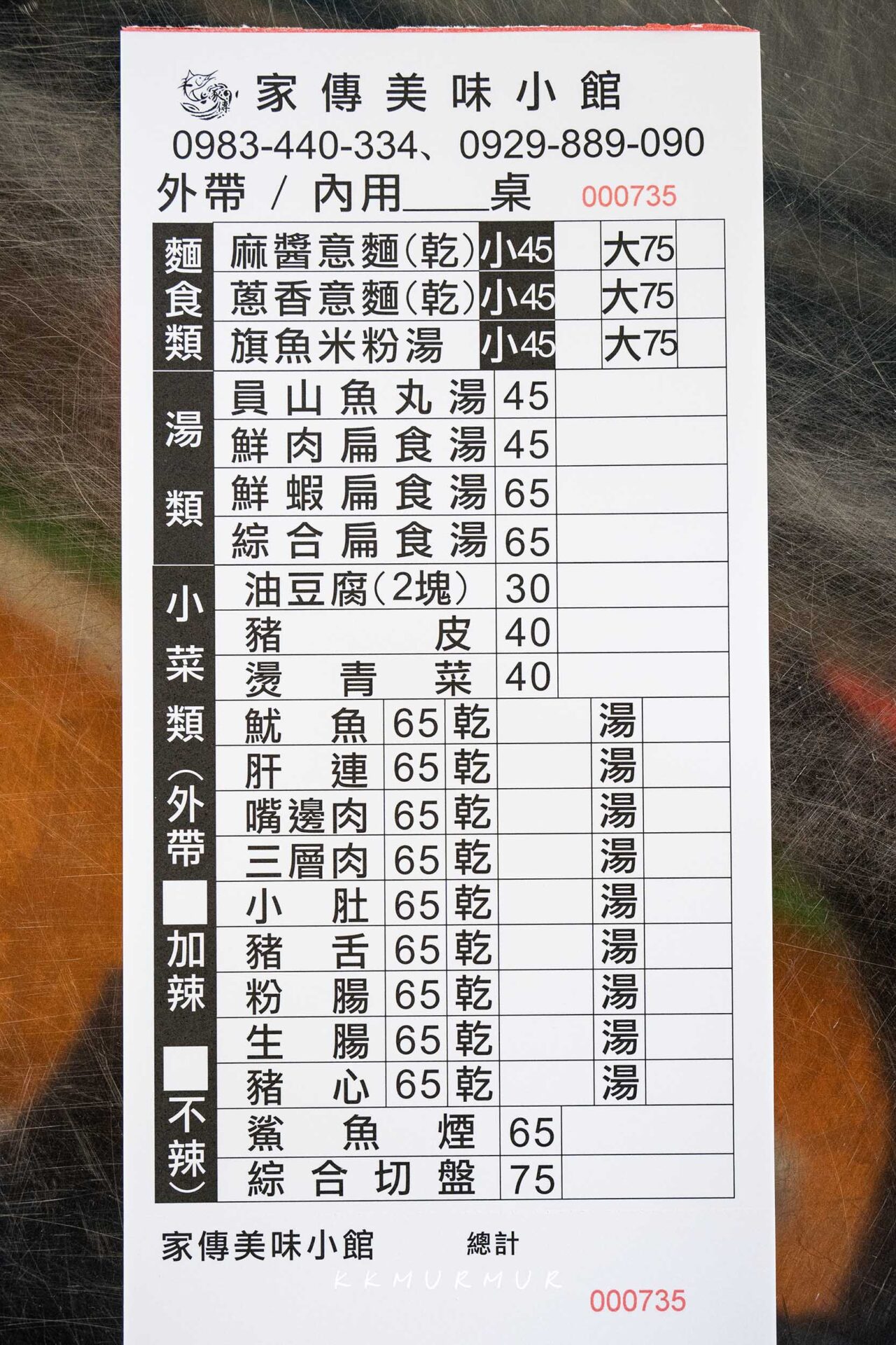 【家傳美味小館】的菜單如上,麵食共有三款,分別為麻醬意麵、蔥香意麵與旗魚米粉湯,另外亦有一些湯品、多種小菜可以點選。麵食價格統一為小份$45、大份$75,各式餐點的定價普遍親民實惠,是日常吃飯的好選擇,可以根據心情與口味來挑選。