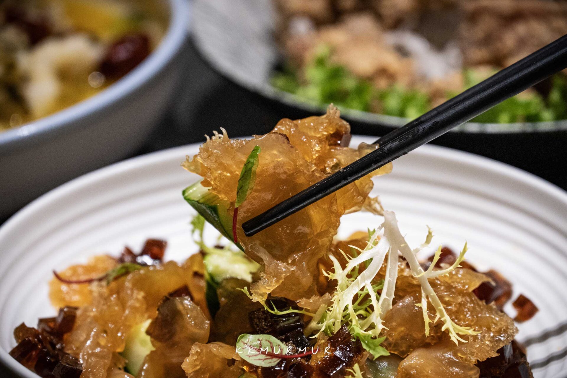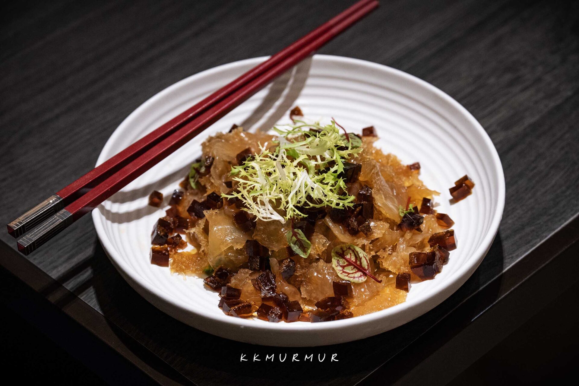 【老醋蜇頭】看著擺盤就覺得精緻又吸睛,剔透的海蜇皮Q彈而滑順,並帶著淡雅的酸甜滋味,吃起來爽口而絲毫不膩。另外很有特色的是,那一塊塊咖啡色的小正方體,是主廚特調配方的紫蘇梅醋凍,酸甜迷人交織著紫蘇梅香氣,可以將海蜇皮與紫蘇梅醋凍放在湯匙中一起入口品嘗,層次感豐富、爽鮮又開胃。