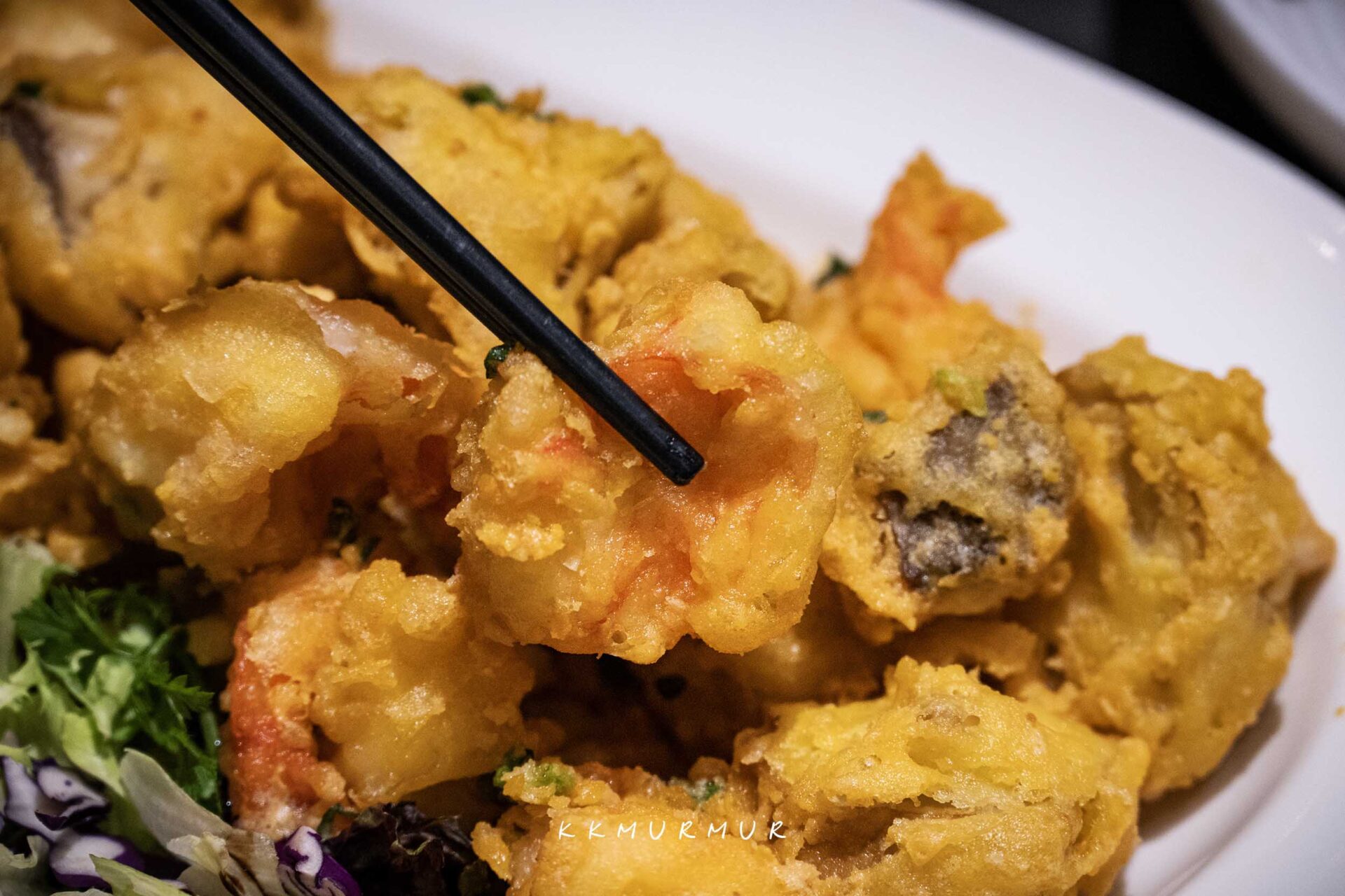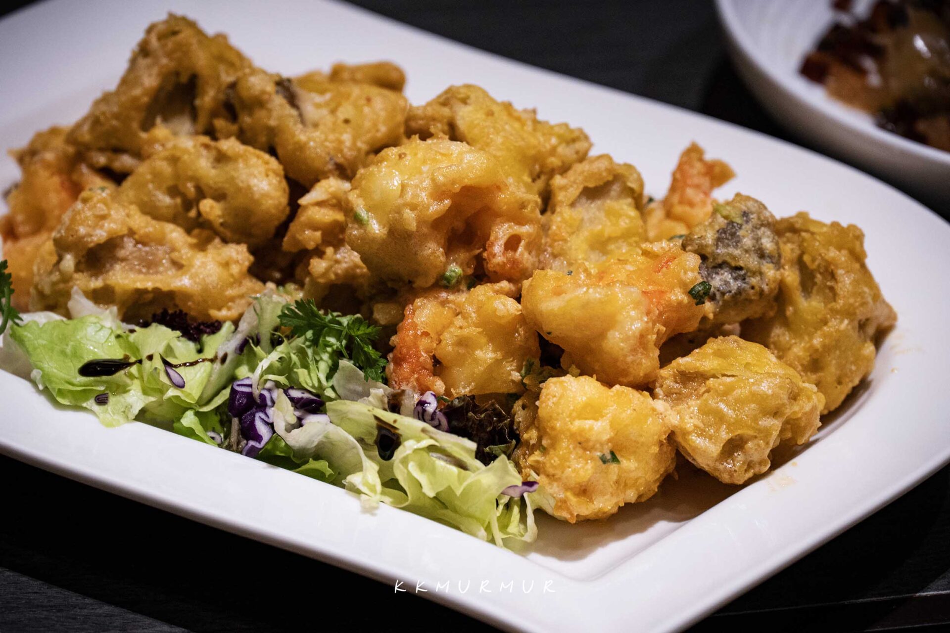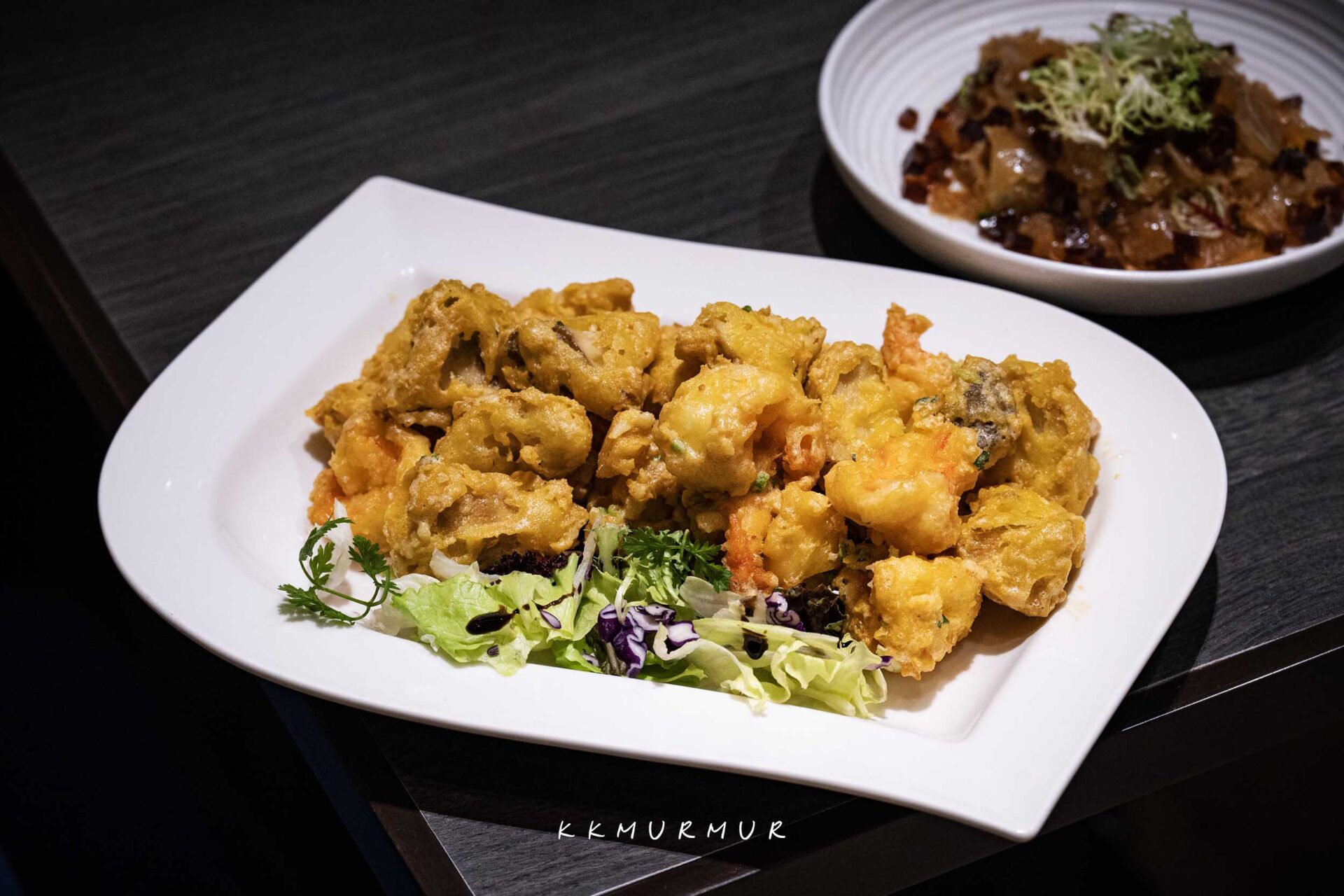 這品【金沙杏鮑菇蝦球】份量很有誠意啊! 蝦球本身塊頭非常的碩大,口感彈牙、滋味鮮美,鹹蛋黃的金沙外衣鹹香誘人並帶點酥口,大口咬下十足的過癮,喜歡感受吃大蝦球那滿足感的人,都會很喜歡這品料理。杏鮑菇部分也是處理得很好,富有彈性又保水,與金沙蝦球交替著品嘗,也是別有一番風味,也能起到切換味覺體驗、避免疲乏的作用。