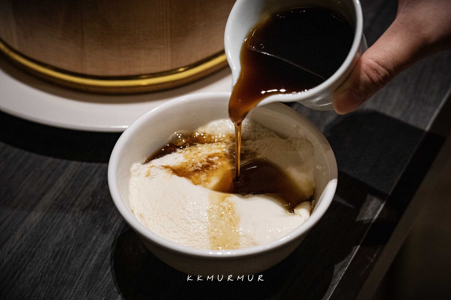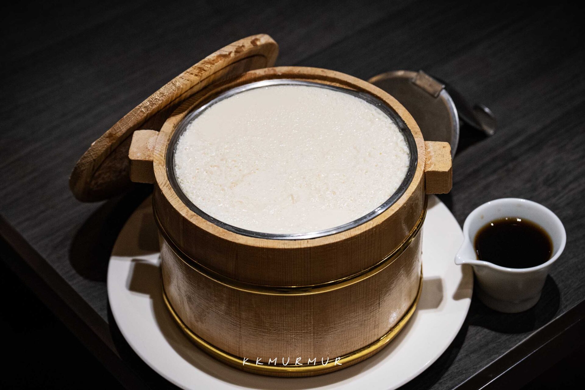 【手沖木桶豆花】原本沒有抱太大期待,結果一吃發現超強欸。客人點餐後才會現場手沖製作,這豆花的口感非常細緻、質地軟綿,入口絲毫不用費力就會在嘴中直接化開,並散發出迷人的清香與豆香。而那手工炒製的黑糖,濃稠度與甜度拿捏精準而得宜,搭配起來真的是療癒萬分,做為飯後的收尾甜點超級推薦。後來跟服務人員聊天,才得知許多客人也是吃過一次這豆花後,每次再訪都會必點這甜點來收尾,實在好好吃阿!