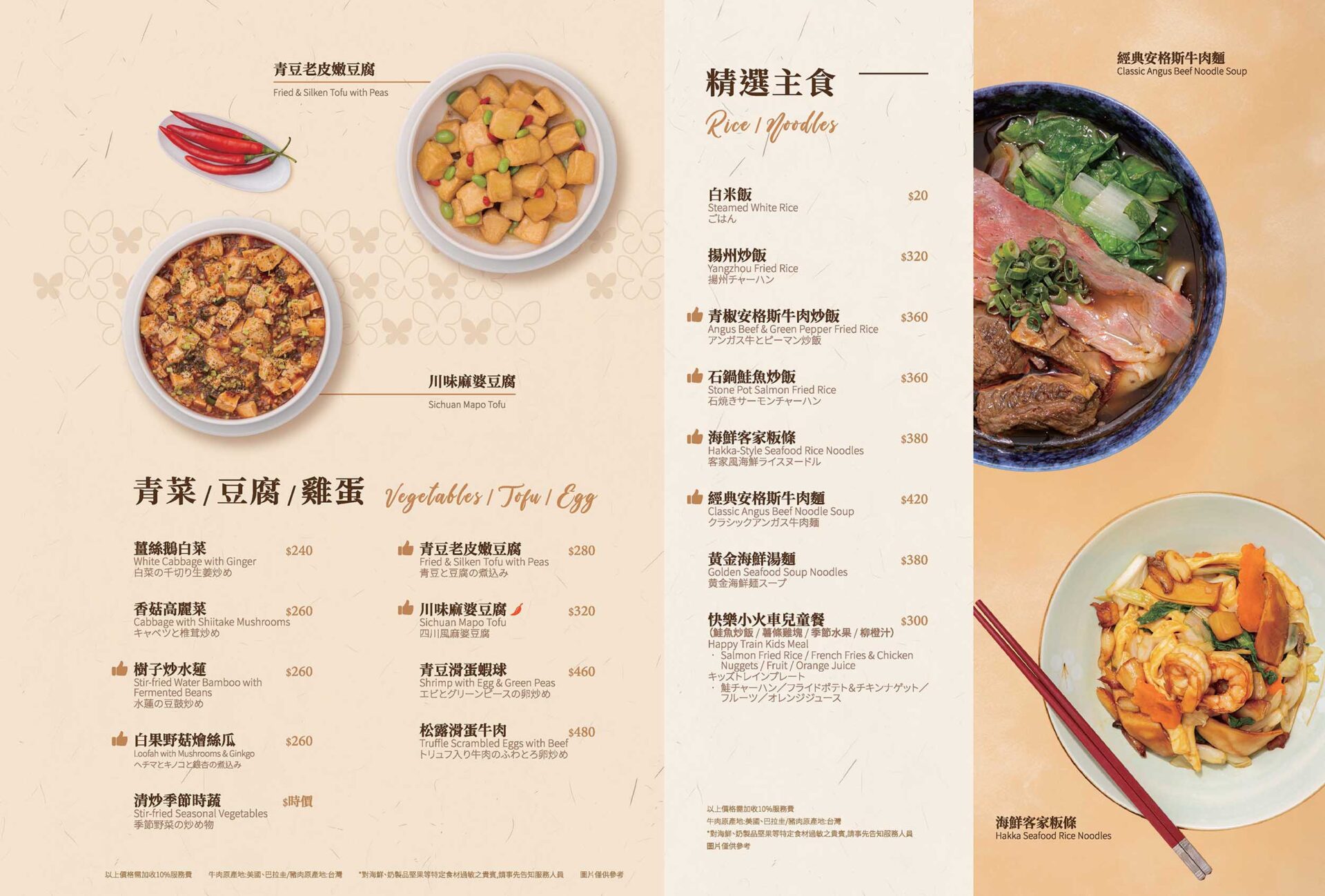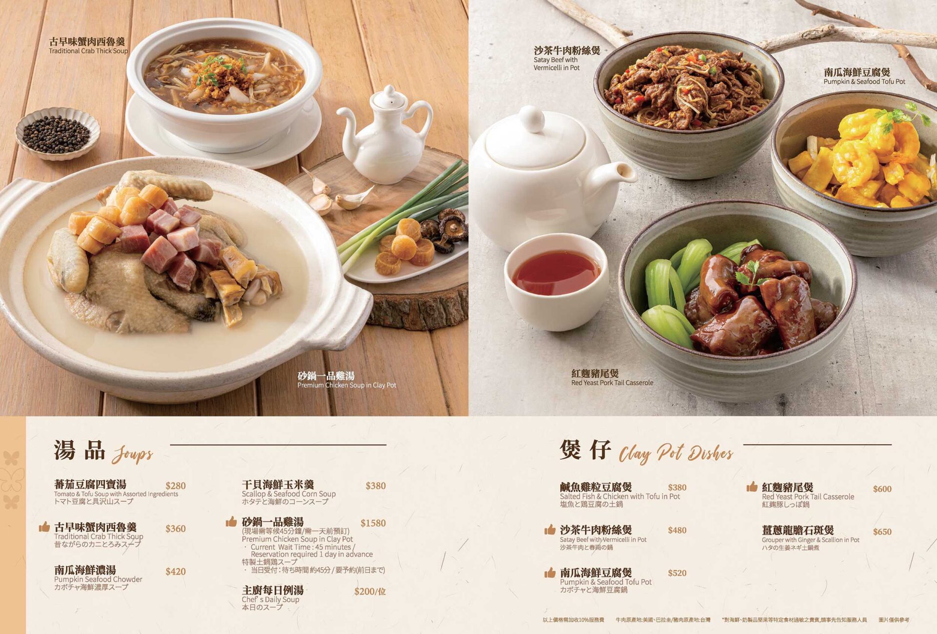 【Home Garden】的菜單如上,品項豐富多元,舉凡開胃涼菜、燒臘、肉類料理、各式海鮮、青菜/豆腐/蛋、煲仔、飯麵主食、湯品、甜點/水果與飲品都一應俱全,亦有多款素食料理可供選擇。若是第一次到訪的客人,也有列出主廚推薦的品項或特別標註以供客人參考!