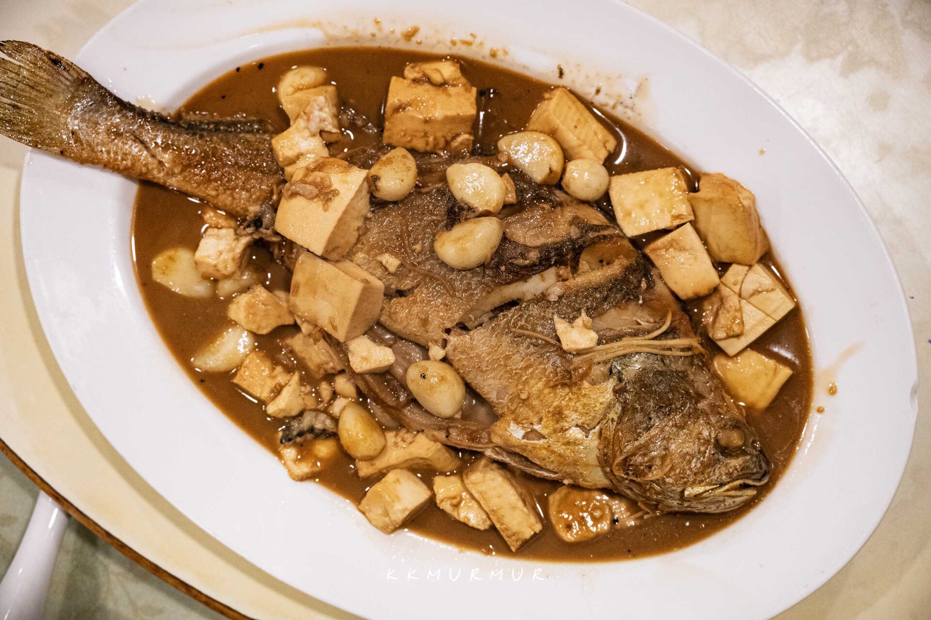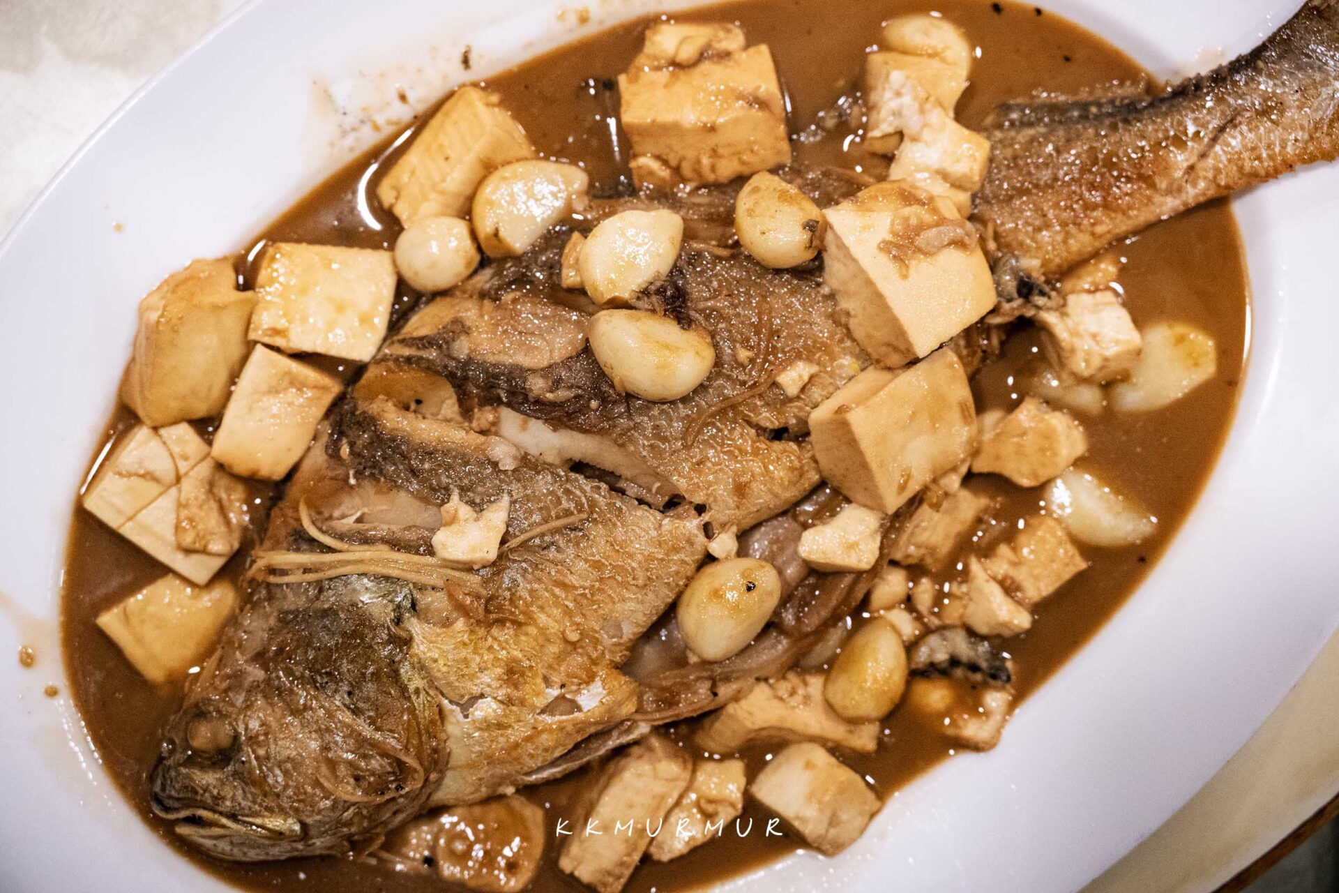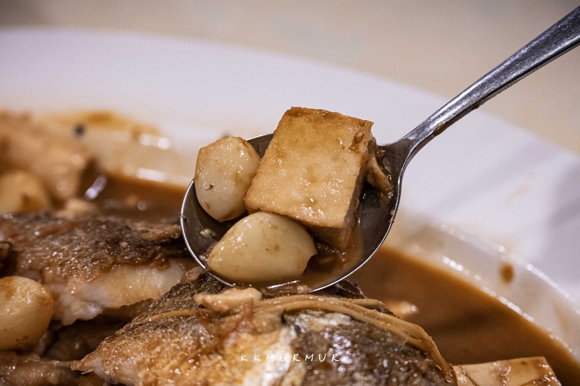 【豆腐黃魚】還不錯, 黃魚肉質細緻而軟嫩,並且燒得滿入味,醬香濃郁帶點甜,光那醬汁澆飯就足夠迷人。豆腐跟蒜頭也是燒得滿透,雖不像六品小館那種超入味、一抿即化開的程度,但也是十分得不錯了!