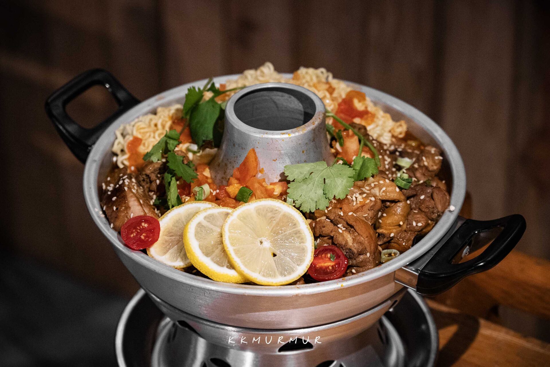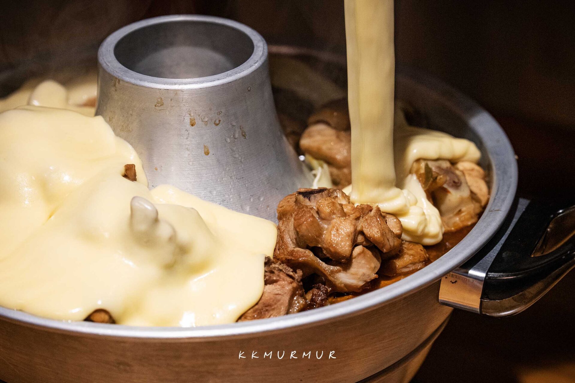 【青花椒起司火鍋雞】固定是兩人份($298/人),選用溫體雞腿肉,肉量本身就非常的多,再加價$88尬上爆量的黃金起司瀑布,看著這畫面真的是誘人到不行。這一鍋的份量感也是相當十足,拍照好看外,食量大的人也會吃得絕頂過癮!