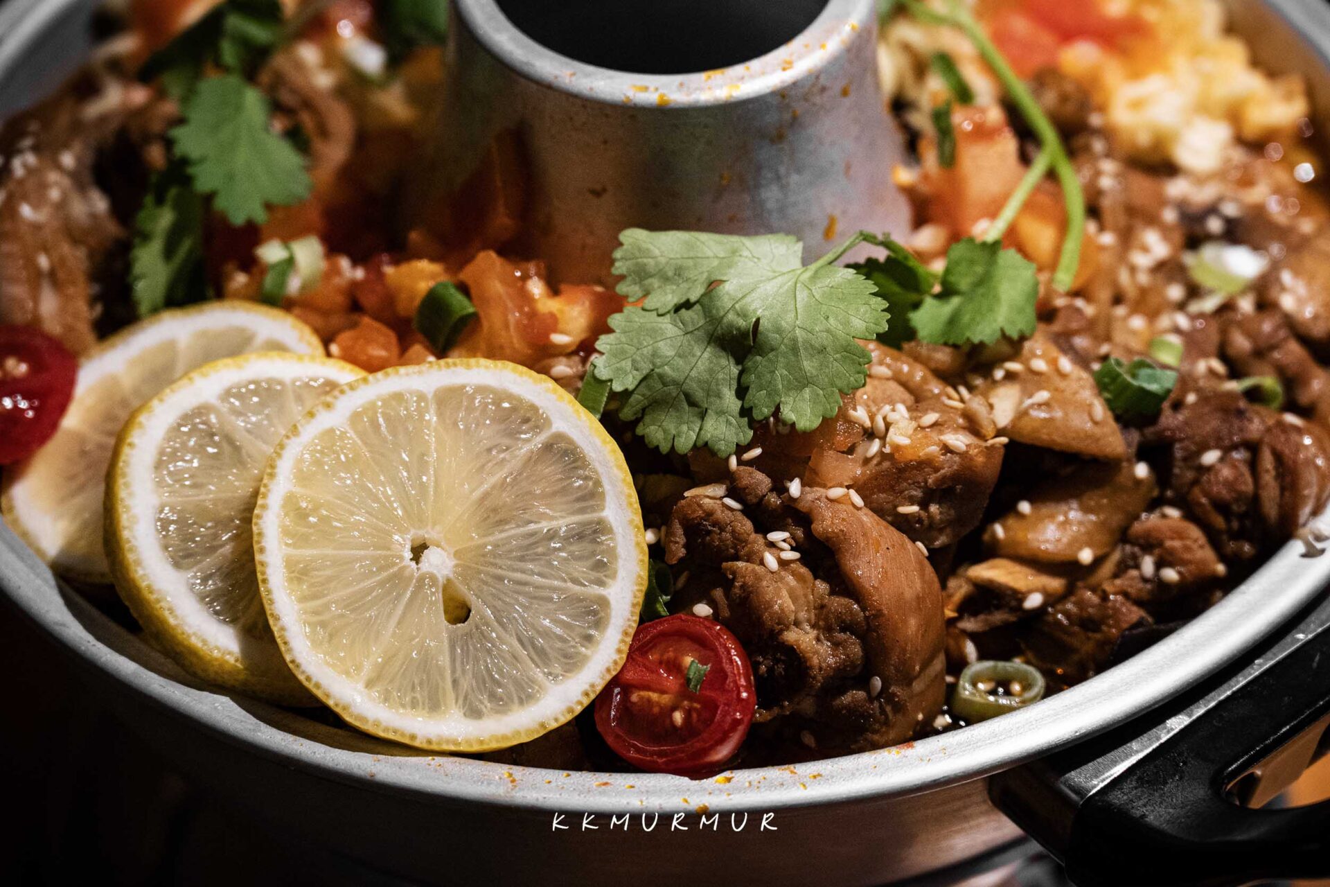 【番茄火鍋雞】一樣是揀選溫體雞腿肉,看這鍋滿滿的「雞肉山」,份量看著就相當豪邁,而除了海量雞肉外,還有加入新鮮番茄丁、檸檬片、香菜等各式佐料來提味。