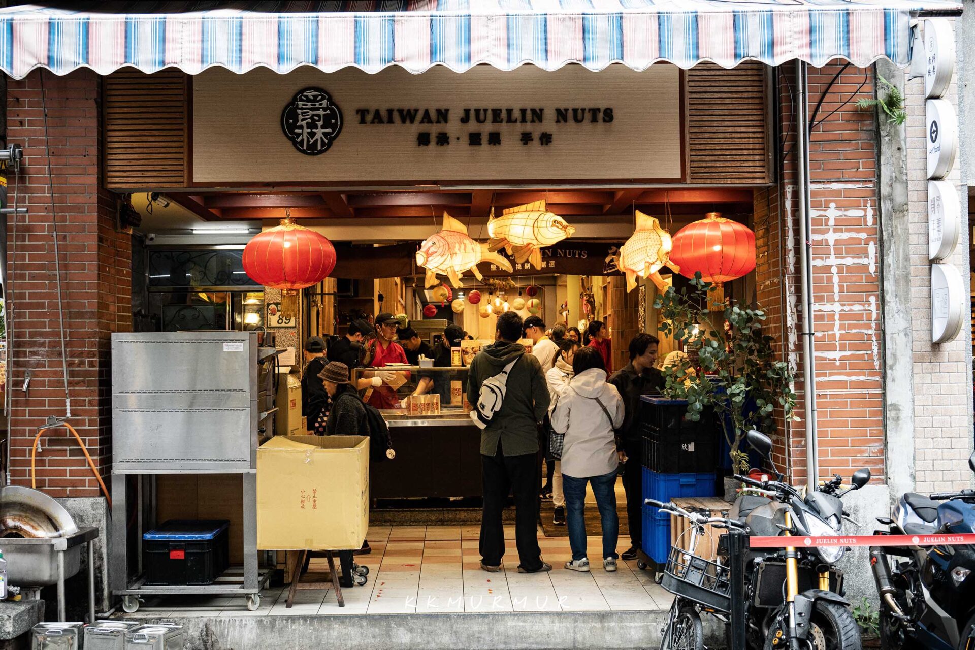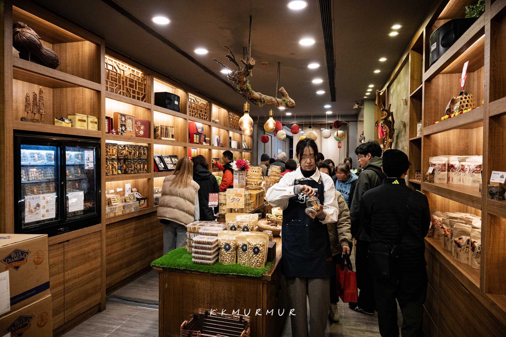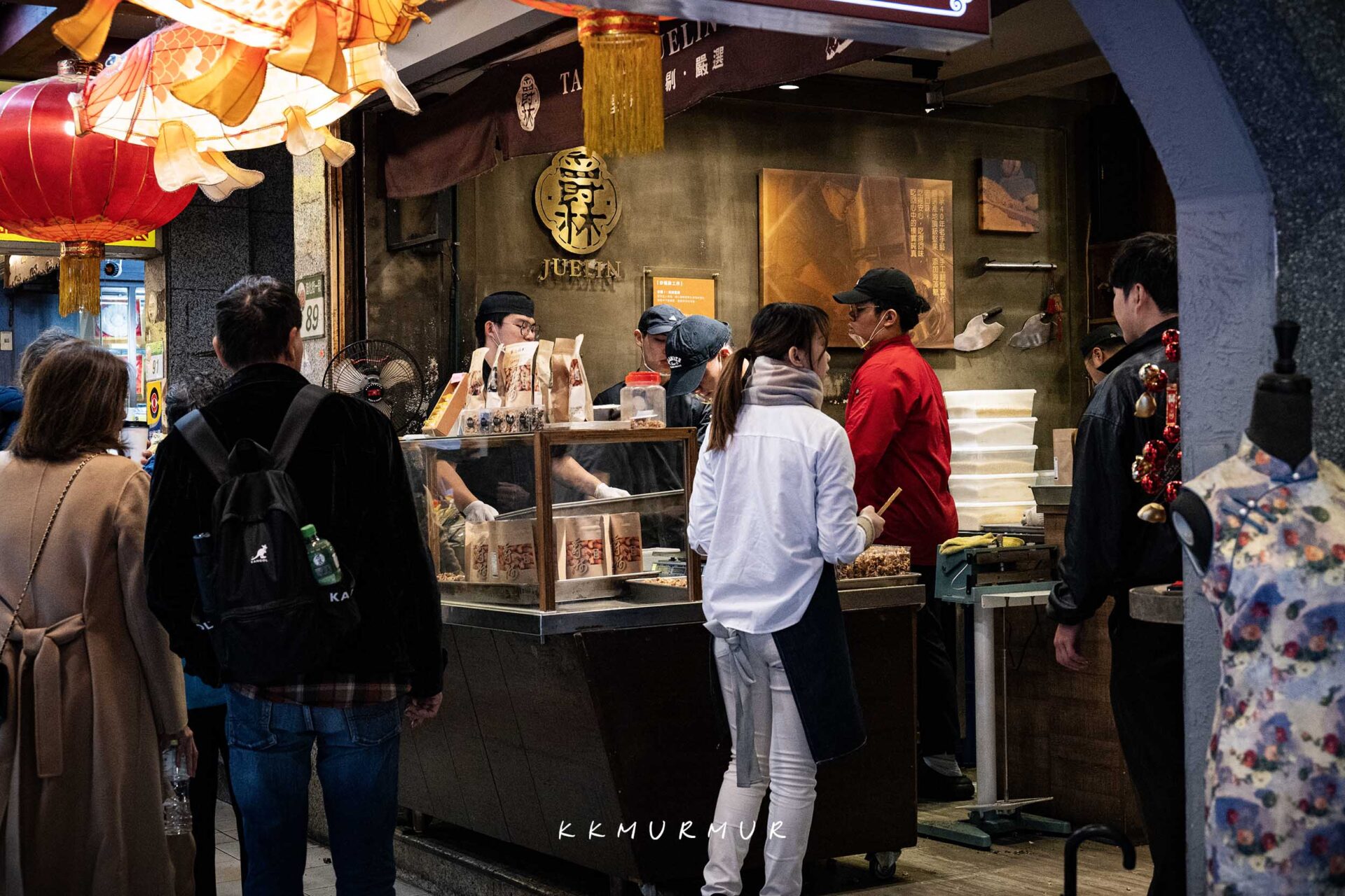 我們是過年前一個月到訪,雖然是平日下午,但到訪迪化街的遊客還是滿多的。【爵林堅果坊-迪化總店】的門面現場有一整片開放式料理區,許多人都被其製作過程、濃厚的香氣給吸引住了目光,門口也有服務人員會給予經過的人試吃。