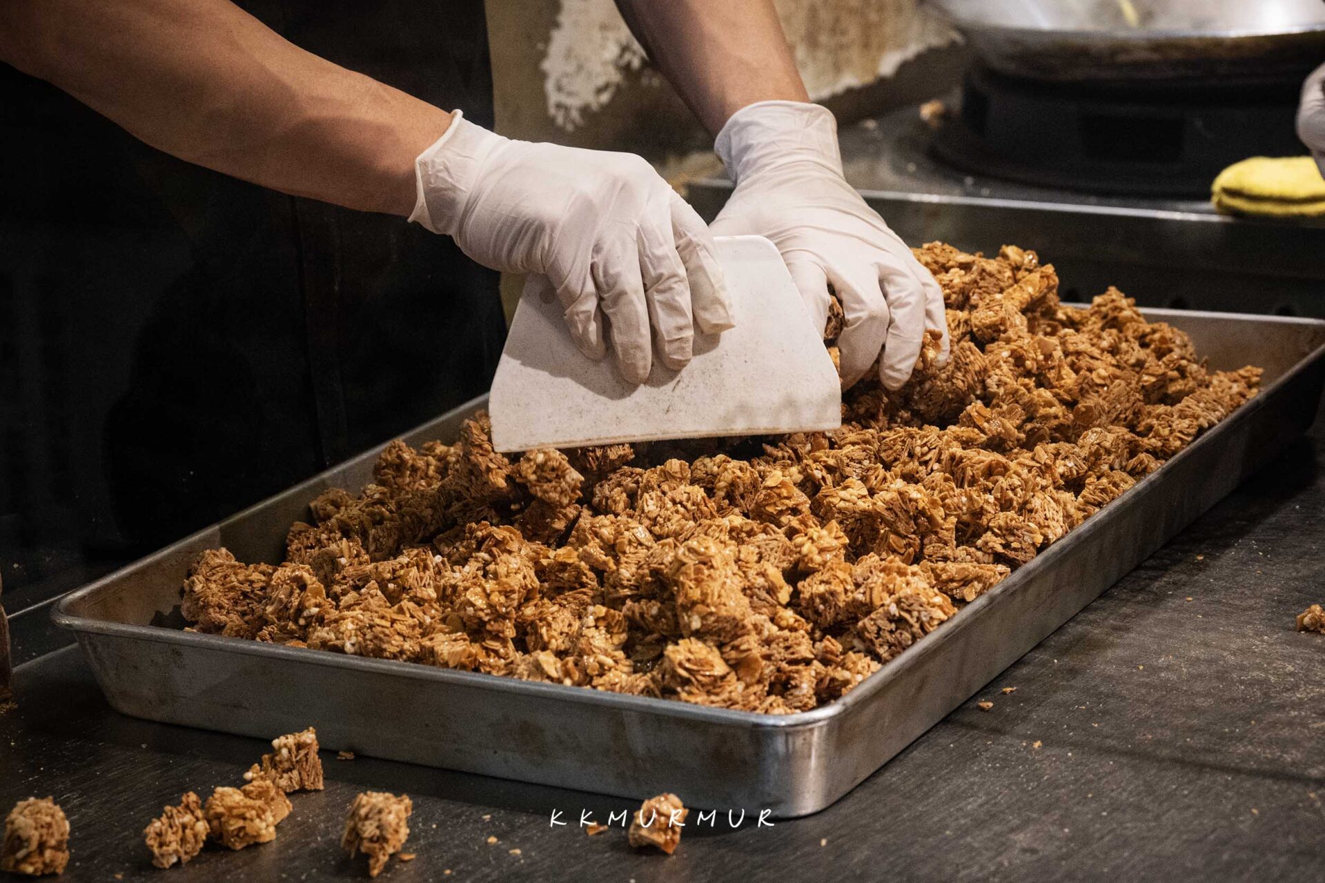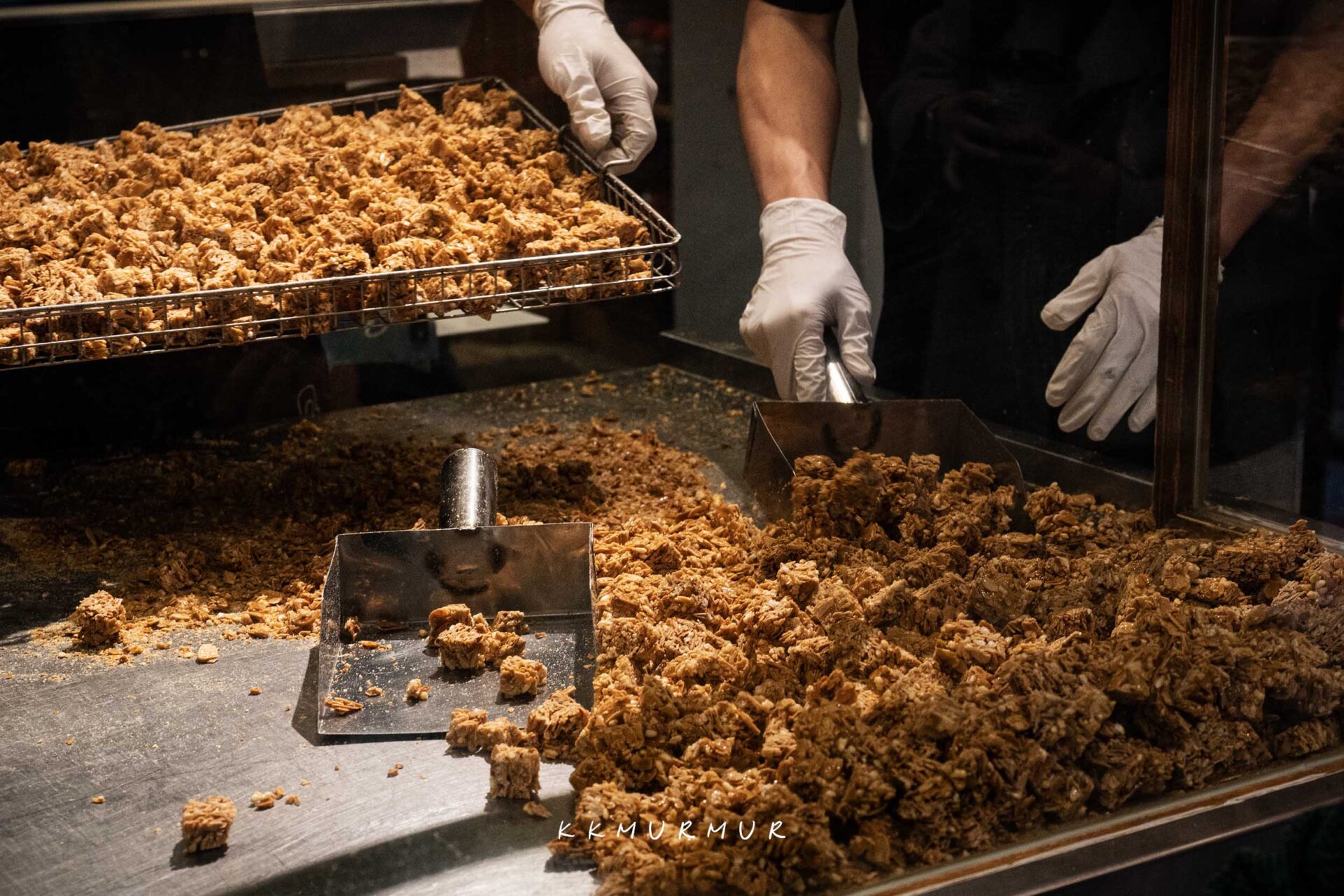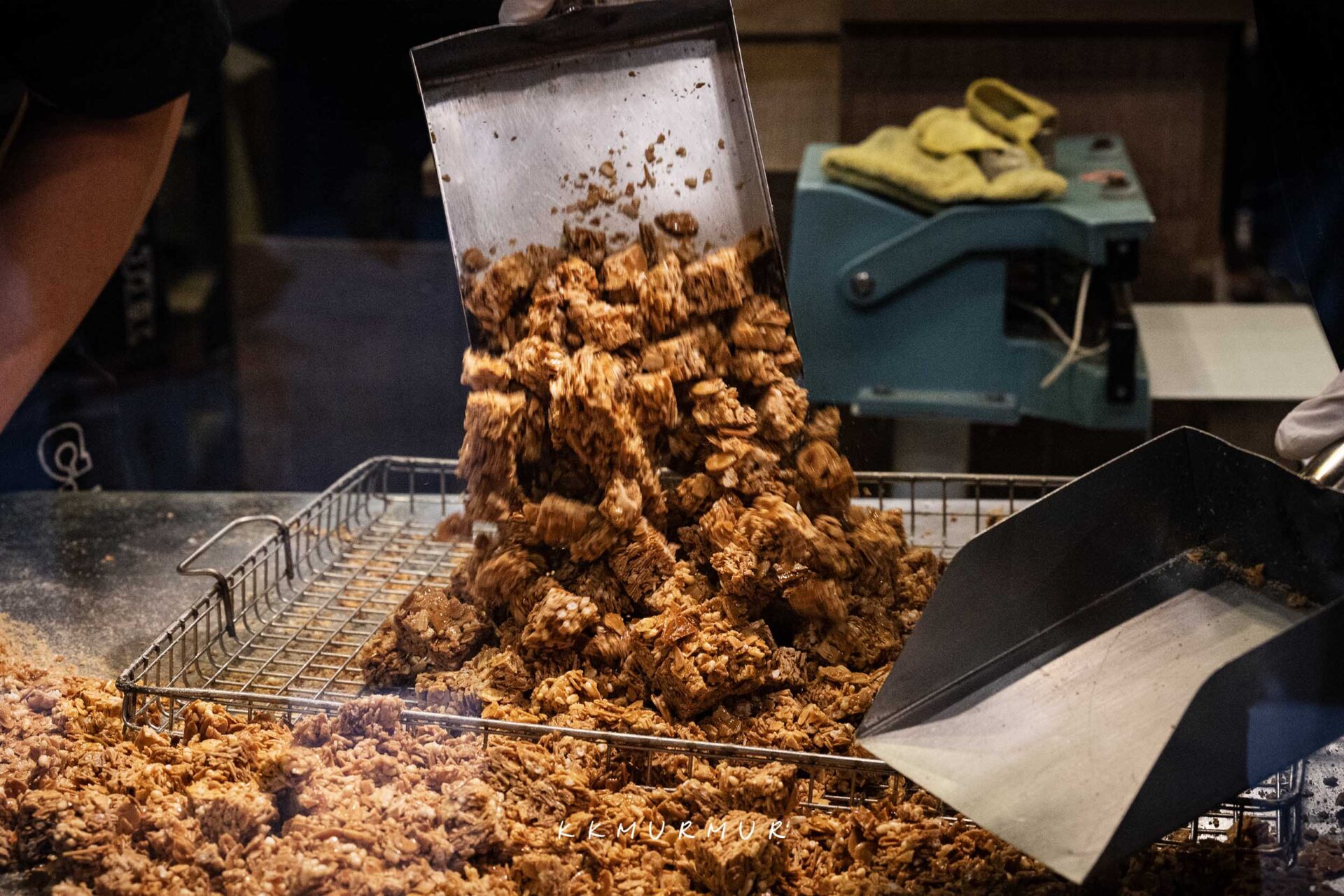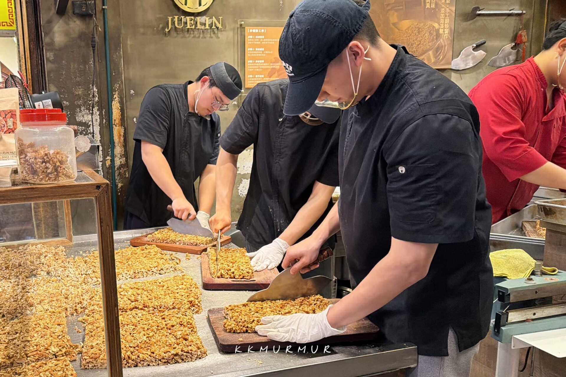 從烘烤製作、鍋鏟翻炒、糖漿拉絲,堅果鋪平與成型後的分切,每個步驟都可以被清楚看到,不僅香氣非常的誘人外,更是一種很不錯的觀賞體驗。