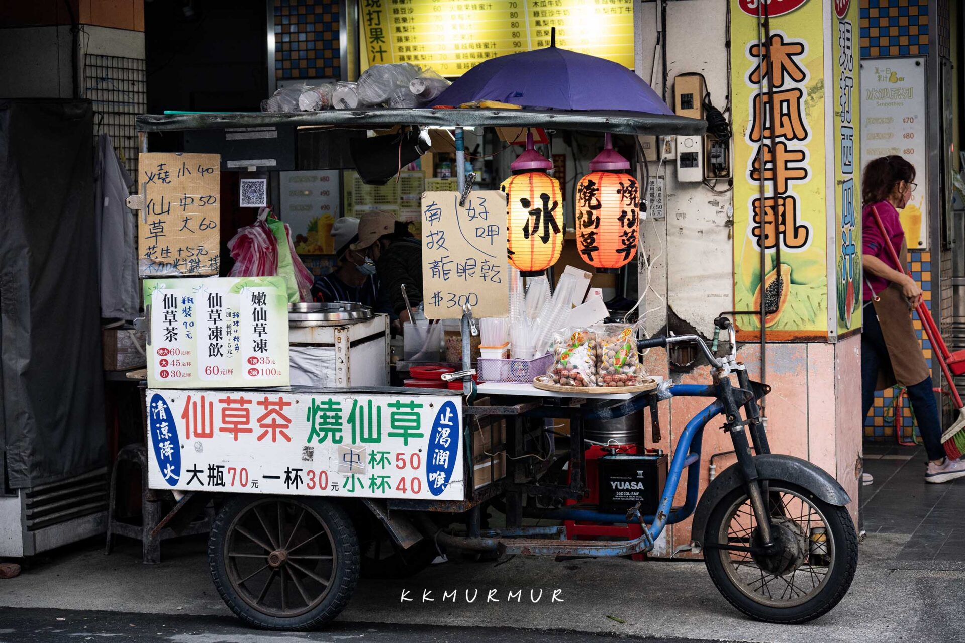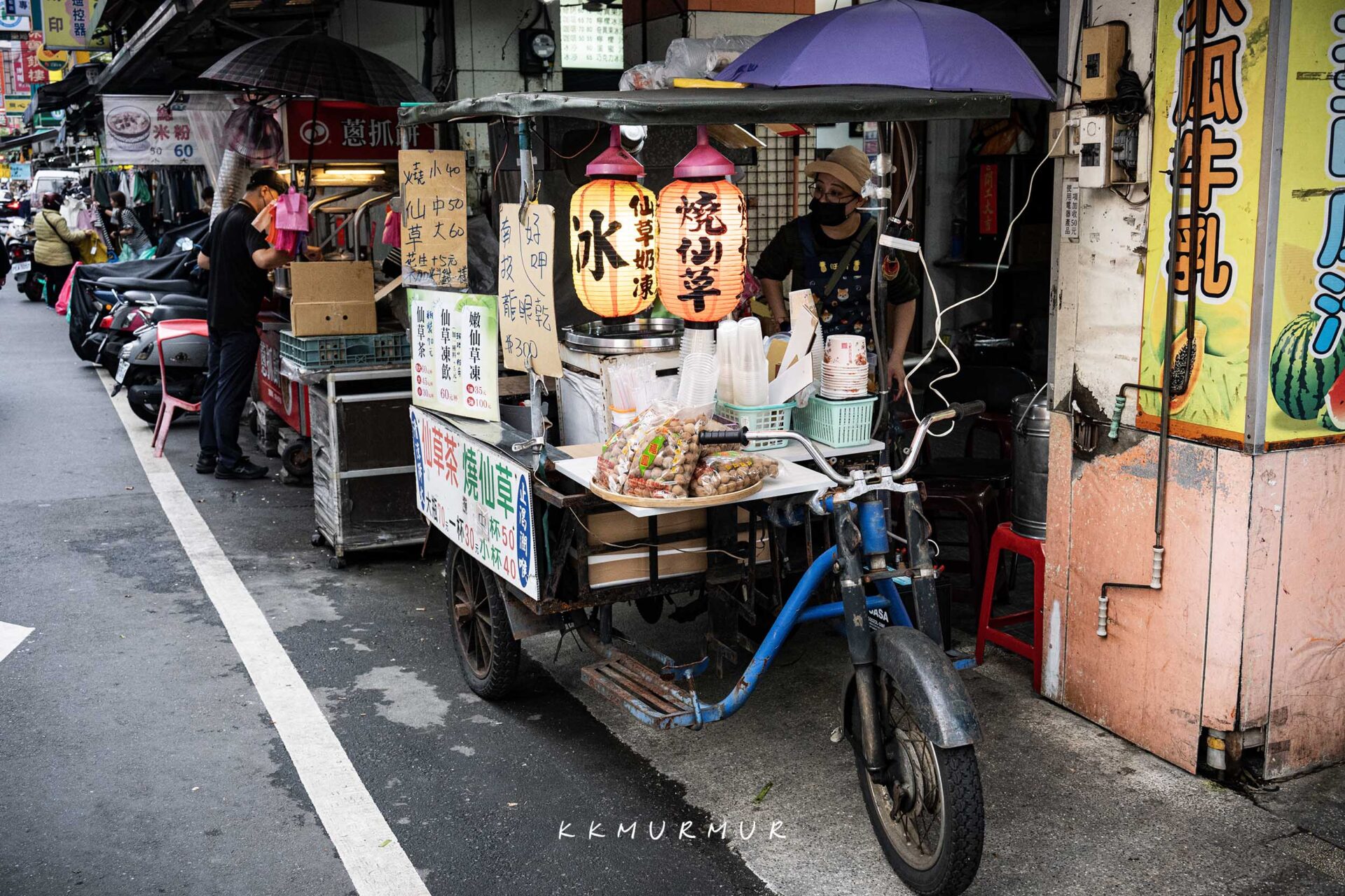 【紅燈籠三輪車仙草】位在南京公寓市場與南京東路五段的交叉口,看到一台帶點年代感的三輪車,以及寫著燒仙草的紅燈籠那就是了。不提供內用座位、僅能外帶,表定是下午四點半開始營業,但我們這天到時還未看到三輪車,大約晚了5-10分鐘才出攤,但美味真的是值得等待!