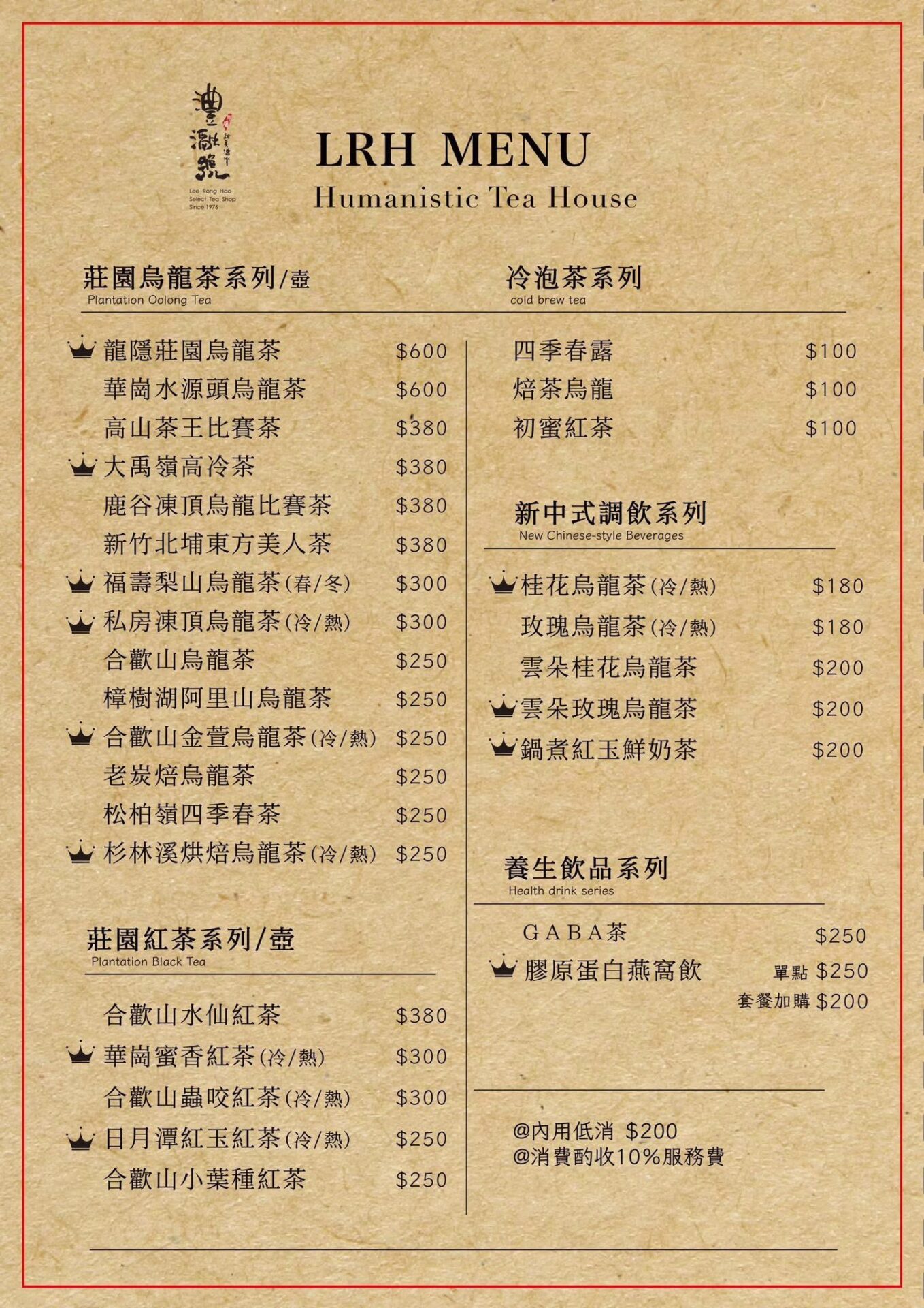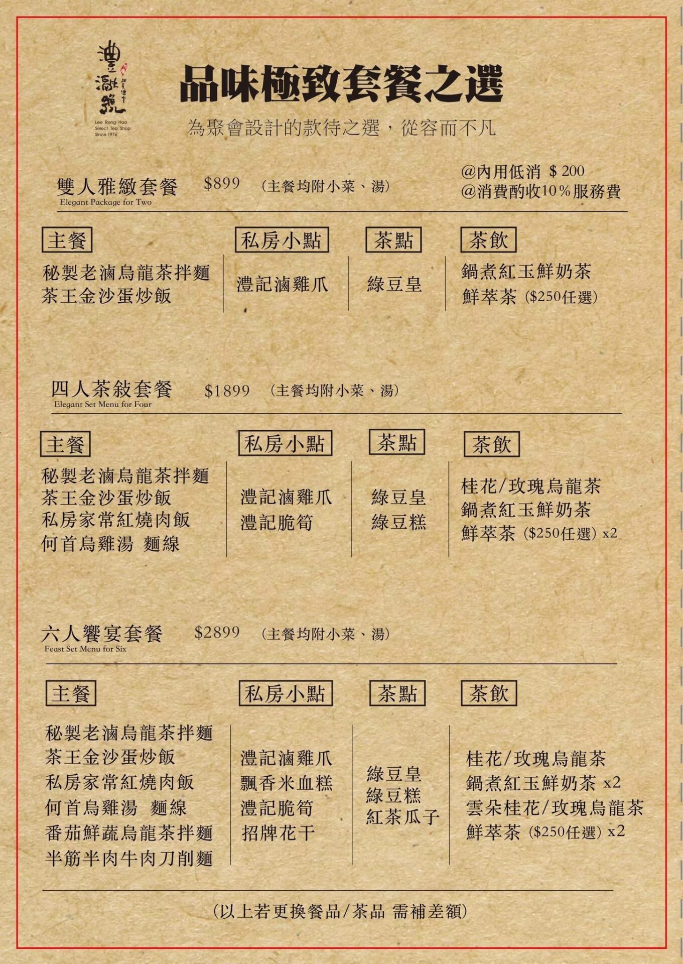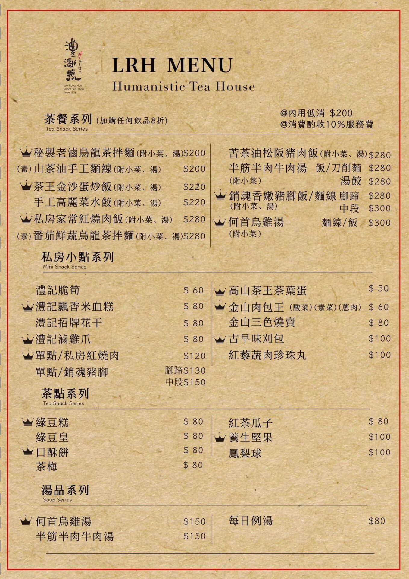 【澧瀜號 嚴選茶行/人文茶館】的菜單如上,包含茶餐、私房小點、茶點、湯品與各式茶飲,點茶餐的客人,能以8折的加購價點選任一飲品,亦有推出雙人、四人與六人套餐可供選擇。店家推薦的招牌菜色,亦有標註在菜單中,倘若平常習慣喝奶茶的客人,這裡也有鍋煮紅玉鮮奶茶可以品嘗,口味也是還滿不錯的。