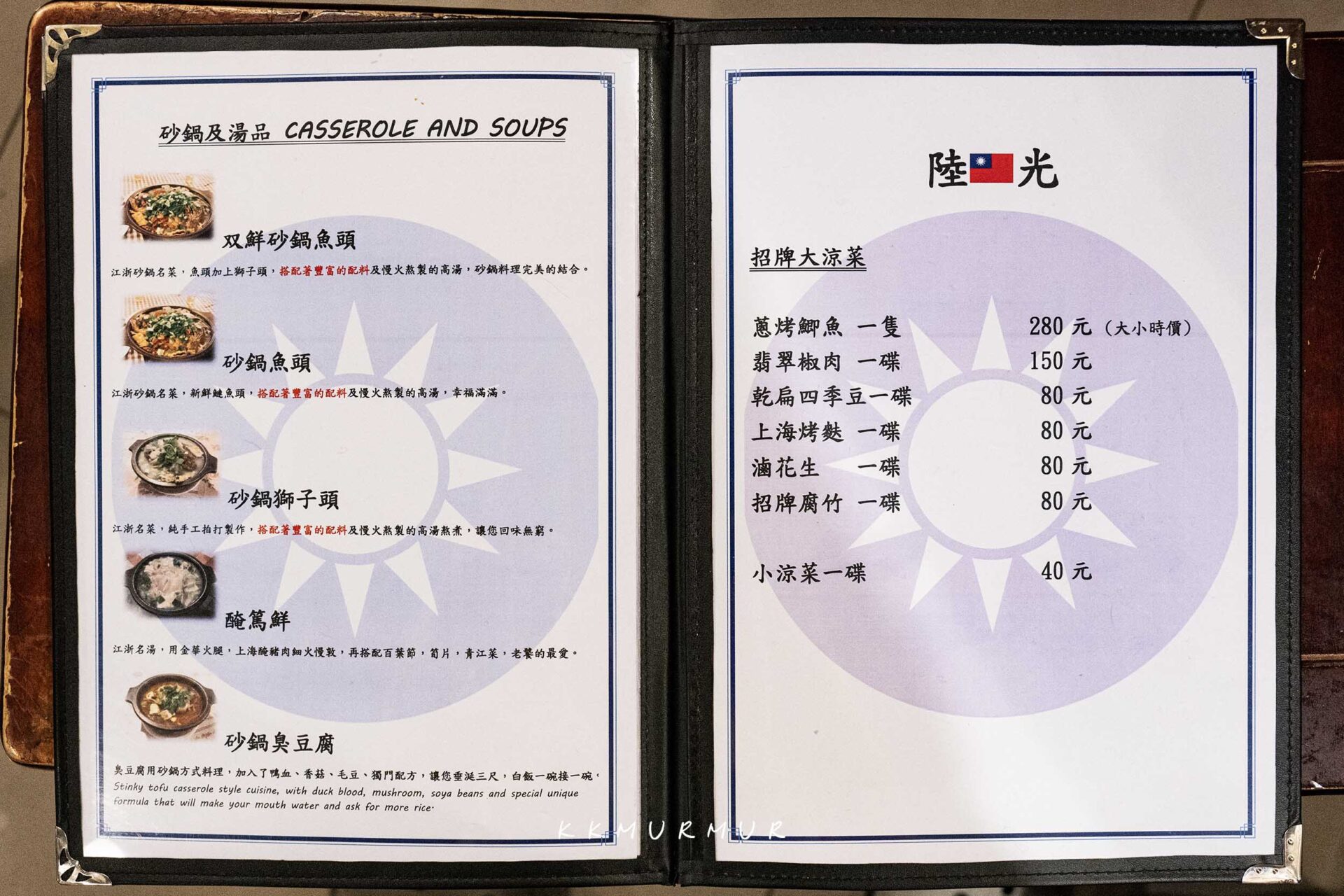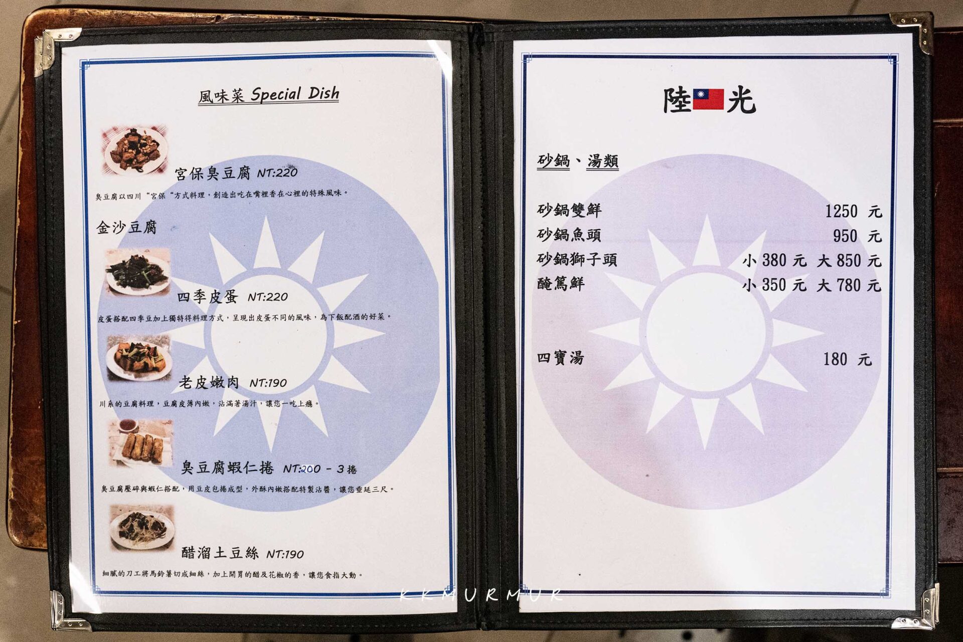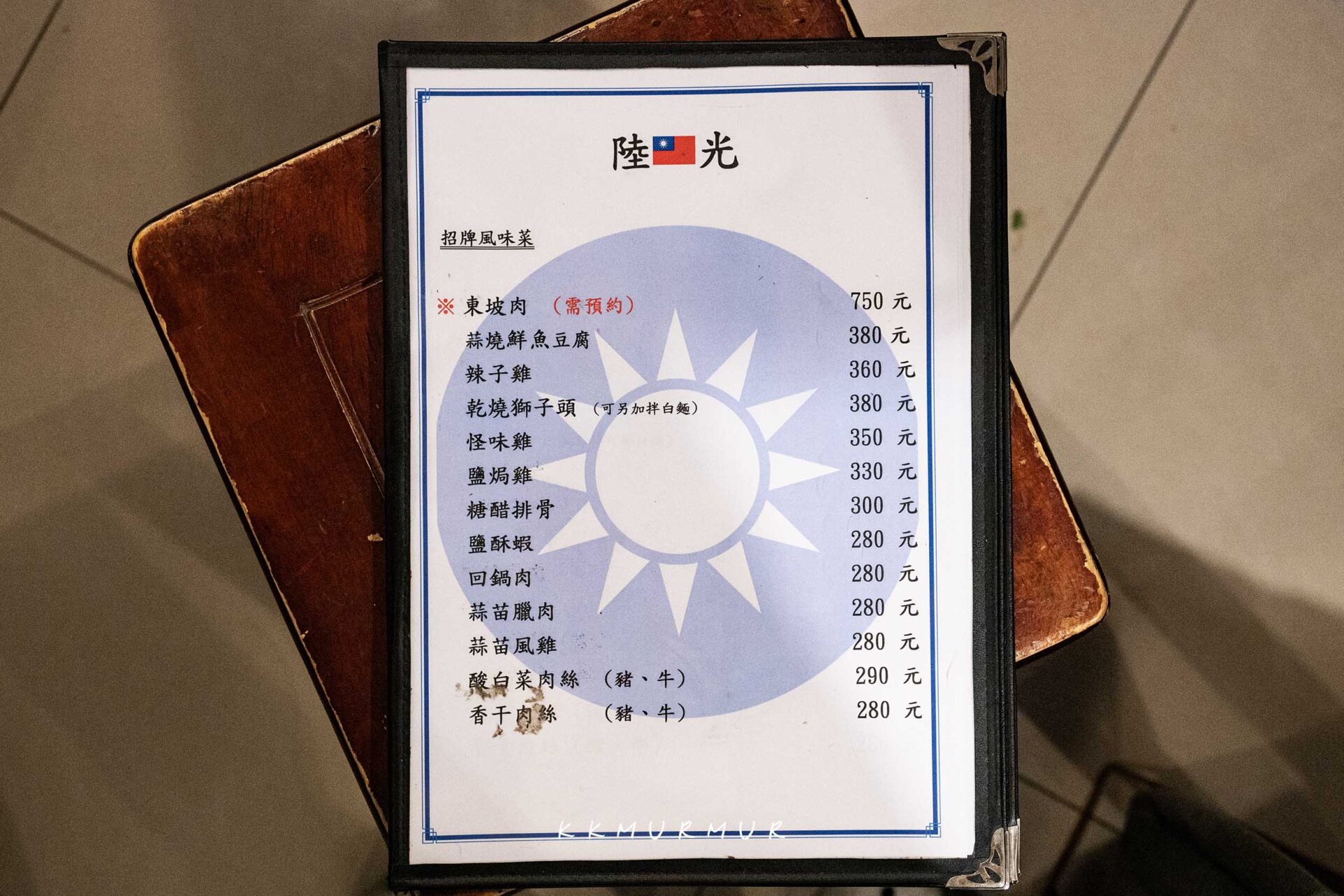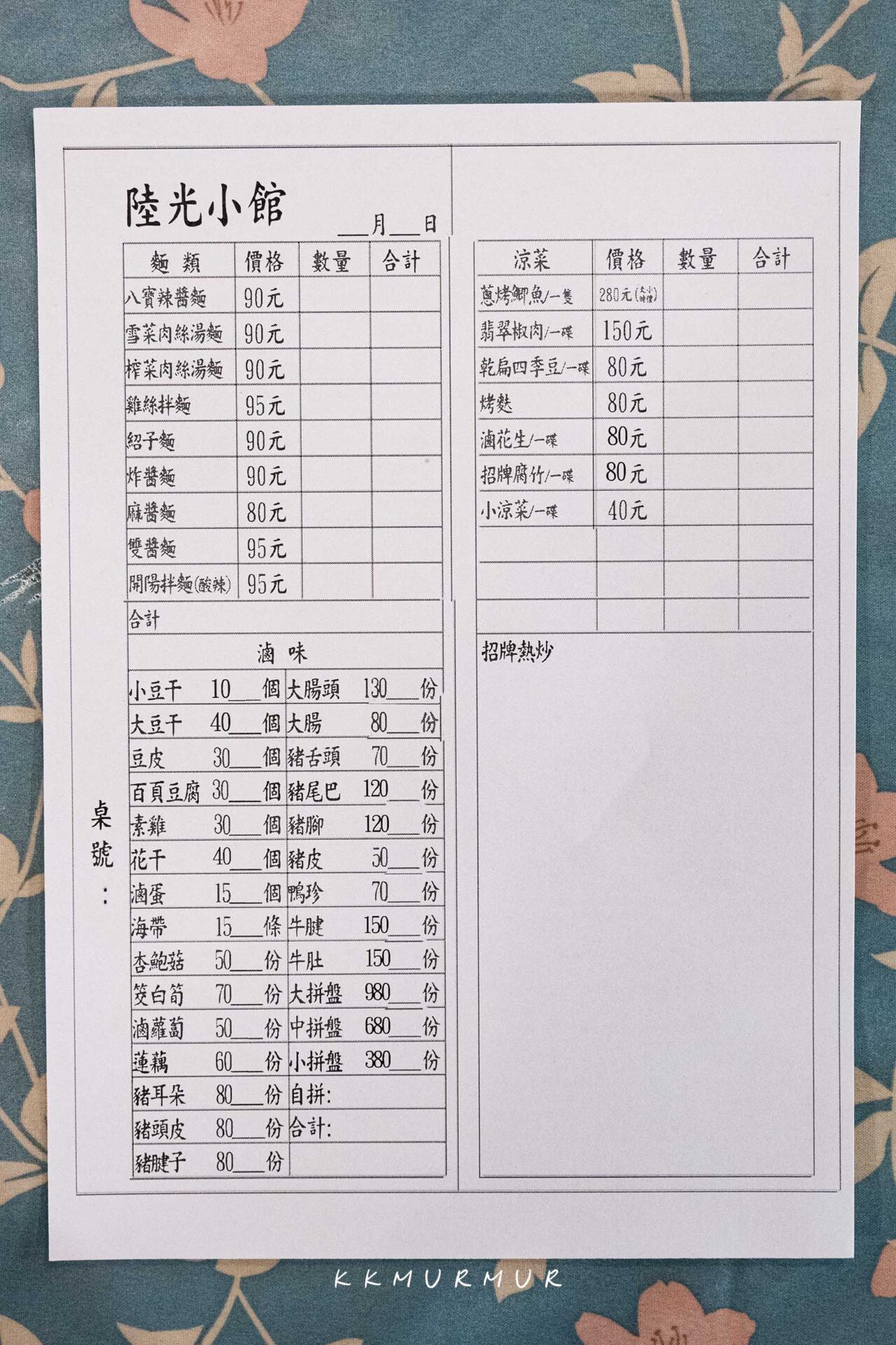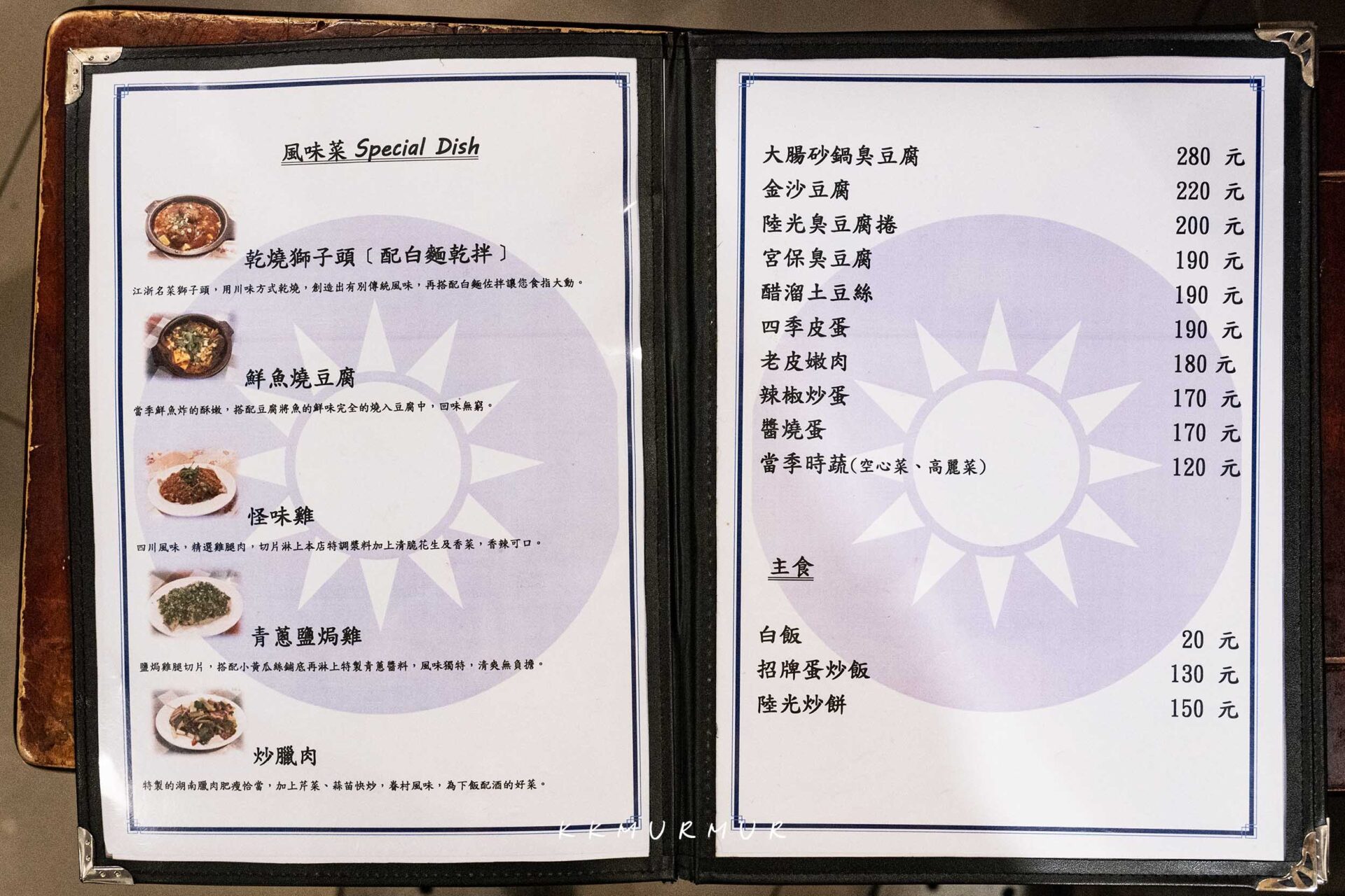 【陸光小館】的菜單,主要包含麵食類、滷味、涼菜類、熱炒/風味菜與湯品/砂鍋類,亦有一些其他主食的選項如蛋炒飯、炒餅等可以選擇。來過【陸光小館】滿多次,其中特別推薦他們的熱炒/風味菜類與滷味切盤!