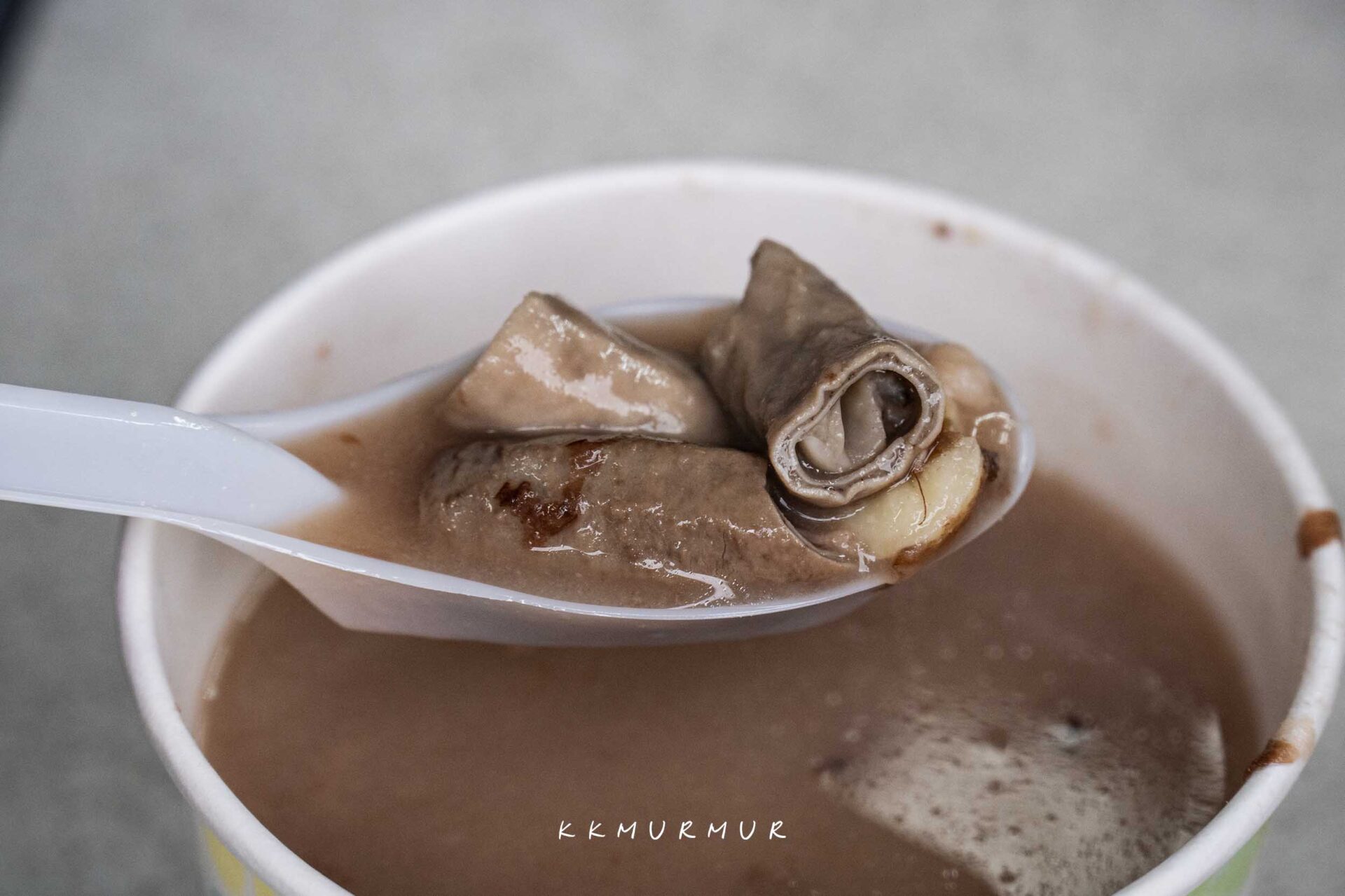 【四神湯】的價格比印象中有調漲了些,湯頭是帶點藕色的外觀,喝起來有著藥膳與米酒香氣,並帶點沙沙的質地口感,整體風味屬性偏濃厚的風格。蓮子、薏仁與大腸的量還算多,大腸也處理得不錯,我是滿喜歡的,但若是平常偏好就爽鮮風格的人,可能會比較不習慣。若是不想加酒,也可以提前跟老闆說喔!