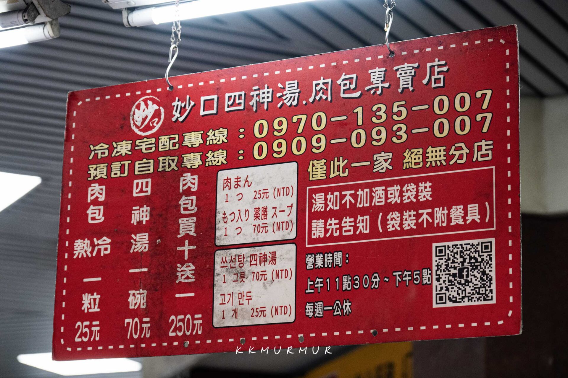 【妙口四神湯肉包】的菜單如上,肉包為$25/顆,四神湯$70/碗。肉包買十送一,四神湯若不加酒或袋裝,可以在點餐時跟服務人員告知哦!