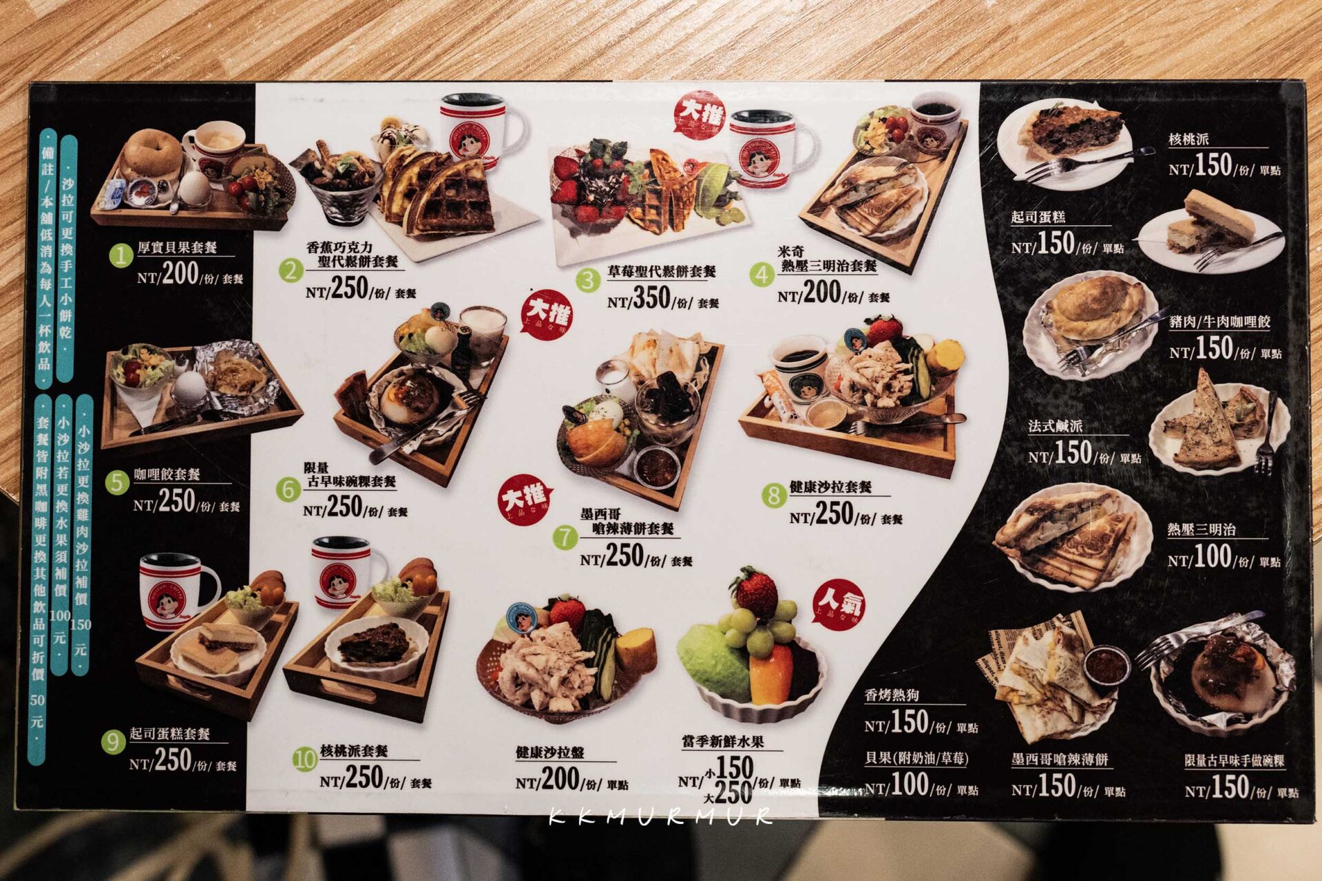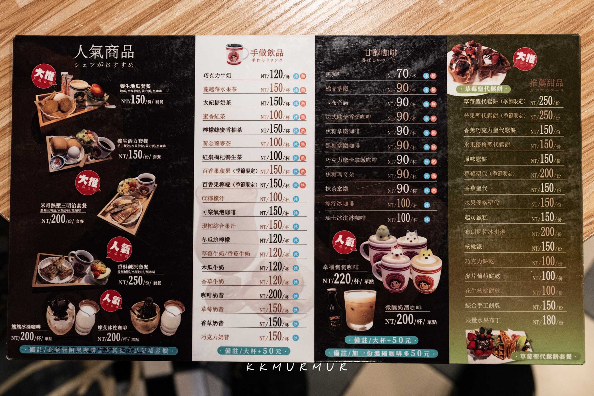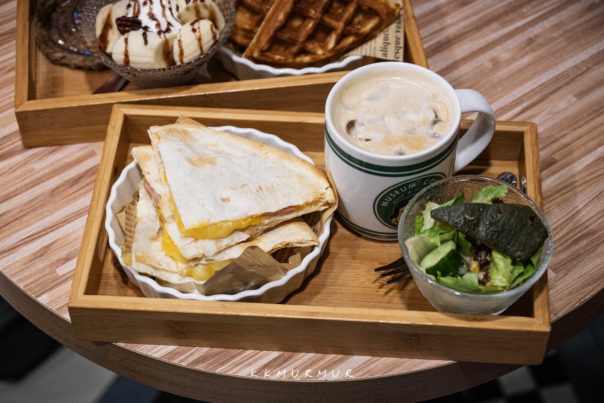 【Museum Coffee 50年代博物館咖啡】的菜單如上,食物部分包含一些鹹食、輕食、鬆餅套餐等選項,還有如碗粿、墨西哥薄餅等等可以選擇。飲品部分選項滿多的,舉凡咖啡、茶與各式軟性飲料都一應俱全,各個餐點的價格我覺得都挺實惠親民的,特別是店址又在大安區,這般價格更顯可貴!
