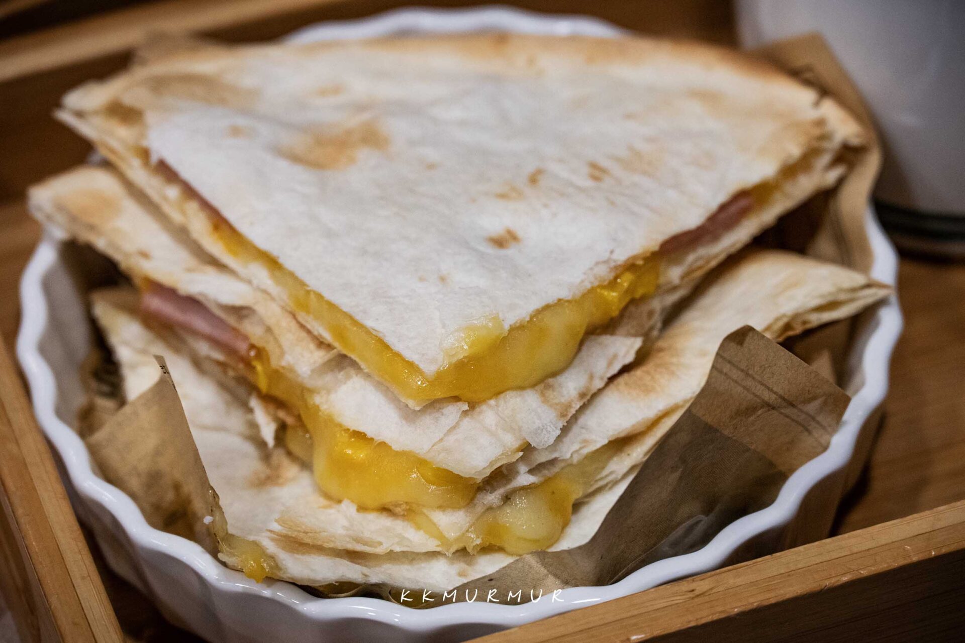 沒吃午餐所以先點個鹹食【墨西哥嗆辣薄餅套餐】,裡面夾入了起司、玉米與火腿,辣度在點餐時可以選擇,小辣其實就有點辣度了,整體吃起來挺涮嘴的。沙拉部分醬體是胡麻醬,食材本身新鮮度也是沒問題的。