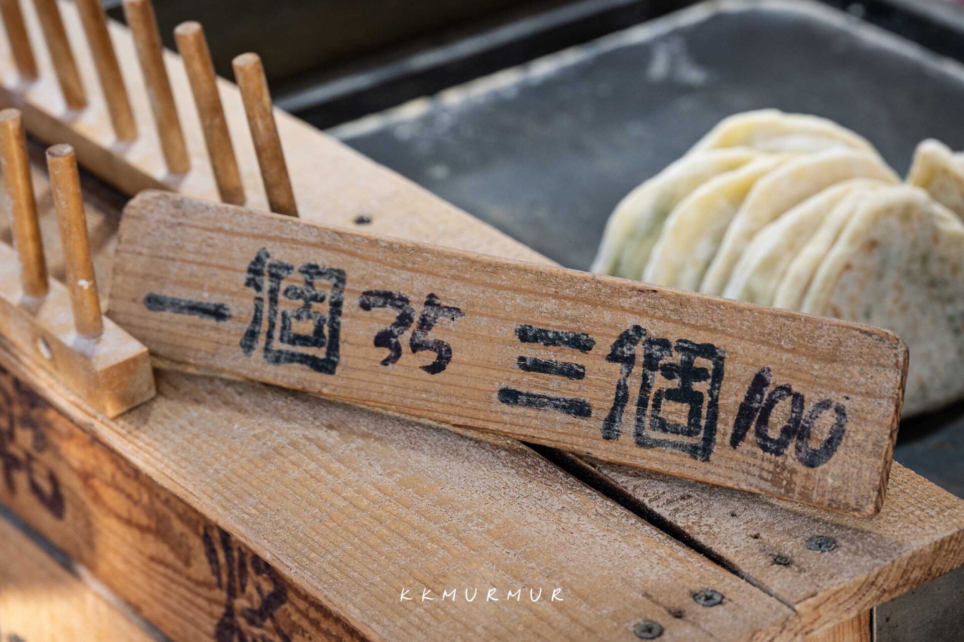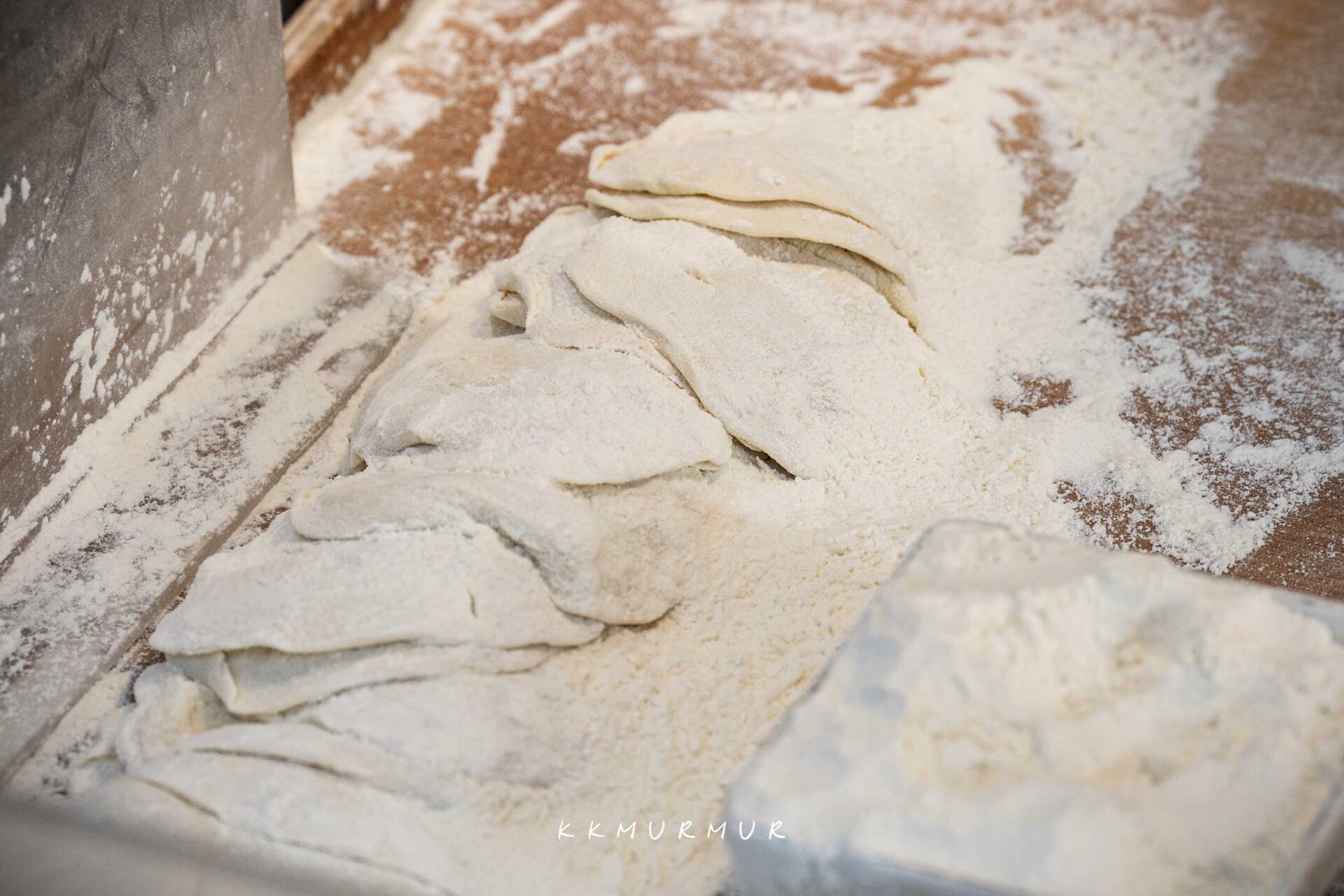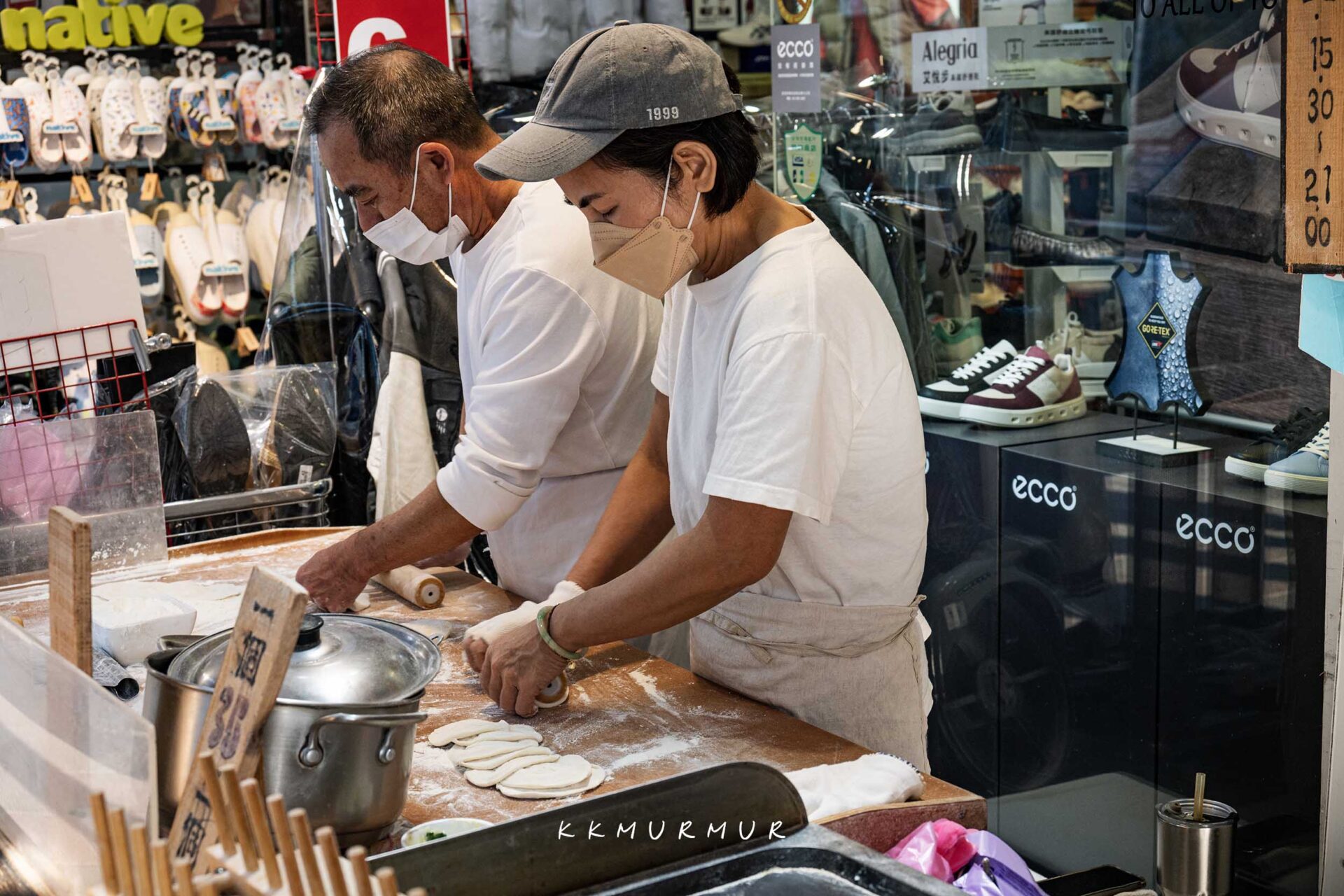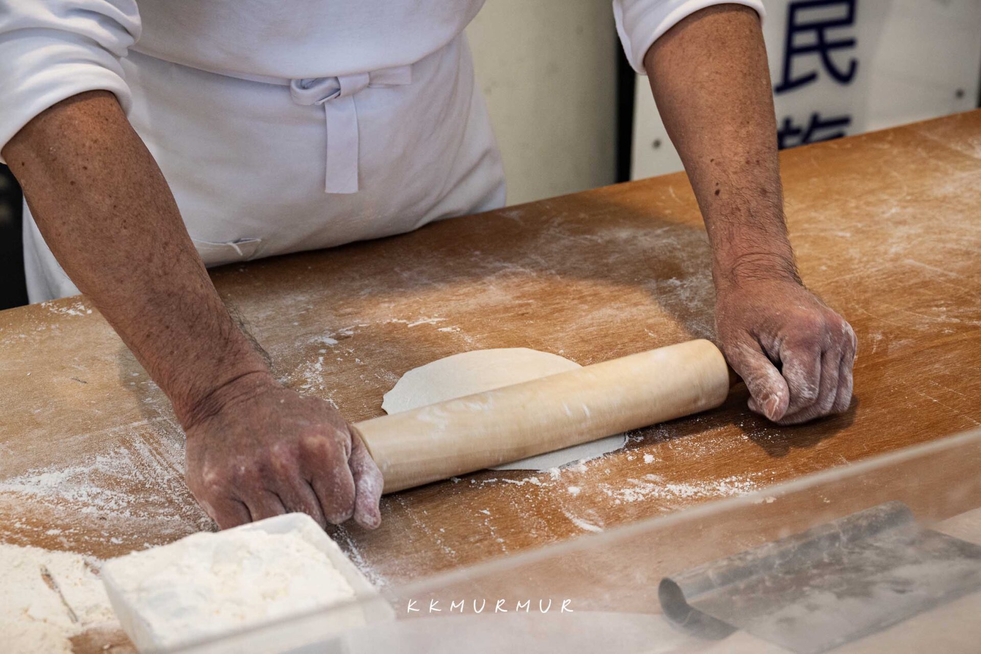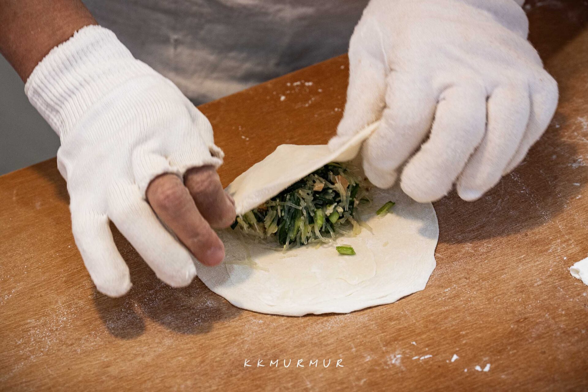 老闆熟練地把醒好的麵糰弄成小塊,撒點麵粉不黏手,經過熟練、俐落的處理後,一下子就出了一張薄皮。接著用碗裝盛拌好的餡料、對折成半月形,整顆看起來蠻乾淨又可愛的。
