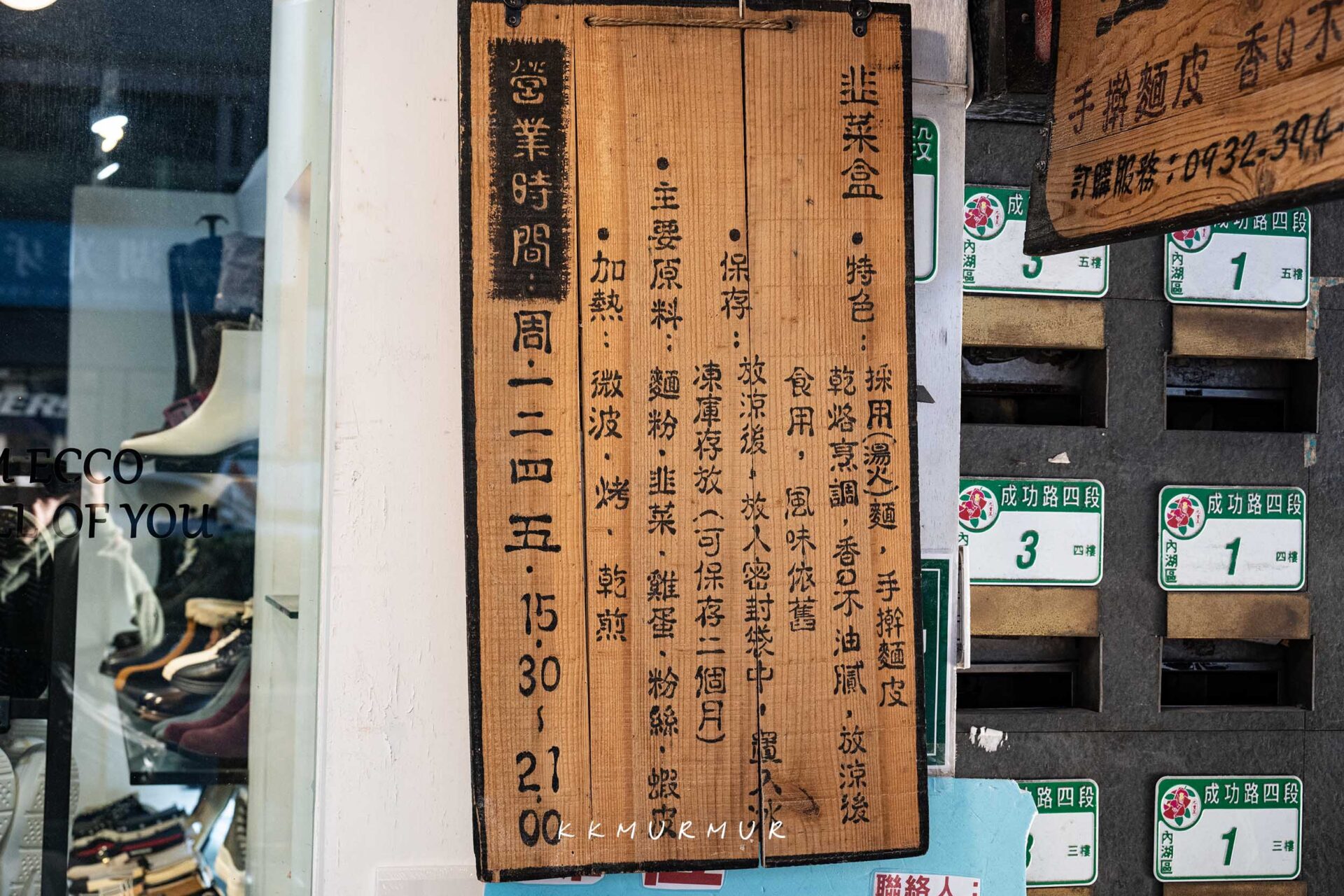 【乾烙韭菜盒】的營業資訊、特色、保存方式、原料與加熱方式,都有清楚標註在店面後方的牌子上,若有需要的客人可以參考或拍起來,回家方便覆熱食用哦!