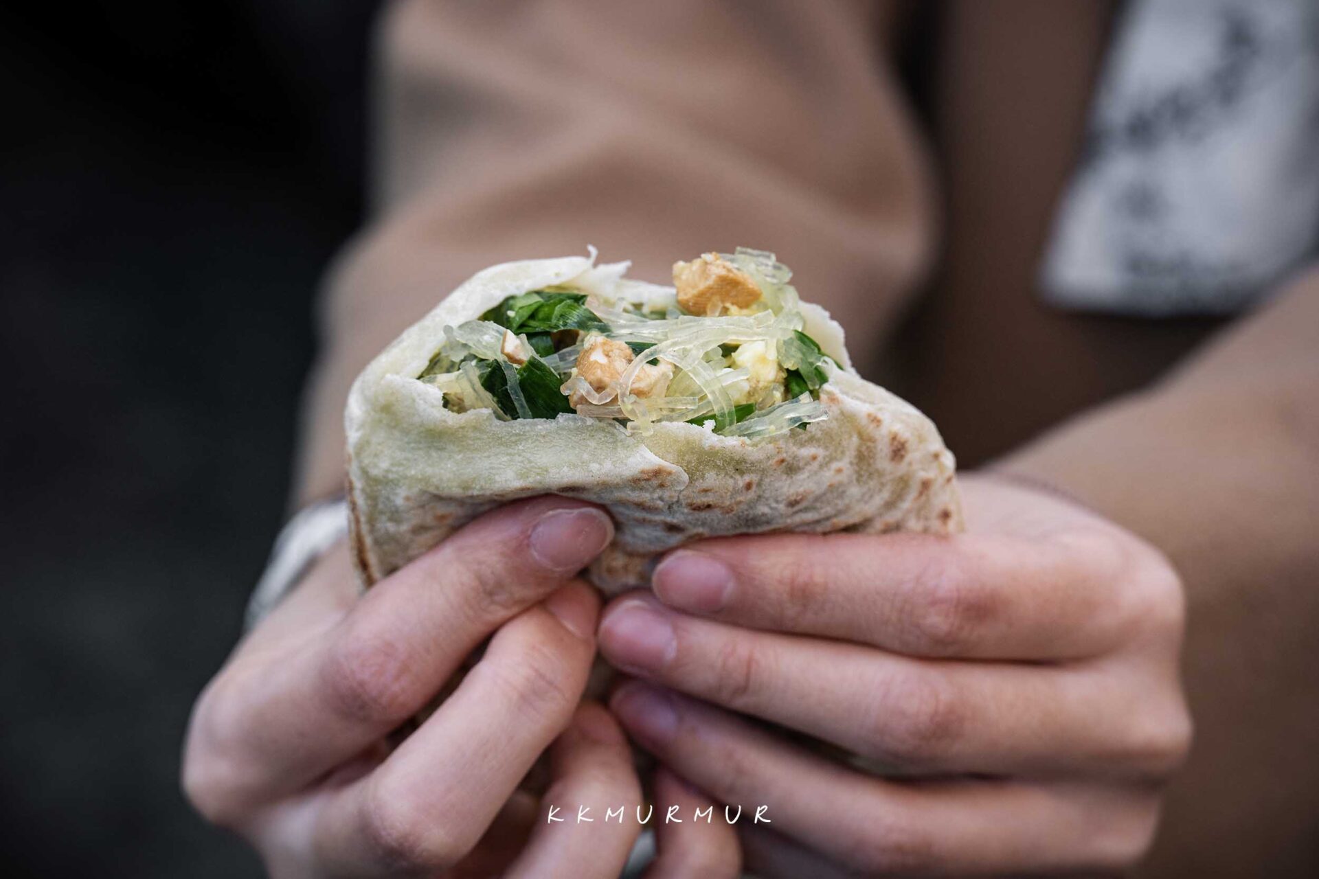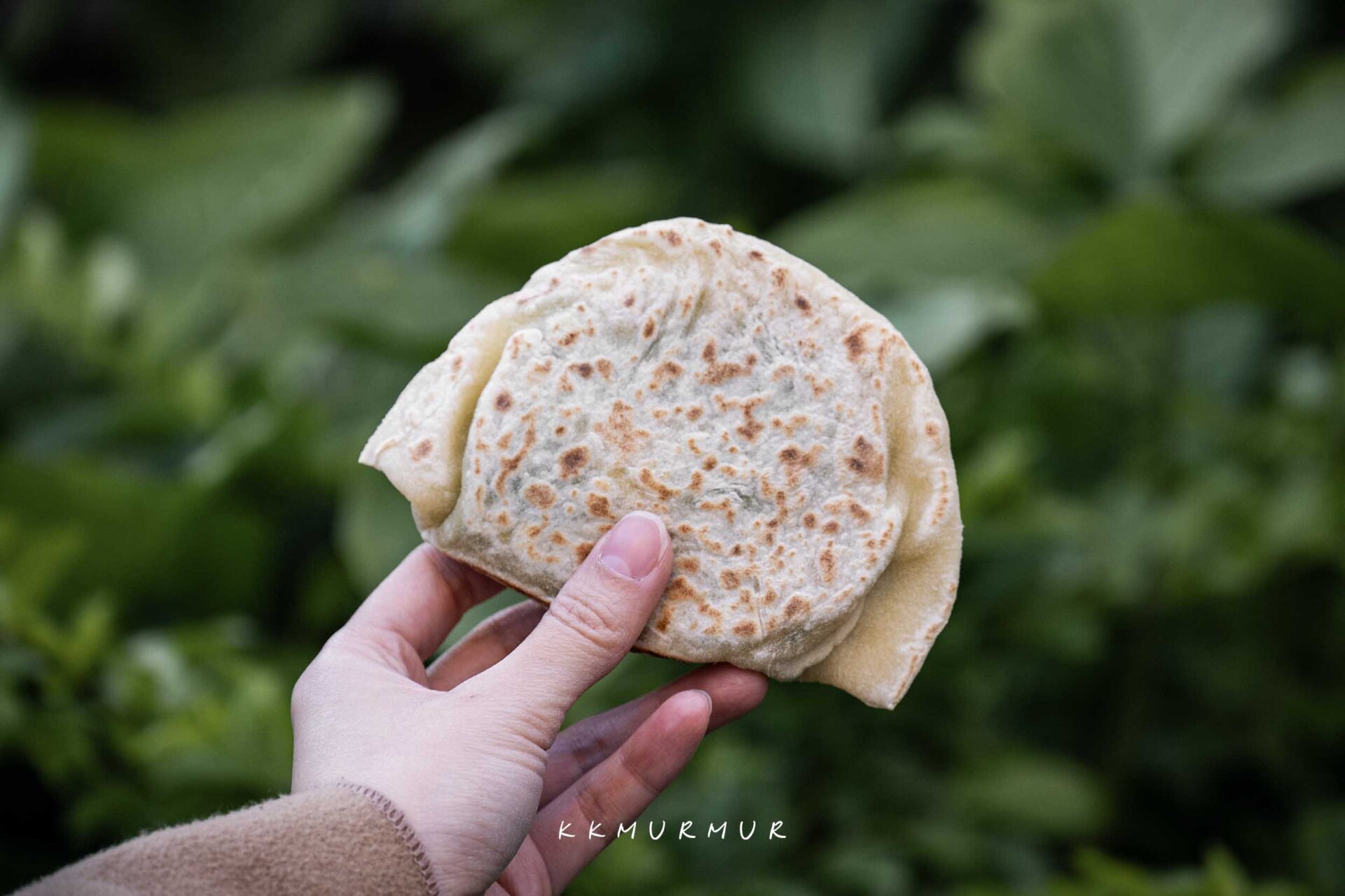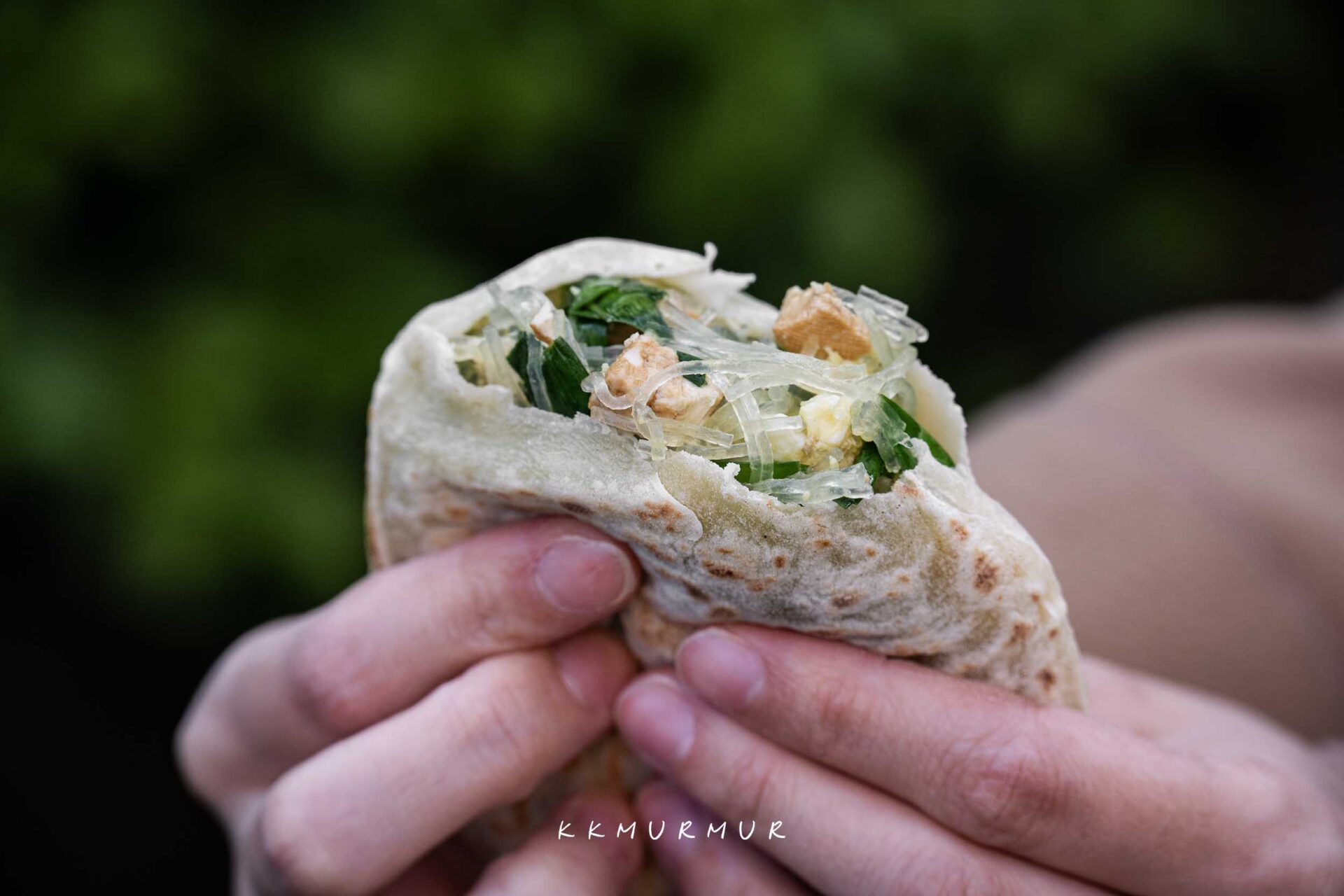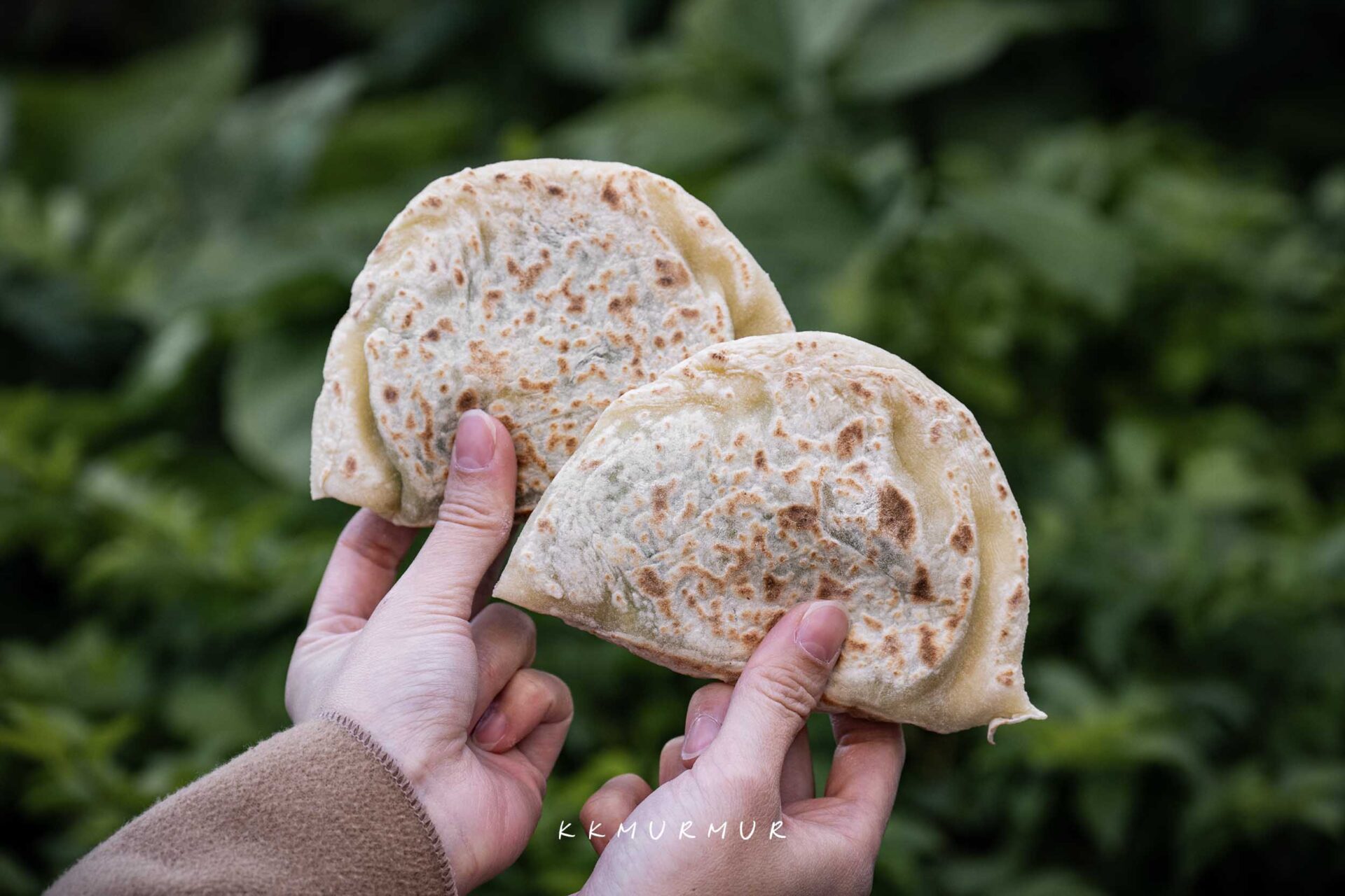 現擀的餅皮口感不錯,隨著咀嚼能感受到迷人麵香;餡料包含韭菜、粉絲、蛋與蝦米,韭菜的香氣不會太強烈或嗆辣,蝦米的微微鹹香與鮮美起到很好的提味作用,粉絲的占比不少,讓口感多了幾分溫潤滑順的質地,吃起來是很乾淨順口的味道,也因為是乾烙的,所以絲毫不會感到油膩。