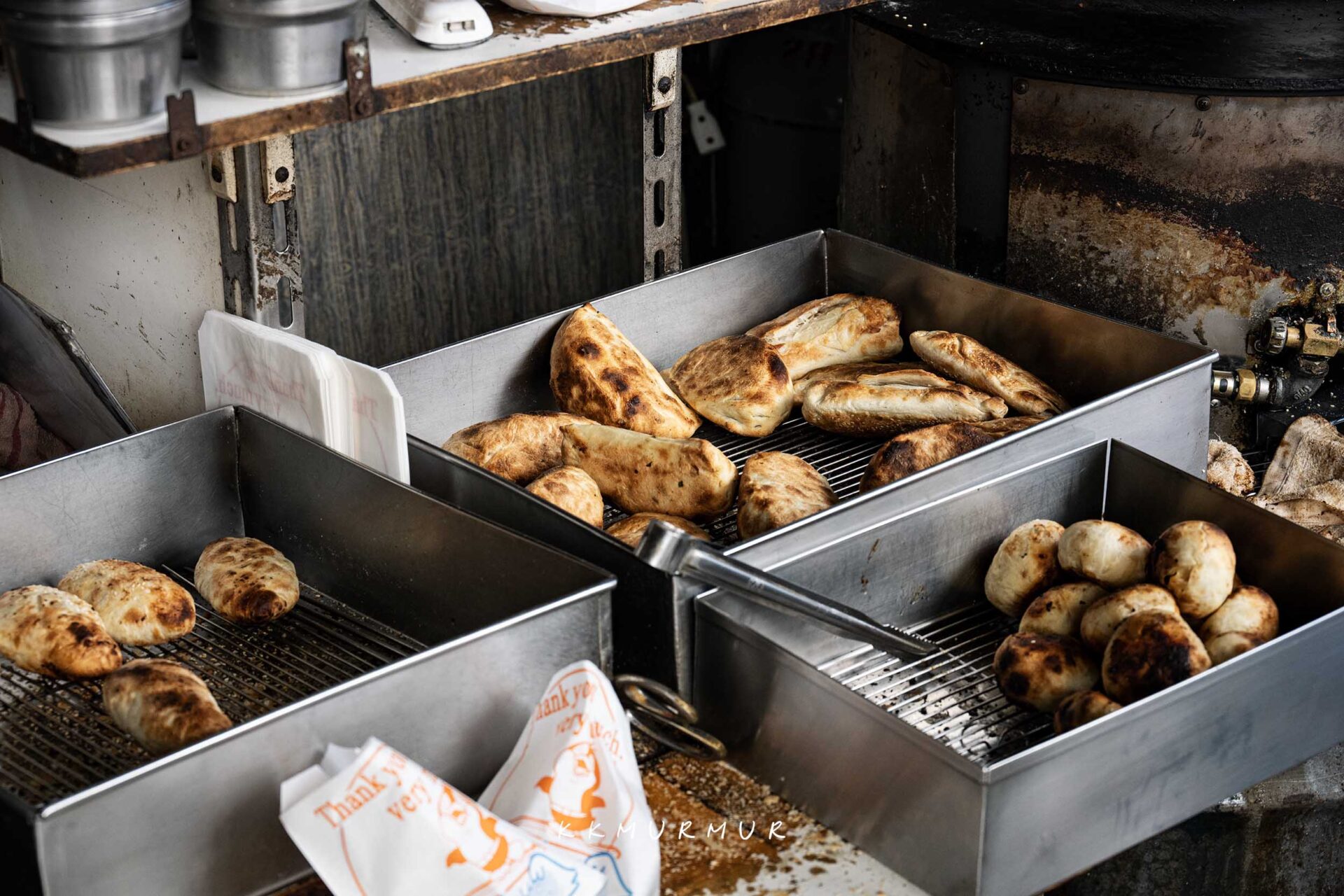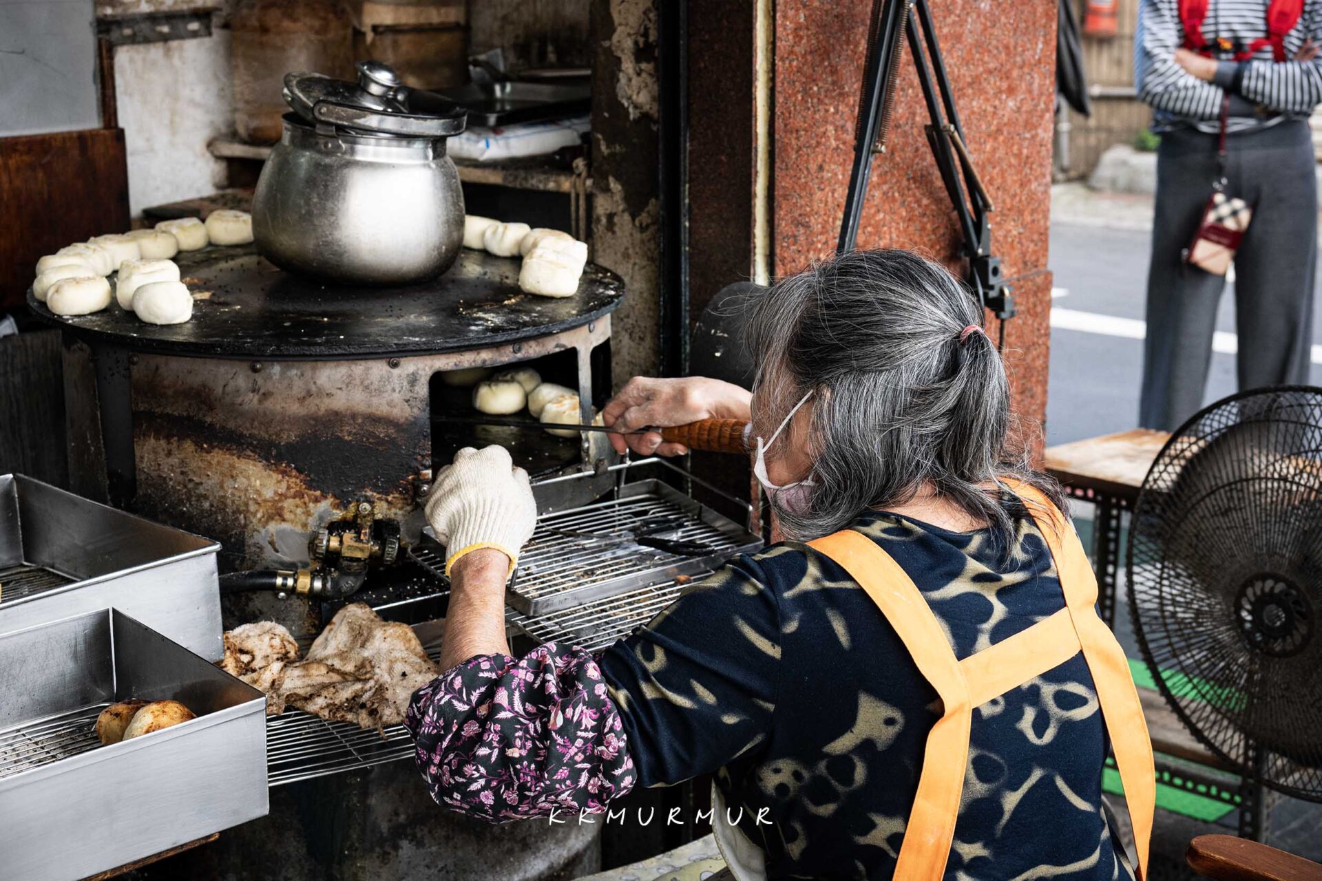 【青島豆漿店】共有兩座爐烤台,彼此分工流暢,阿嬤負責製作甜餅與肉餅,順帶一提那肉餅還真的是很讚。阿嬤會親自手工桿麵,並將麵團揉至球狀,接著排在爐上醒一下再下餅烘烤。
