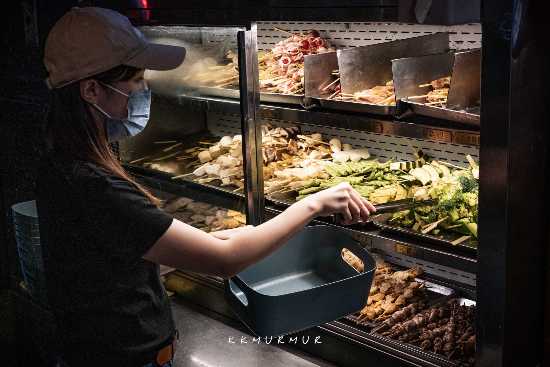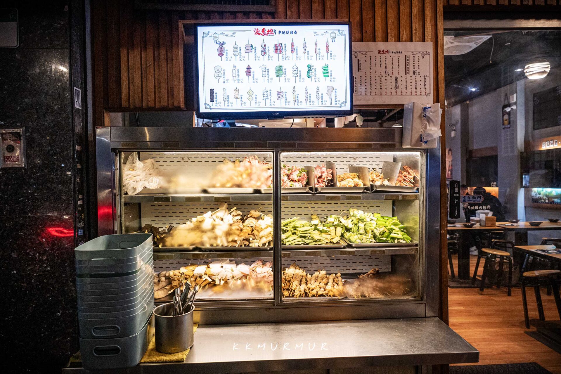 【柒息地串燒居酒屋士林店】的串烤櫃在店門旁邊,一旁附有食物夾與籃子,品項豐富多元,價格也都有在螢幕上清楚標示。