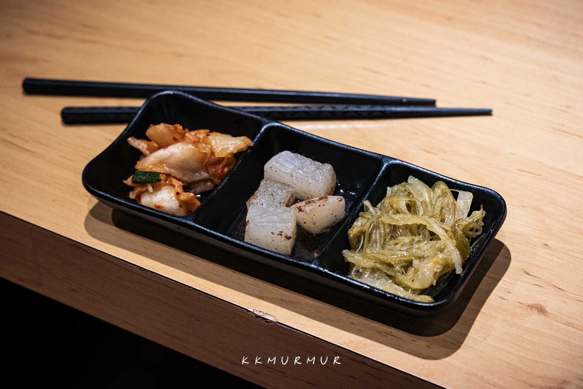 內用有招待小菜,醃蘿蔔跟海帶芽帶點酸甜與脆口,滿開胃的,泡菜微辣帶著辛香,一樣是很涮嘴。
