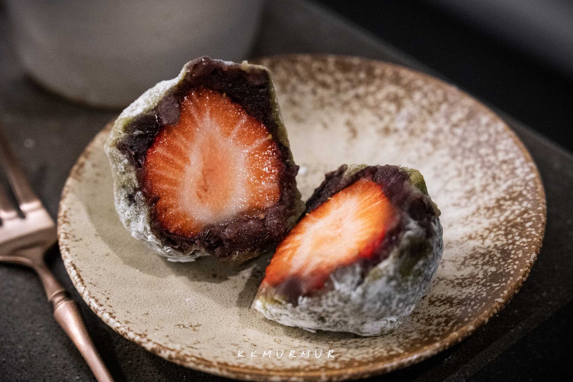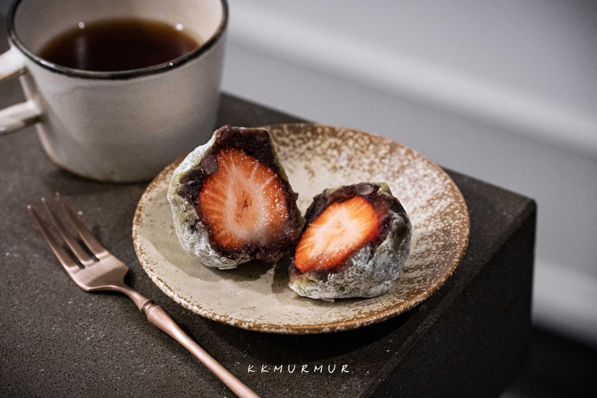 除了草莓大福,我們還訂了一顆【抹茶草莓大福】,抹茶外衣的抹茶香氣我覺得不是太鮮明、較為雅緻,一樣是皮薄又適口,那帶有些酸度的草莓,交織香甜的紅豆沙,搭配起來還是很迷人的。但若是單純想吃草莓大福的人,覺得可以直接選草莓大福就很讚了,彼此的差異我覺得沒有到很明顯!