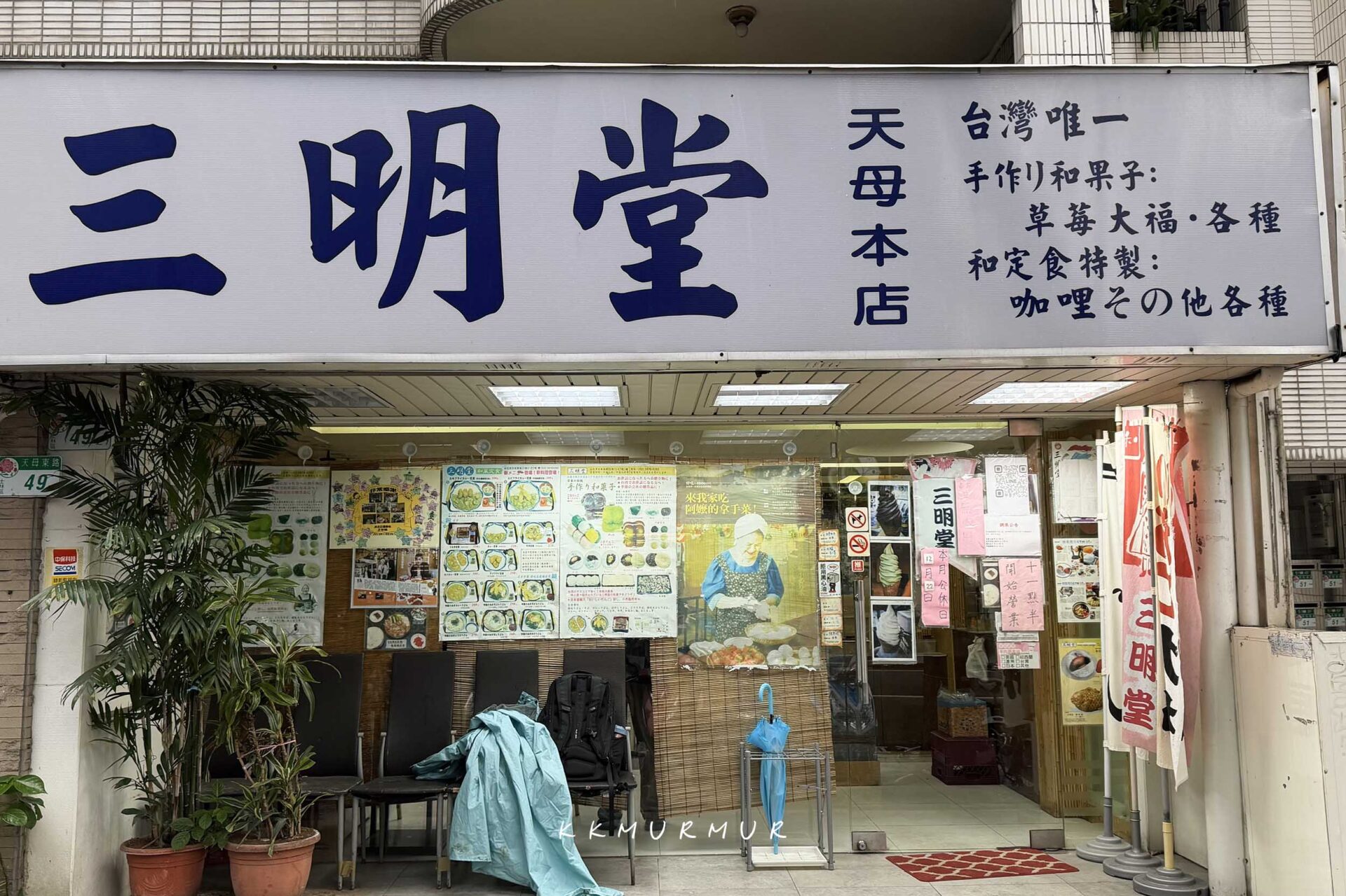 【三明堂】早年是家可以內用的日式家庭食堂,提供烏龍麵、壽喜燒、咖哩飯等各式定食與家常菜色,乘載了許多天母人的美味記憶、伴著許多人一同成長。現在轉型成僅供外帶餐點,草莓季時更是只專注在草莓大福與和菓子,而不另外供應鹹食。