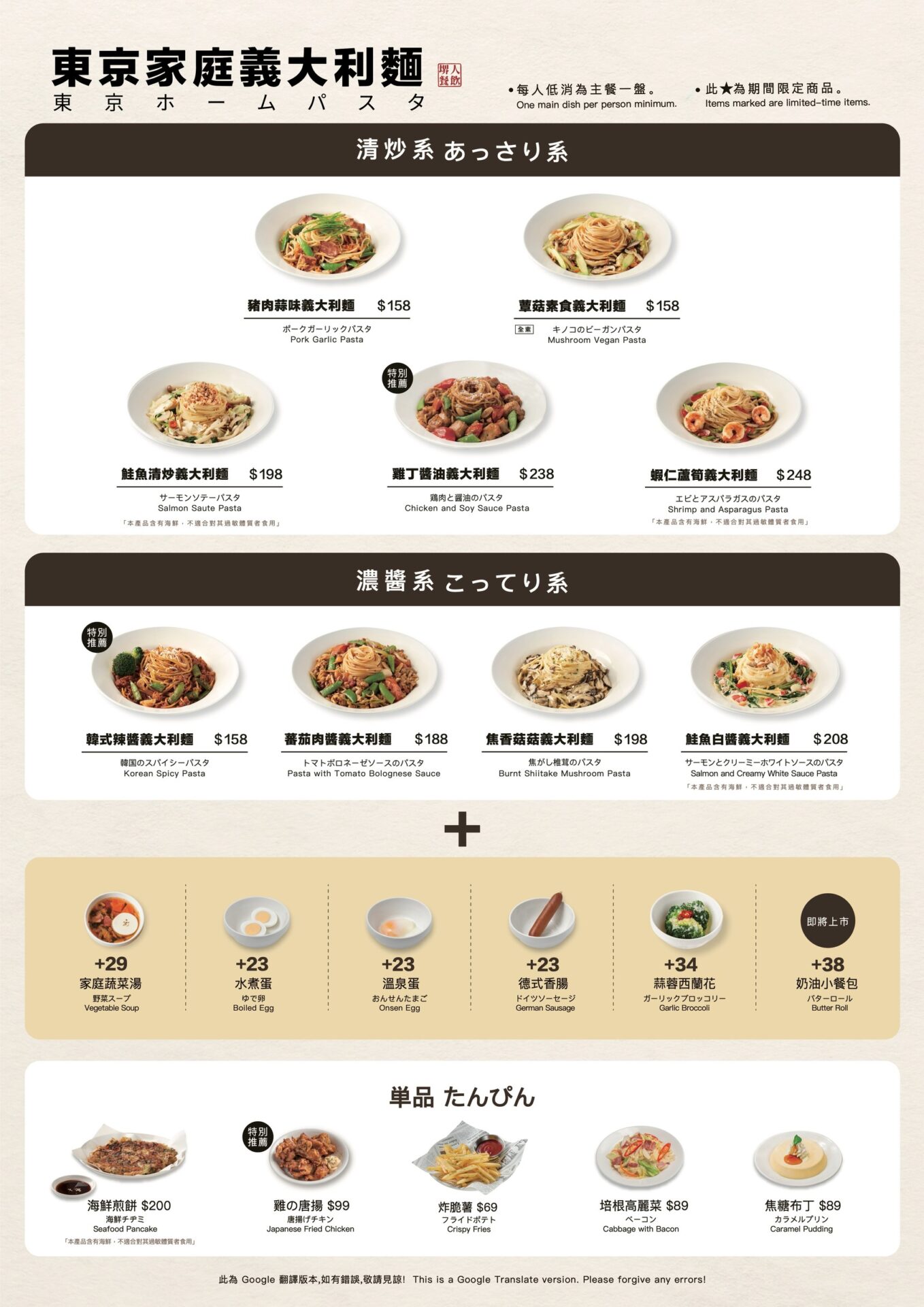 【東京家庭義大利麵】的菜單如上,義大利麵有分為【清炒系】與【濃醬系】,亦會不定期推出季節限定的菜單,讓每次到訪都有不同的選擇與新鮮感。除了義大利麵外,海鮮煎餅與唐揚雞也是許多人來此都會點的人氣品項。價格上,義大利麵普遍落在 $158-$248 之間,對應其優異的品質與用餐空間,整體CP值很不錯,無論是與親友相約,或是日常一人來享用,都相當的推薦且合適!