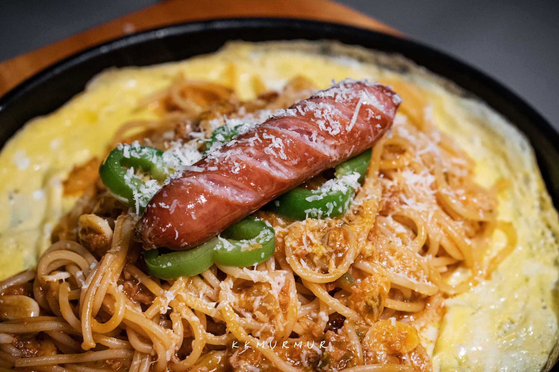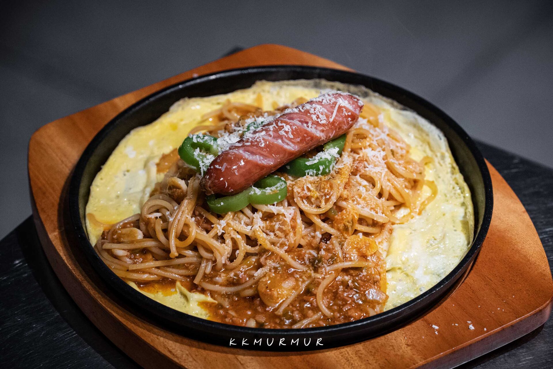 【鐵板蛋包拿坡里義大利麵】是季節限定的菜色,看著覺得很特別就點了一份。是以整條香腸、青椒片點綴著拿坡里義大利麵,底部鋪上薄煎蛋增添香氣,整體上桌的視覺挺吸引眼球的。