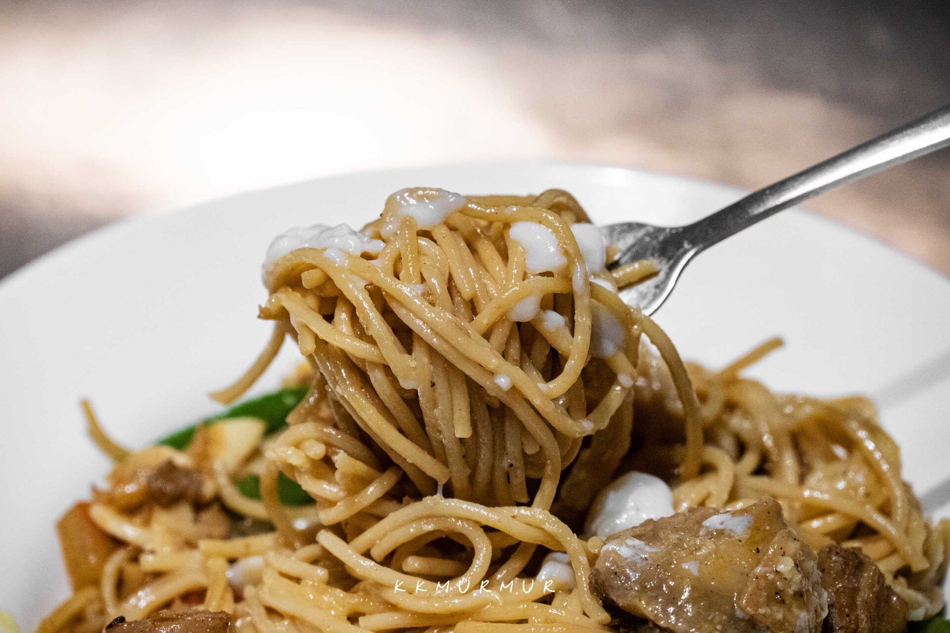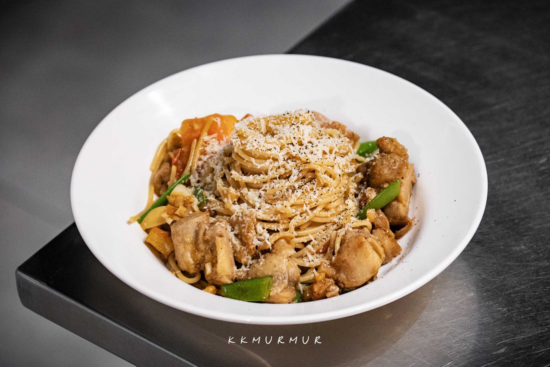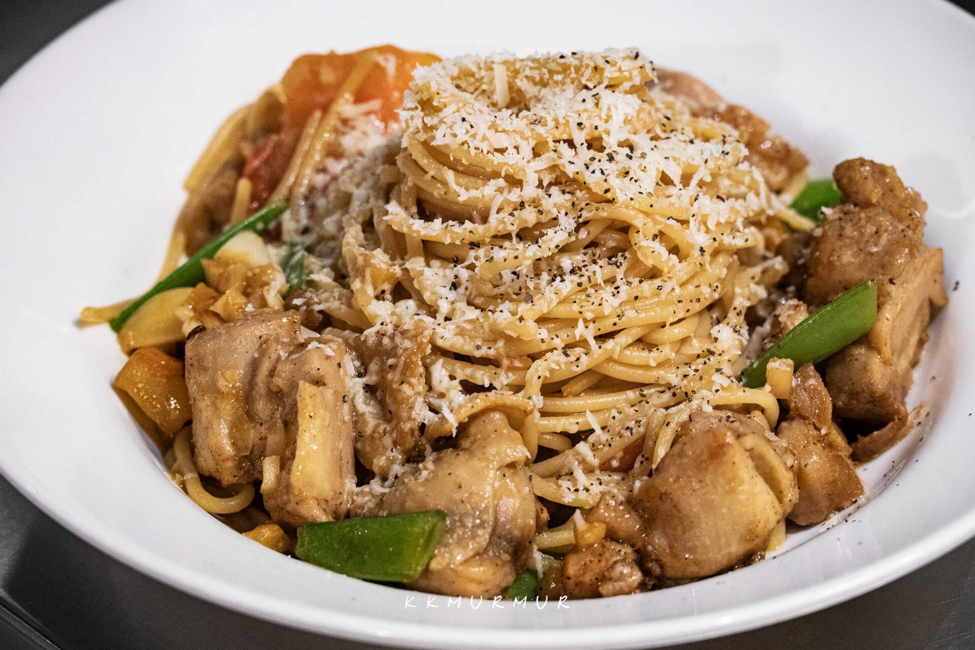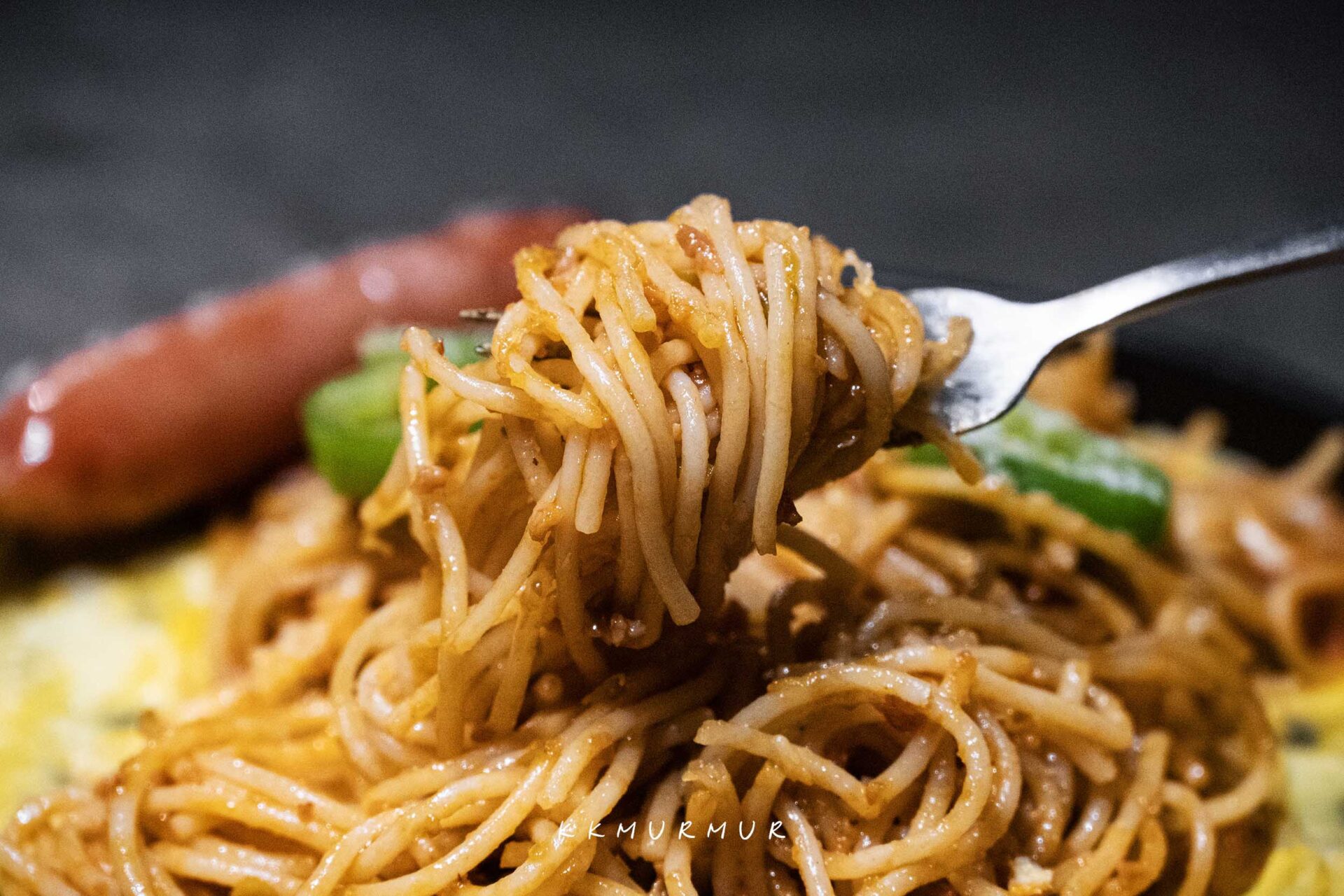 日式拿坡里義大利麵與義式番茄醬體的口味不一樣,整體風味是酸甜濃郁的類型,並交織著鮮明的青椒香氣,但在經過恰到好處的處理與平衡後,讓即便是沒那麼常吃青椒的我,都覺得很優秀,不但讓菜色更不容易感到膩口外,更賦予了更多層次的風味體驗,乳化也做得滿好的,醬汁緊密扒在麵條上,好吃。